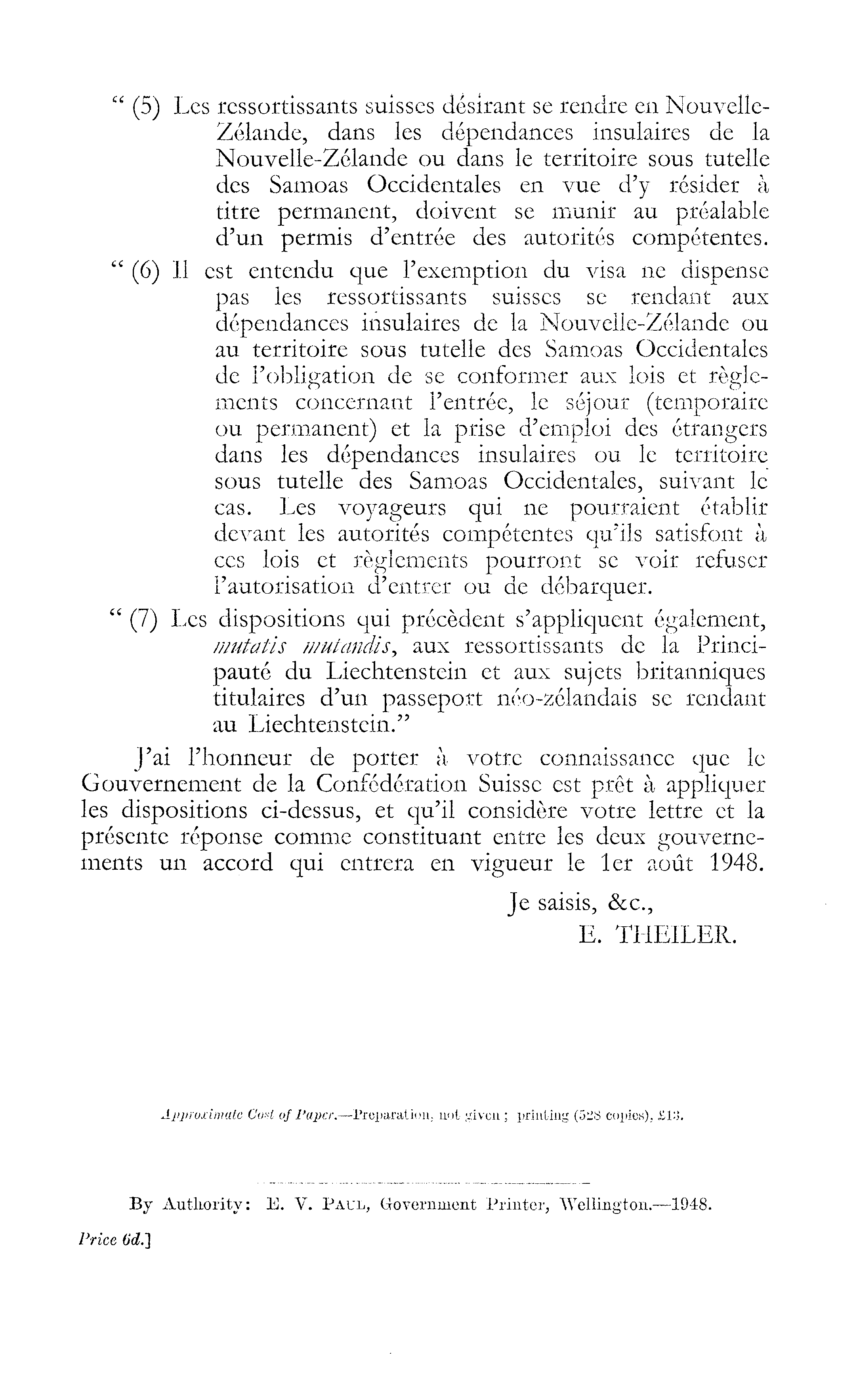 " (5) Les ressortissants suisses desirant se tendre en NouvelleZelande, dans les dependances insulaires de la Nouvelle-Zelande ou dans le territoire sous tutelle des Samoas Occidentales en vue d'y resider a titre permanent, doivent se munir au prealable d'un permis d'entree des autorites competentes. " (6) 11 est entendu que I'exemption du visa ne dispense pas les ressortissants suisses se rendant aux dependances insulaires de la Nouvelle-Zelande ou au territoire sous tutelle des Samoas Occidentales de I'obligation de se conformer aux lois et reglements concernant i'entree, le sejour (temporaire ou permanent) et la prise d'emploi des etrangers dans les dependances insulaires ou le territoire sous tutelle des Samoas Occidentales, suivant le cas. Les voyageurs qui ne pourraient etablir devant les autorites competentes qu'ils satisfont a ces lois et reglements pourront se voir refuser Pautorisation d'entrer ou de debarquer. " (7) Les dispositions qui precedent s'appliquent egalement, mutatis mutandis, aux ressortissants de la Principaute du Liechtenstein et aux sujets britanniques titulaires d'un passeport neo-zelandais se rendant au Liechtenstein." J'ai l'honneur de porter a votre connaissance que le Gouvernement de la Confederation Suisse est pret a appliquer les dispositions ci-dessus, et qu'il considere votre lettre et la presente reponse comme constituant entre les deux gouverneinents un accord qui entrera en vigueur le ler aout 1948. Je saisis, &c., E. THEILER. Approximate Cost of Paper.—Preparation, not given; printing (528 copies), £l3. By Authority: E. V. Paul, Government Printer, Wellington. —1948. Price 6d.~]