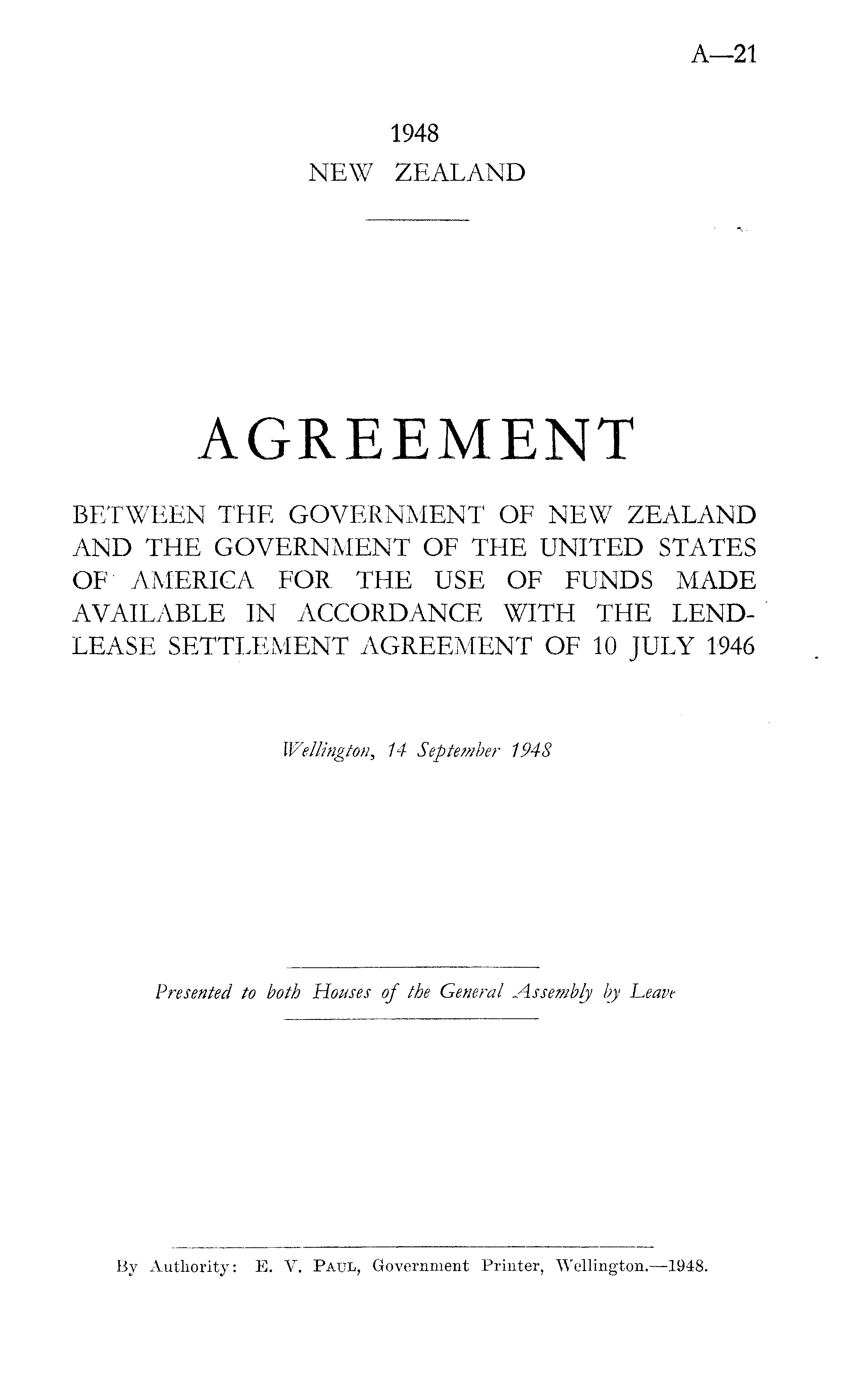 AGREEMENT BETWEEN THE GOVERNMENT OF NEW ZEALAND AND THE GOVERNMENT OF THE UNITED STATES OF AMERICA FOR THE USE OF FUNDS MADE AVAILABLE IN ACCORDANCE WITH THE LENDLEASE SETTLEMENT AGREEMENT OF 10 JULY 1946 Wellington, 14 September 1948