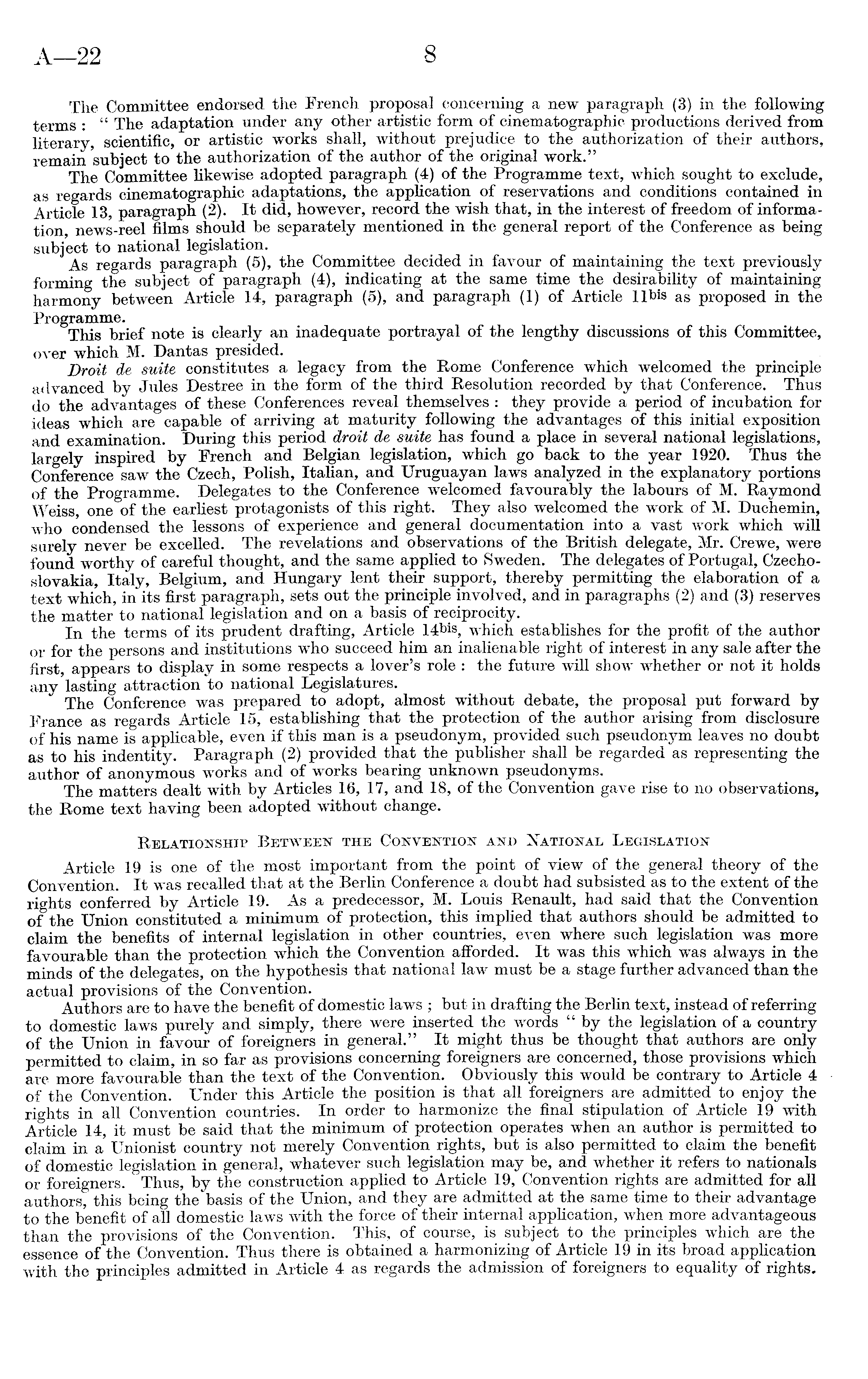 The Committee endorsed the French proposal concerning a new paragraph (3) in the following terms : " The adaptation under any other artistic form of cinematographic productions derived from literary, scientific, or artistic works shall, without prejudice to the authorization of their authors, remain subject to the authorization of the author of the original work." The Committee likewise adopted paragraph (4) of the Programme text, which sought to exclude, as regards cinematographic adaptations, the application of reservations and conditions contained in Article 13, paragraph (2). It did, however, record the wish that, in the interest of freedom of information news-reel films should be separately mentioned in the general report of the Conference as being subject to national legislation. As regards paragraph (5), the Committee decided in favour of maintaining the text previously forming the subject of paragraph (4), indicating at the same time the desirability of maintaining harmony between Article 14, paragraph (5), and paragraph (1) of Article llWs as proposed in the Programme. This brief note is clearly an inadequate portrayal of the lengthy discussions of this Committee, over which M. Dantas presided. Droit de suite constitutes a legacy from the Rome Conference which welcomed the principle advanced by Jules Destree in the form of the third Resolution recorded by that Conference. Thus do the advantages of these Conferences reveal themselves : they provide a period of incubation for ideas which are capable of arriving at maturity following the advantages of this initial exposition and examination. During this period droit de suite has found a place in several national legislations, largely inspired by French and Belgian legislation, which go back to the year 1920. Thus the Conference saw the Czech, Polish, Italian, and Uruguayan laws analyzed in the explanatory portions of the Programme. Delegates to the Conference welcomed favourably the labours of M. Raymond Weiss, one of the earliest protagonists of this right. They also welcomed the work of M. Duchemin, who condensed the lessons of experience and general documentation into a vast work which will surely never be excelled. The revelations and observations of the British delegate, Mr. Crewe, were found worthy of careful thought, and the same applied to Sweden. The delegates of Portugal, Czechoslovakia, Italy, Belgium, and Hungary lent their support, thereby permitting the elaboration of a text which, in its first paragraph, sets out the principle involved, and in paragraphs (2) and (3) reserves the matter to national legislation and on a basis of reciprocity. In the terms of its prudent drafting, Article 14Ws, which establishes for the profit of the author or for the persons and institutions who succeed him an inalienable right of interest in any sale after the first, appears to display in some respects a lover's role : the future will show whether or not it holds any lasting attraction to national Legislatures. The Conference was prepared to adopt, almost without debate, the proposal put forward by France as regards Article 15, establishing that the protection of the author arising from disclosure of his name is applicable, even if this'man is a pseudonym, provided such pseudonym leaves no doubt as to his indentity. Paragraph (2) provided that the publisher shall be regarded as representing the author of anonymous works and of works bearing unknown pseudonyms. The matters dealt with by Articles 16, 17, and 18, of the Convention gave rise to no observations, the Rome text having been adopted without change. Relationship Between the Convention and National Legislation Article 19 is one of the most important from the point of view of the general theory of the Convention. It was recalled that at the Berlin Conference a doubt had subsisted as to the extent of the rights conferred by Article 19. As a predecessor, M. Louis Renault, had said that the Convention of the Union constituted a minimum of protection, this implied that authors should be admitted to claim the benefits of internal legislation in other countries, even where such legislation was more favourable than the protection which the Convention afforded. It was this which was always in the minds of the delegates, on the hypothesis that national law must be a stage further advanced than the actual provisions of the Convention. Authors are to have the benefit of domestic laws ; but in drafting the Berlin text, instead of referring to domestic laws purely and simply, there were inserted the words " by the legislation of a country of the Union in favour of foreigners in general." It might thus be thought that authors are only permitted to claim, in so far as provisions concerning foreigners are concerned, those provisions which are more favourable than the text of the Convention. Obviously this would be contrary to Article 4 of the Convention. Under this Article the position is that all foreigners are admitted to enjoy the rights in all Convention countries. In order to harmonize the final stipulation of Article 19 with Article 14, it must be said that the minimum of protection operates when an author is permitted to claim in a' Unionist country not merely Convention rights, but is also permitted to claim the benefit of domestic legislation in general, whatever such legislation may be, and whether it refers to nationals or foreigners. Thus, by the construction applied to Article 19, Convention rights are admitted for all authors, this being the basis of the Union, and they are admitted at the same time to their advantage to the benefit of all domestic laws with the force of their internal application, when more advantageous than the provisions of the Convention. This, of course, is subject to the principles which are the essence of the Convention. Thus there is obtained a harmonizing of Article 19 in its broad application with the principles admitted in Article 4 as regards the admissi