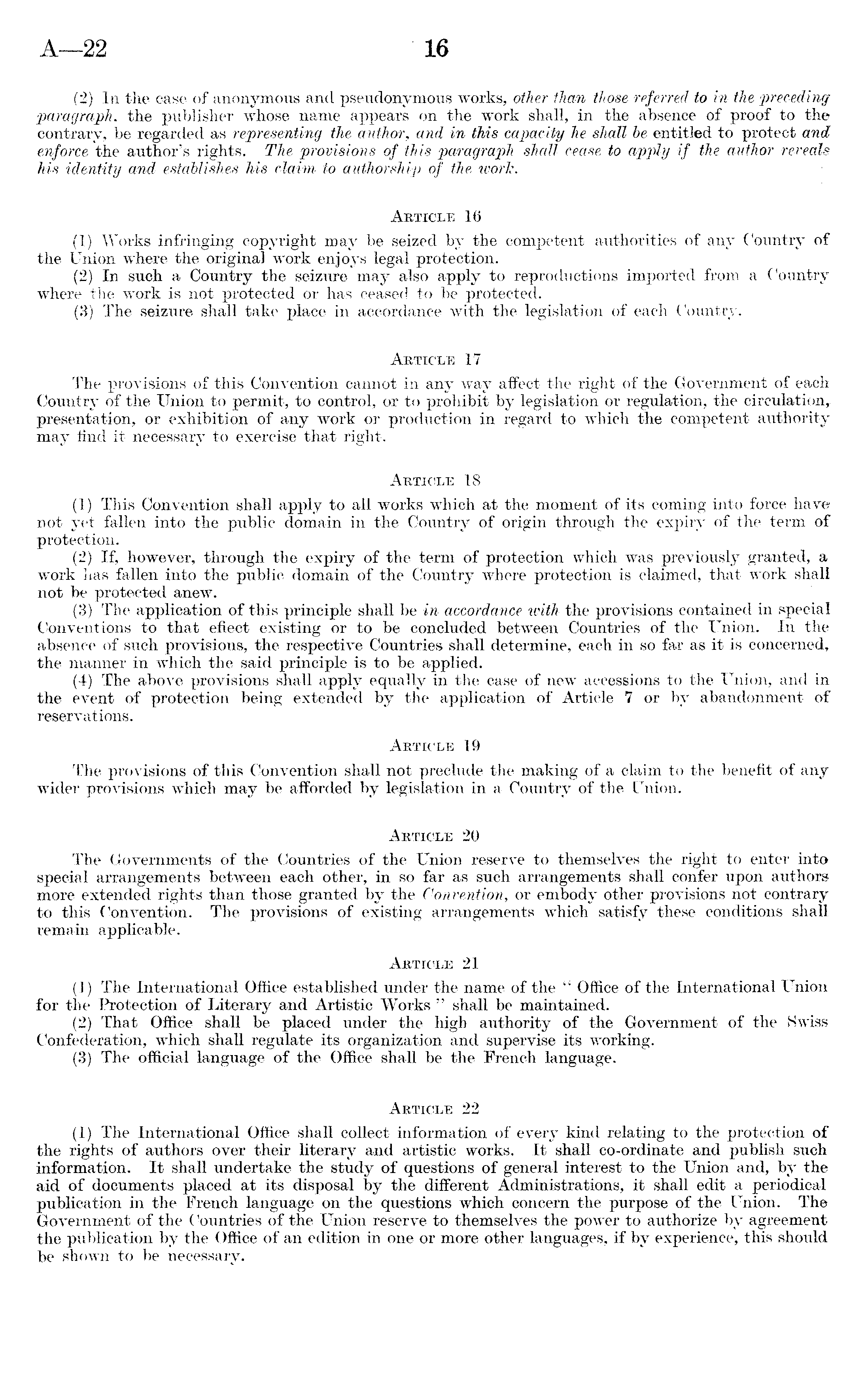 (2) In the case of anonymous and pseudonymous works, other than those referred to in the preceding 'paragraph, the publisher whose name appears on the work shall, in the absence of proof to the contrary, be regarded as representing the author, and in this capacity he shall be entitled to protect and enforce the author's rights. The provisions of this paragraph shall cease to apply if the author reveals his identity and establishes his claim to authorship of the worlc. Article 16 (1) Works infringing copyright may be seized by the competent authorities of any Country of the Union where the original work enjoys legal protection. (2) In such a Country the seizure may also apply to reproductions imported from a Country where the work is not protected or has ceased to be protected. (3) The seizure shall take place in accordance with the legislation of each Country. Article 17 The provisions of this Convention cannot in any way affect the right of the Government of each Country of the Union to permit, to control, or to prohibit by legislation or regulation, the circulation,, presentation, or exhibition of any work or production in regard to which the competent authority may find it necessary to exercise that right. Article 18 (1) This Convention shall apply to all works which at the moment of its coming into force have not yet fallen into the public domain in the Country of origin through the expiry of the term of protection. (2) If, however, through the expiry of the term of protection which was previously granted, a work lias fallen into the public domain of the Country where protection is claimed, that work shall not be protected anew. (3) The application of this principle shall be in accordance with the provisions contained in special Conventions to that efiect existing or to be concluded between Countries of the Union. In the absence of such provisions, the respective Countries shall determine, each in so far as it is concerned, the manner in which the said principle is to be applied. (4) The above provisions shall apply equally in the case of new accessions to the Union, and in the event of protection being extended by the application of Article 7 or by abandonment of reservations. Article 19 The provisions of this Convention shall not preclude the making of a claim to the benefit of any wider provisions which may be afforded by legislation in a Country of the Union. Article 20 The Governments of the Countries of the Union reserve to themselves the right to enter into special arrangements between each other, in so far as such arrangements shall confer upon authors more extended rights than those granted by the Convention, or embody other provisions not contrary to this Convention. The provisions of existing arrangements which satisfy these conditions shall remain applicable. Article 21 (1) The International Office established under the name of the " Office of the International Union for the Protection of Literary and Artistic Works " shall be maintained. (2) That Office shall be placed under the high authority of the Government of the Swiss Confederation, which shall regulate its organization and supervise its working. (3) The official language of the Office shall be the French language. Article 22 (1) The International Office shall collect information of every kind relating to the protection of the rights of authors over their literary and artistic works. It shall co-ordinate and publish such information. It shall undertake the study of questions of general interest to the Union and, by the aid of documents placed at its disposal by the different Administrations, it shall edit a periodical publication in the French language on the questions which concern the purpose of the Union. The Government of the Countries of the Union reserve to themselves the power to authorize by agreement the publication by the Office of an edition in one or more other languages, if by experience, this should be shown to be necessary.