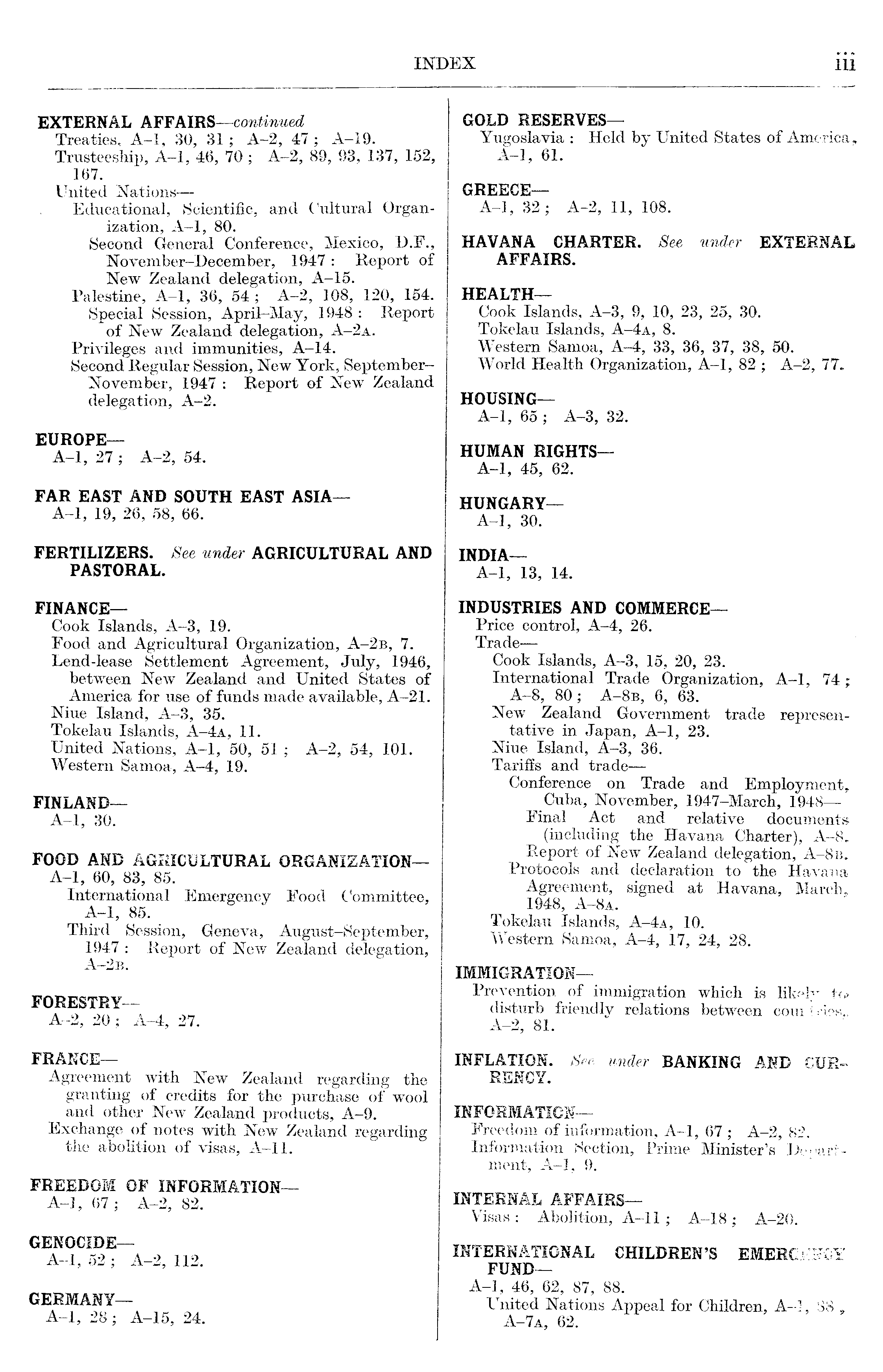 GOLD RESERVES— Yugoslavia : Held by United States of America, A-l, 61. GREECE— A-l, 32; A-2, 11, 108. HAVANA CHARTER, See under EXTERNAL AFFAIRS. HEALTH— Cook Islands, A-3, 9, 10, 23, 25, 30. Tokelau Islands, A-4a, 8. Western Samoa, A-4, 33, 36, 37, 38, SO. World Health Organization, A-l, 82 ; A-2, 77. HOUSING— A-l, 65 ; A-3, 32. HUMAN RIGHTS— A-l, 45, 62. HUNGARY— A-l, 30. INDIA— A-l, 13, 14. INDUSTRIES AND COMMERCE— Price control, A-4, 26. TradeCook Islands, A-3, 15, 20, 23. International Trade Organization, A-l, 74; A-8, 80; A-Bb, 6, 63. New Zealand Government trade representative in Japan, A-l, 23. Niue Island, A-3, 36. Tariffs and trade— Conference on Trade and Employment, Cuba, November, 1947-March, 1948 Final Act and relative documents (including the Havana Charter), A-8. Report of New Zealand delegation, A-Bb. Protocols and declaration to the Havana Agreement, signed at Havana, March, 1948, A-Ba. Tokelau Islands, A-4a, 10. Western Samoa, A-4, 17, 24, 28. IMMIGRATION— Prevention of immigration which is likely to> disturb friendlv relations between court Has.. A-2, 81. INFLATION. See under BANKING AND CURRENCY. INFORMATION— Freedom of information, A-l, 67 ; A-2, 82. Information Section, Prime Minister's Bepartment, A-l, 9. INTERNAL AFFAIRS— Visas: Abolition, A-ll ; A-18; A-20. INTERNATIONAL CHILDREN'S EMERGENCY FUND— A-l, 46, 62, 87, 88. United Nations Appeal for Children, A-l, 88 , A-7a, 62.