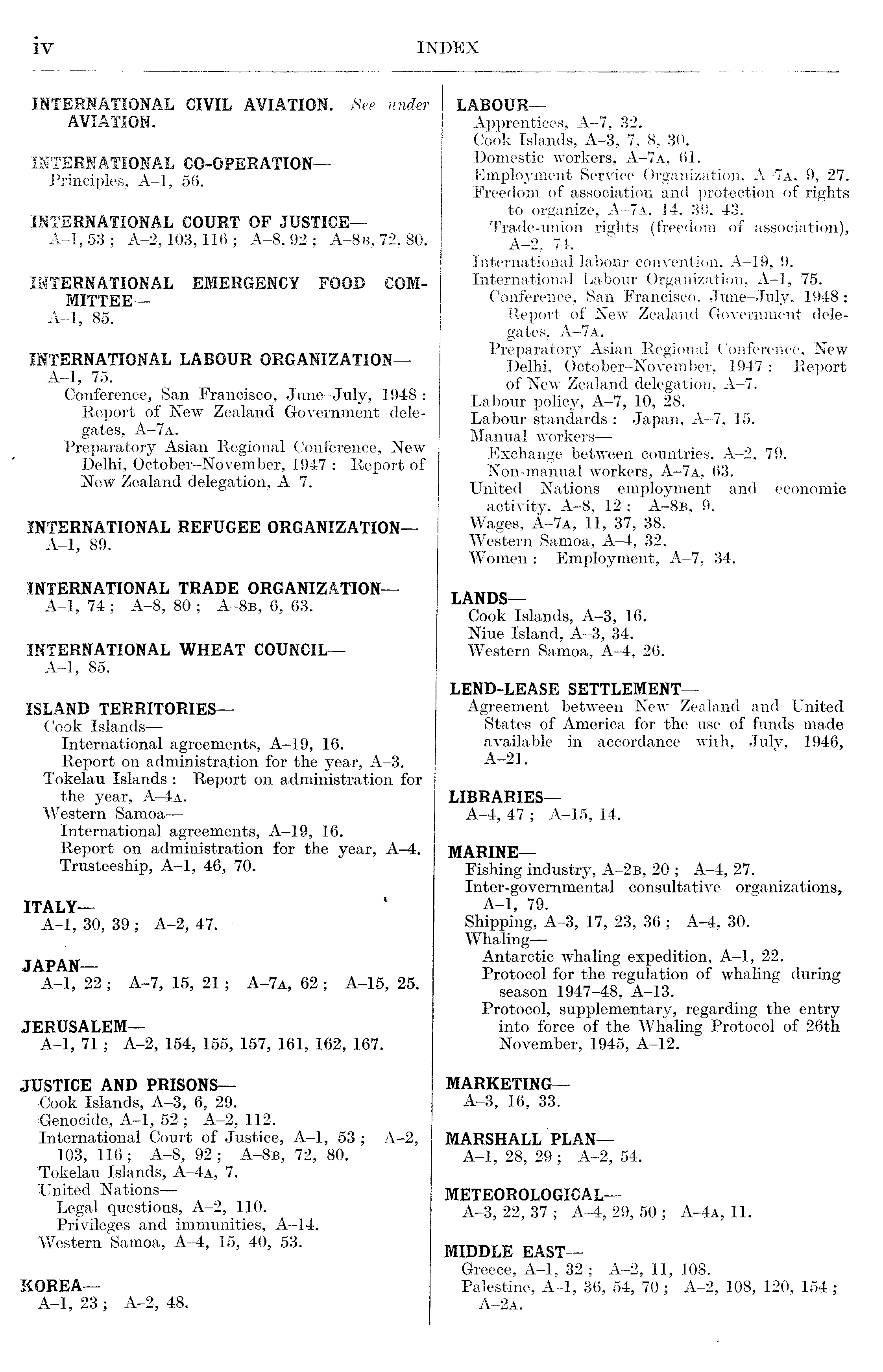 LABOUR— Apprentices, A-7, 32. Cook Islands, A-3, 7, 8, 30. Domestic workers, A-7a, 61. Employment Service Organization, A-7a, 9, 27. Freedom of association and protection of rights to organize, A-7a, 14, 39, 43. Trade-union rights (freedom of association), A-2, 74. International labour convention, A-19, 9. International Labour Organization, A-l, 75. Conference, San Francisco, June-July, 1948 : Report of New Zealand Government delegates, A-7a. Preparatory Asian Regional Conference, New Delhi, October-November, 1947 : Report of New Zealand delegation, A-7. Labour policy, A-7, 10, 28. Labour standards : Japan, A-7, 15. Manual workers— Exchange between countries, A-2, 79. Non-manual workers, A-7a, 63. United Nations employment and economic activity, A-8, 12; A-Bb, 9. Wages, A-7a, 11, 37, 38. Western Samoa, A-4, 32. Women : Employment, A-7, 34. LANDS— Cook Islands, A-3, 16. Niue Island, A-3, 34. Western Samoa, A-4, 26. LEND-LEASE SETTLEMENT— Agreement between New Zealand and United States of America for the use of funds made available in accordance with, July, 1946, A-21. LIBRARIES— A-4, 47 ; A-15, 14. MARINE— Fishing industry, A-2b, 20 ; A-4, 27. Inter-governmental consultative organizations, A-l, 79. Shipping, A-3, 17, 23, 36 ; A-4, 30. Whaling— Antarctic whaling expedition, A-l, 22. Protocol for the regulation of whaling during season 1947-48, A-13. Protocol, supplementary, regarding the entry into force of the Whaling Protocol of 26th November, 1945, A-12. MARKETING— A-3, 16, 33. MARSHALL PLAN— A-l, 28, 29 ; A-2, 54. METEOROLOGICAL— A-3, 22, 37 ; A-4, 29, 50 ; A-4a, 11. MIDDLE EAST— Greece, A-l, 32 ; A-2, 11, 108. Palestine, A-l, 36, 54, 70 ; A-2, 108, 120, 154 j A-2a.