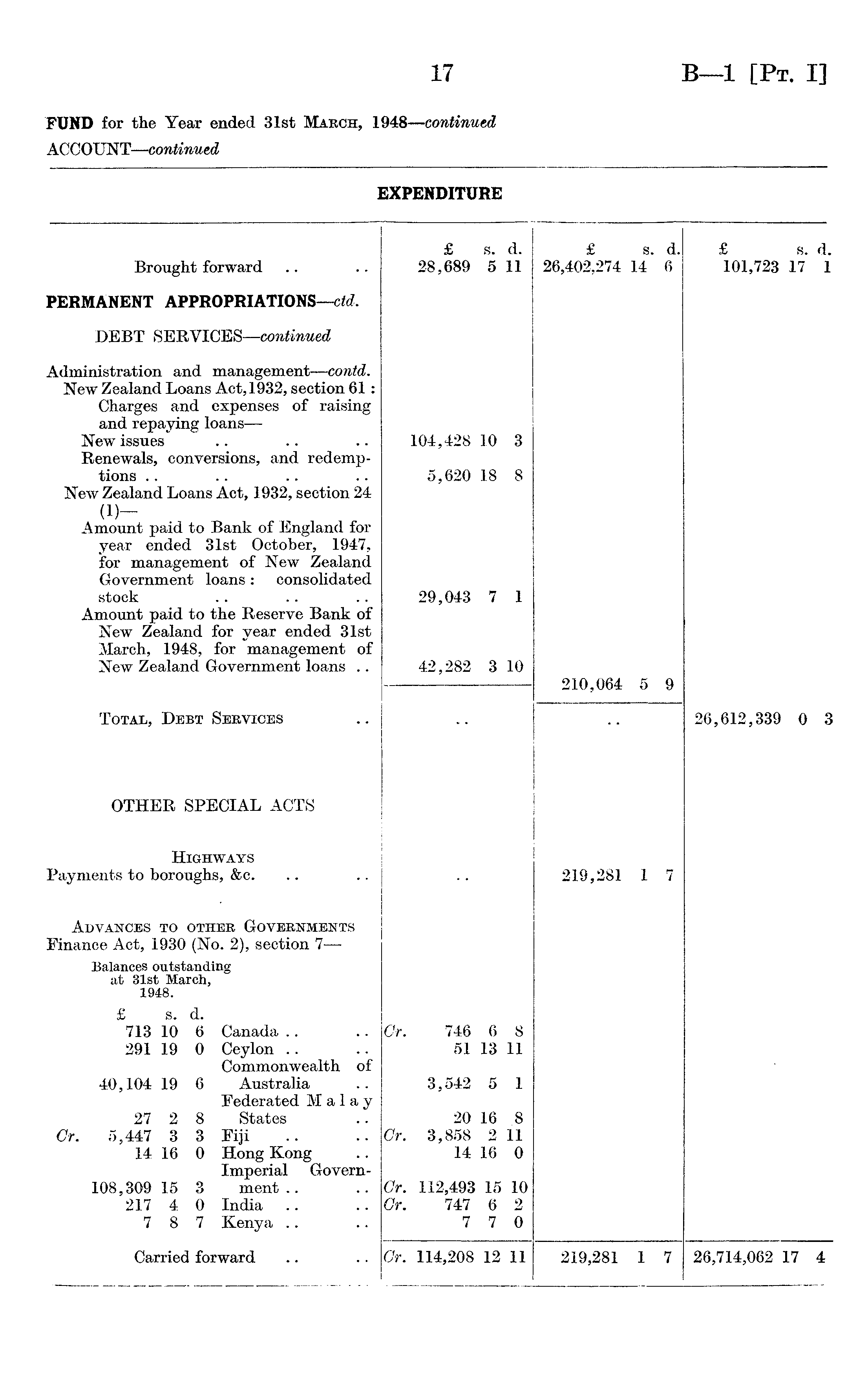 EXPENDITURE £ s. d. £ s. d. £ s. d. Brought forward 28,689 5 11 26,402,274 14 6 101,723 17 1 PERMANENT APPROPRIATIONS —ctd. DEBT SERVICES—continued Administration and management—contd. New Zealand Loans Act, 1932, section 61 : Charges and expenses of raising and repaying loans — New issues 104,428 10 3 Renewals, conversions, and redemptions 5,620 18 8 New Zealand Loans Act, 1932, section 24 (1)Amount paid to Bank of England for year ended 31st October, 1947, for management of New Zealand Government loans: consolidated stock 29,043 7 1 Amount paid to the Reserve Bank of New Zealand for year ended 31st March, 1948, for management of New Zealand Government loans .. 42,282 3 10 910 0R4- Q Total, Debt Services 26,612,339 0 3 OTHER SPECIAL ACTS 1 Highways Payments to boroughs, &c. 219,281 1 7 Advances to other Governments Finance Act, 1930 (No. 2), section 7— Balances outstanding at 31st March, 1948. £ S. d. 713 10 6 Canada Cr. 746 6 8 291 19 0 Ceylon .. 51 13 11 Commonwealth of 40,104 19 6 Australia 3,542 5 1 Federated Malay 27 2 8 States 20 16 8 Cr. 5,447 3 3 Fiji Cr. 3,858 2 11 14 16 0 Hong Kong 14 16 0 Imperial Govern108,309 15 3 ment.. Cr. 112,493 15 10 217 4 0 India Cr. 747 6 2 7 8 7 Kenya .. 7 7 0 Carried forward Cr. 114,208 12 11 219,281 1 7 26,714,062 17 4