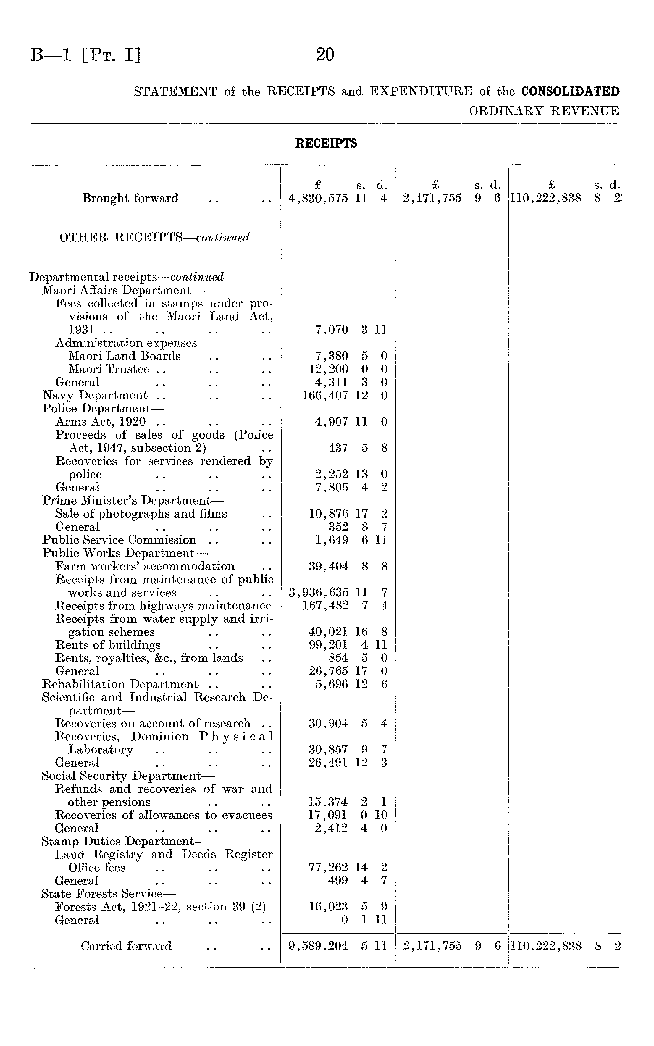 RECEIPTS £ s. d. £ s. d. £ s. d. Brought forward 4,830,575 11 4 2,171,755 9 6 110,222,838 8 2S OTHER RECEIPTS—continued Departmental receipts—continued Maori Affairs Department— Fees collected in stamps under pro1 visions of the Maori Land Act, ! 1931 .. 7,070 3 11 Administration expenses— Maori Land Boards 7,380 5 0 Maori Trustee 12,200 0 0 General 4,311 3 0 Navy Department 166,407 12 0 Police Department— Arms Act, 1920 4,907 11 0 Proceeds of sales of goods (Police Act, 1947, subsection 2) 437 5 8 Recoveries for services rendered by police 2,252 13 0 General 7,805 4 2 Prime Minister's Department— Sale of photographs and films 10,876 17 2 General 352 8 7 Public Service Commission 1,649 6 11 Public Works Department— Farm workers' accommodation 39,404 8 8 Receipts from maintenance of public works and services 3,936,635 11 7 Receipts from highways maintenance 167,482 7 4 Receipts from water-supply and irrigation schemes 40,021 16 8 Rents of buildings .. 99,201 4 11 Rents, royalties, &c., from lands 854 5 0 General .. .. 26,765 17 0 Rehabilitation Department .. 5,696 12 6 Scientific and Industrial Research Department — Recoveries on account of research .. 30,904 5 4 Recoveries, Dominion Physical Laboratory 30,857 9 7 General 26,491 12 3 Social Security Department— Refunds and recoveries of war and other pensions 15,374 2 1 Recoveries of allowances to evacuees 17,091 0 10 General 2,412 4 0 Stamp Duties Department— Land Registry and Deeds Register Office fees 77,262 14 2 General 499 4 7 State Forests Service— Forests Act, 1921-22, section 39 (2) 16,023 5 9 General 0 1 11 Carried forward 9,589,204 5 11 2,171,755 9 6 110,222,838 8 2