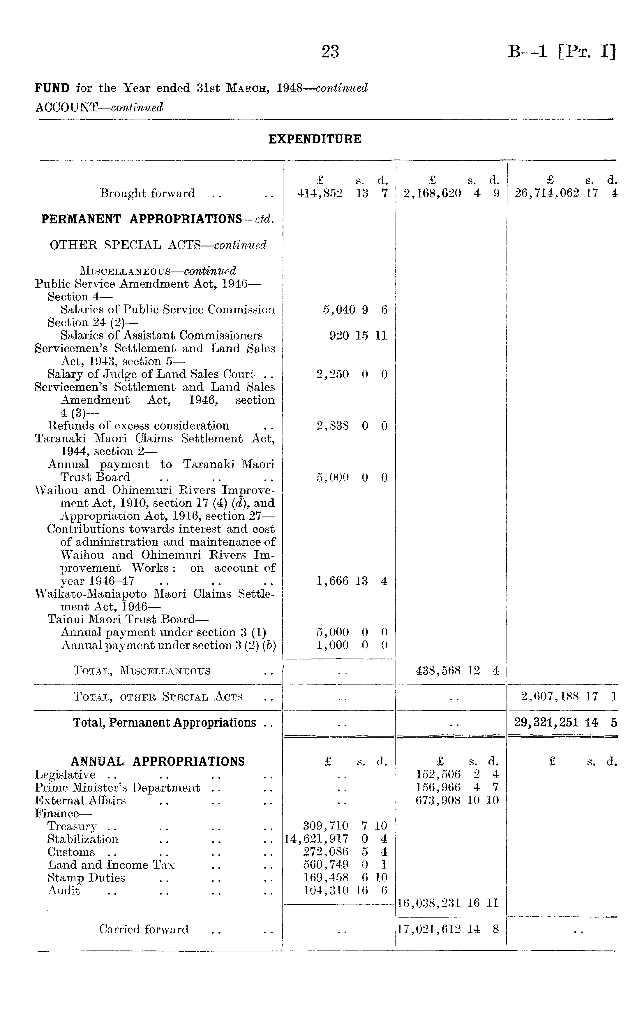 EXPENDITURE £ s. d. £ s. d. £ s. d. Brought forward 414,852 13 7 2,168,620 4 9 26,714,062 17 4 PERMANENT APPROPRIATIONS —ctd. OTHER SPECIAL ACTS—continued Miscellaneous—continued Public Service Amendment Act, 1946 — Section 4— Salaries of Public Service Commission 5,040 9 6 Section 24 (2) — Salaries of Assistant Commissioners 920 15 11 Servicemen's Settlement and Land Sales Act, 1943, section 5— Salary of Judge of Land Sales Court .. 2,250 0 0 Servicemen's Settlement and Land Sales Amendment Act, 1946, section 4(3)Refunds of excess consideration 2,838 0 0 Taranaki Maori Claims Settlement Act, 1944, section 2— Annual payment to Taranaki Maori Trust Board 5,000 0 0 Waihou and Ohinemuri Rivers Improvement Act, 1910, section 17 (4) (d), and Appropriation Act, 1916, section 27— Contributions towards interest and cost of administration and maintenance of Waihou and Ohinemuri Rivers Improvement Works : on account of year 1946-47 1,666 13 4 Waikato-Maniapoto Maori Claims Settlement Act, 1946— Tainui Maori Trust Board — Annual payment under section 3 (1) 5,000 0 0 Annual payment under section 3 (2) (b) 1,000 0 0 Total, Miscellaneous 438,568 12 4 Total, other Special Acts 2,607,188 17 1 Total, Permanent Appropriations .. 29,321,251 14 5 ANNUAL APPROPRIATIONS £ s. d. £ s. d. £ s. d. Legislative 152,506 2 4 Prime Minister's Department 156,966 4 7 External Affairs 673,908 10 10 Finance — Treasury 309,710 7 10 Stabilization 14,621,917 0 4 Customs 272,086 5 4 Land and Income Tax 560,749 0 1 Stamp Duties 169,458 6 10 Audit 104,310 16 6 . 16,038,231 16 11 Carried forward 17,021,612 14 8