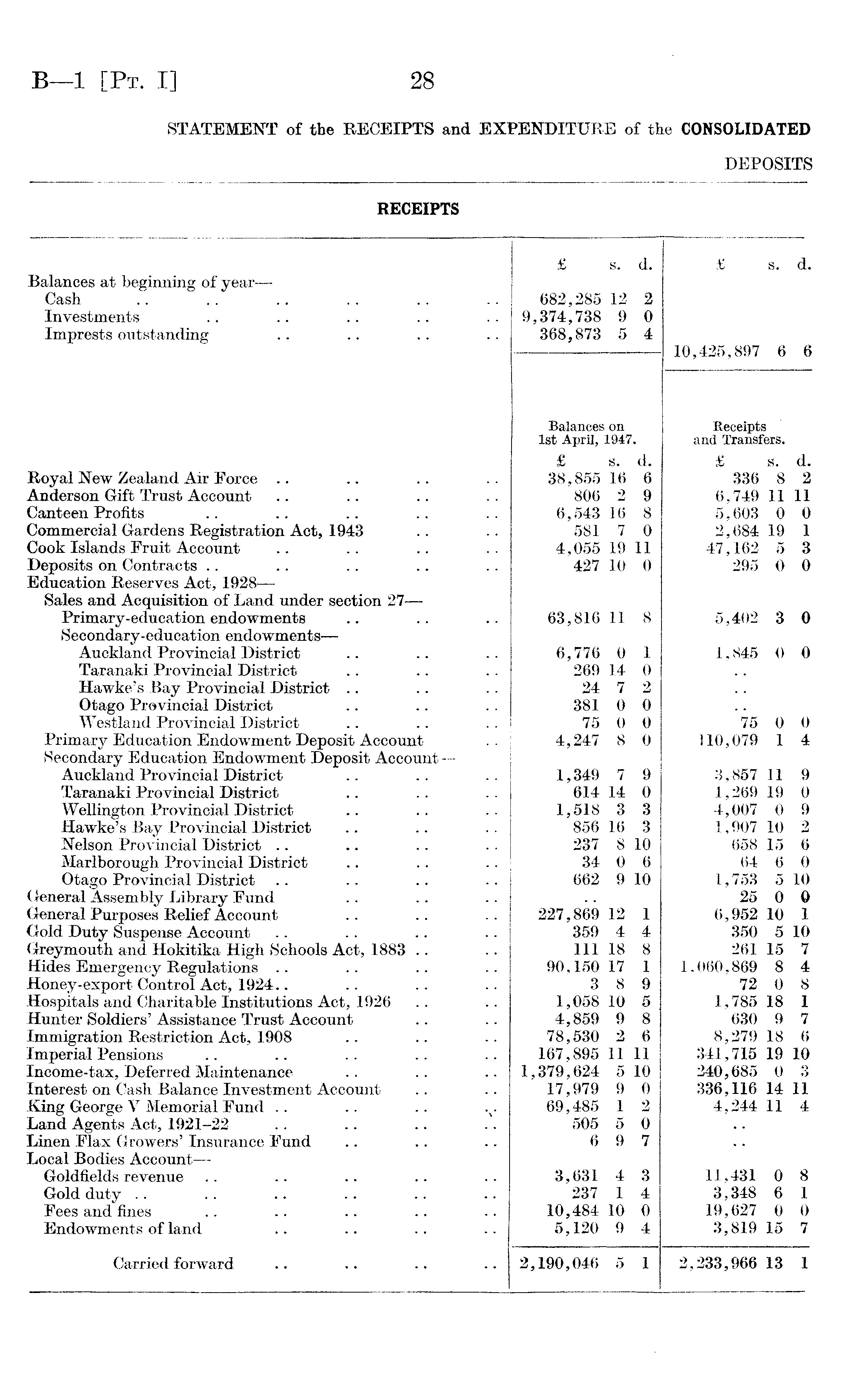RECEIPTS £ s. d. £ s. d. Balances at beginning of year— Cash 682,285 12 2 Investments 9,374,738 9 0 Imprests outstanding 368,873 5 4 10,425,897 6 6 Balances on Receipts 1st April, 1947. and Transfers. £ s. d. £ s. d. Royal New Zealand Air Force 38,855 16 6 336 8 2 Anderson Gift Trust Account 806 2 9 6,749 11 11 Canteen Profits 6,543 16 8 5,603 0 0 Commercial Gardens Registration Act, 1943 581 7 0 2,684 19 1 Cook Islands Fruit Account 4,055 19 11 47,162 5 3 Deposits on Contracts 427 10 0 295 0 0 Education Reserves Act, 1928— Sales and Acquisition of Land under section 27— Primary-education endowments 63,816 11 8 5,402 3 0 Secondary-education endowments — Auckland Provincial District 6,776 0 1 1,845 0 0 Taranaki Provincial District 269 14 0 Hawke's Bay Provincial District 24 7 2 Otago Provincial District 381 0 0 Westland Provincial District 75 0 0 75 0 0 Primary Education Endowment Deposit Account 4,247 8 0 110,079 1 4 Secondary Education Endowment Deposit Account — Auckland Provincial District 1,349 7 9 3,857 11 9 Taranaki Provincial District 614 14 0 1,269 19 0 Wellington Provincial District 1,518 3 3 4,007 0 9 Hawke's Bay Provincial District 856 16 3 1,907 10 2 Nelson Provincial District 237 8 10 658 15 6 Marlborough Provincial District 34 0 6 64 6 0 Otago Provincial District 662 9 10 1,753 5 10 General Assembly Library Fund 25 0 0 General Purposes Relief Account .. .. 227,869 12 1 6,952 10 1 Gold Duty Suspense Account .. .. .. 359 4 4 350 5 10 Greymouth and Hokitika High Schools Act, 1883 111 18 8 261 15 7 Hides Emergency Regulations 90,150 17 1 1.060,869 8 4 Honey-export Control Act, 1924.. 3 8 9 72 0 8 Hospitals and Charitable Institutions Act, 1926 1,058 10 5 1,785 18 1 Hunter Soldiers' Assistance Trust Account 4,859 9 8 630 9 7 Immigration Restriction Act, 1908 78,530 2 6 8,279 18 6 Imperial Pensions 167,895 11 11 341,715 19 10 Income-tax, Deferred Maintenance 1,379,624 5 10 240,685 0 3 Interest on Cash Balance Investment Account 17,979 9 0 336,116 14 11 King George V Memorial Fund .. .. .. v 69,485 1 2 4,244 11 4 Land Agents Act, 1921-22 505 5 0 Linen Flax Growers' Insurance Fund 6 9 7 Local Bodies Account —- Goldfields revenue 3,631 4 3 11,431 0 8 Gold duty 237 1 4 3,348 6 1 Fees and fines 10,484 10 0 19,627 0 0 Endowments of land 5,120 9 4 3,819 15 7 Carried forward 2,190,046 5 1 2,233,966 13 1