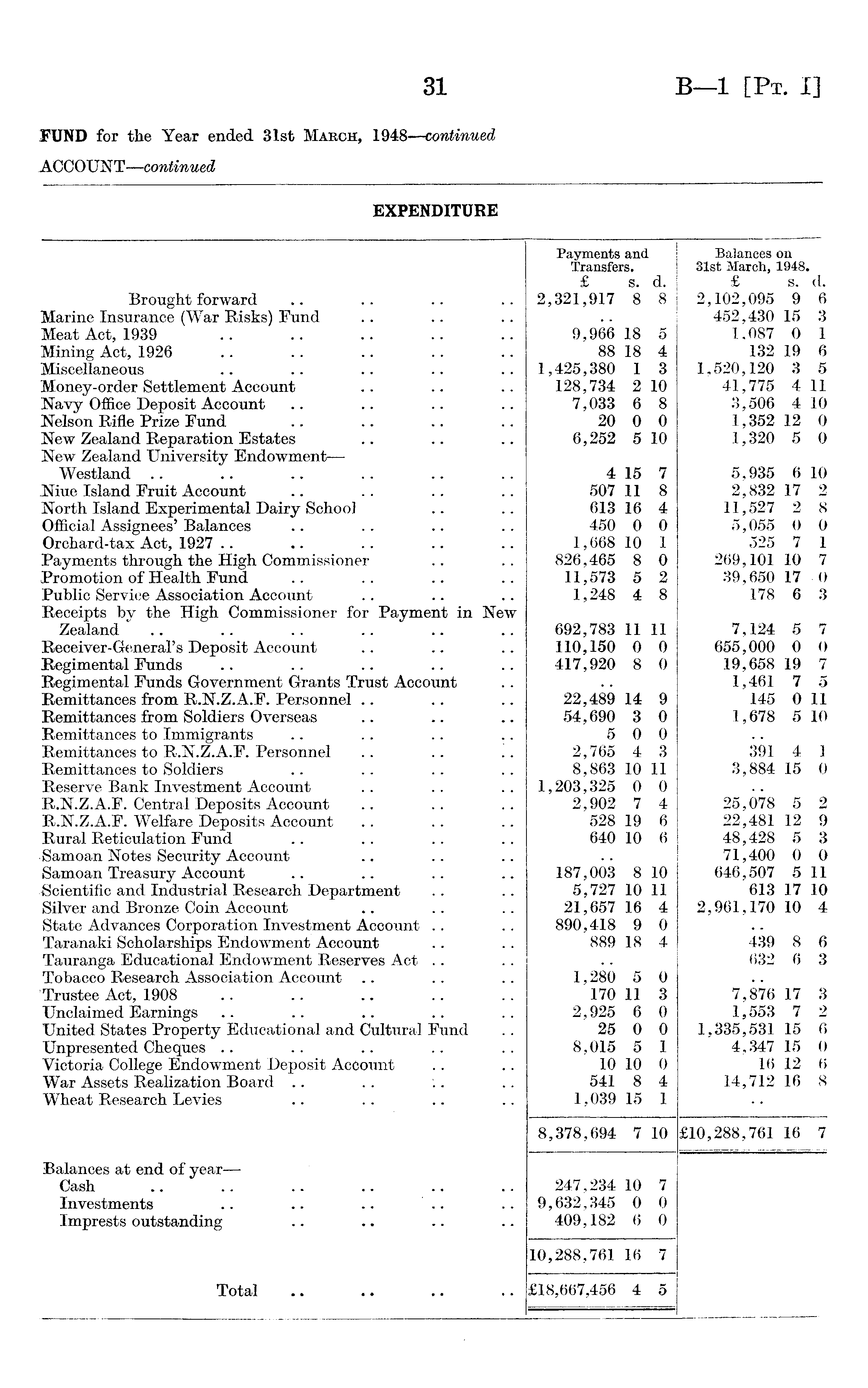 EXPENDITURE Payments and Balances on Transfers. Slst March, 1948. £ s. d. £ s. d. Brought forward .. .. 2,321,917 8 8 2,102,095 9 6 Marine Insurance (War Risks) Fund 452,430 15 3 Meat Act, 1939 9,966 18 5 1,087 0 1 Mining Act, 1926 88 18 4 132 19 6 Miscellaneous 1,425,380 1 3 1,520,120 3 5 Money-order Settlement Account 128,734 2 10 41,775 4 11 Navy Office Deposit Account 7,033 6 8 3,506 4 10 Nelson Rifle Prize Fund 20 0 0 1,352 12 0 New Zealand Reparation Estates 6,252 5 10 1,320 5 0 New Zealand University Endowment — Westland 4 15 7 5,935 6 10 Niue Island Fruit Account 507 11 8 2,832 17 2 North Island Experimental Dairy School Official Assignees' Balances 613 16 4 11,527 2 8 450 0 0 5,055 0 0 Orchard-tax Act, 1927 1,668 10 1 525 7 1 Payments through the High Commissioner 826,465 8 0 269,101 10 7 Promotion of Health Fund 11,573 5 2 39,650 17 0 Public Service Association Account 1,248 4 8 178 6 3 Receipts by the High Commissioner for Payment in New Zealand 692,783 11 11 7,124 5 7 Receiver-General's Deposit Account 110,150 0 0 655,000 0 0 Regimental Funds 417,920 8 0 19,658 19 7 Regimental Funds Government Grants Trust Account 1,461 7 5 Remittances from R.N.Z.A.F. Personnel 22,489 14 9 145 0 11 Remittances from Soldiers Overseas 54,690 3 0 1,678 5 10 Remittances to Immigrants 5 0 0 Remittances to R.N.Z.A.F. Personnel 2,765 4 3 391 4 1 Remittances to Soldiers 8,863 10 11 3,884 15 0 Reserve Bank Investment Account 1,203,325 0 0 R.N.Z.A.F. Central Deposits Account 2,902 7 4 25,078 5 2 R.N.Z.A.F. Welfare Deposits Account 528 19 6 22,481 12 9 Rural Reticulation Fund 640 10 6 48,428 5 3 Samoan Notes Security Account 71,400 0 0 Samoan Treasury Account 187,003 8 10 646,507 5 11 Scientific and Industrial Research Department 5,727 10 11 613 17 10 Silver and Bronze Coin Account 21,657 16 4 2,961,170 10 4 State Advances Corporation Investment Account 890,418 9 0 Taranaki Scholarships Endowment Account 889 18 4 439 8 6 Tauranga Educational Endowment Reserves Act 632 6 3 Tobacco Research Association Account 1,280 5 0 Trustee Act, 1908 170 11 3 7,876 17 3 Unclaimed Earnings 2,925 6 0 1,553 7 2 United States Property Educational and Cultural Fund 25 0 0 1,335,531 15 6 Unpresented Cheques 8,015 5 1 4,347 15 0 Victoria College Endowment Deposit Account 10 10 0 16 12 6 War Assets Realization Board 541 8 4 14,712 16 8 Wheat Research Levies 1,039 15 1 8,378,694 7 10 £10,288,761 16 7 Balances at end of year — Cash 247,234 10 7 Investments .. .. .. 9,632,345 0 0 Imprests outstanding 409,182 6 0 10,288,761 16 7 Total £18,667,456 4 5