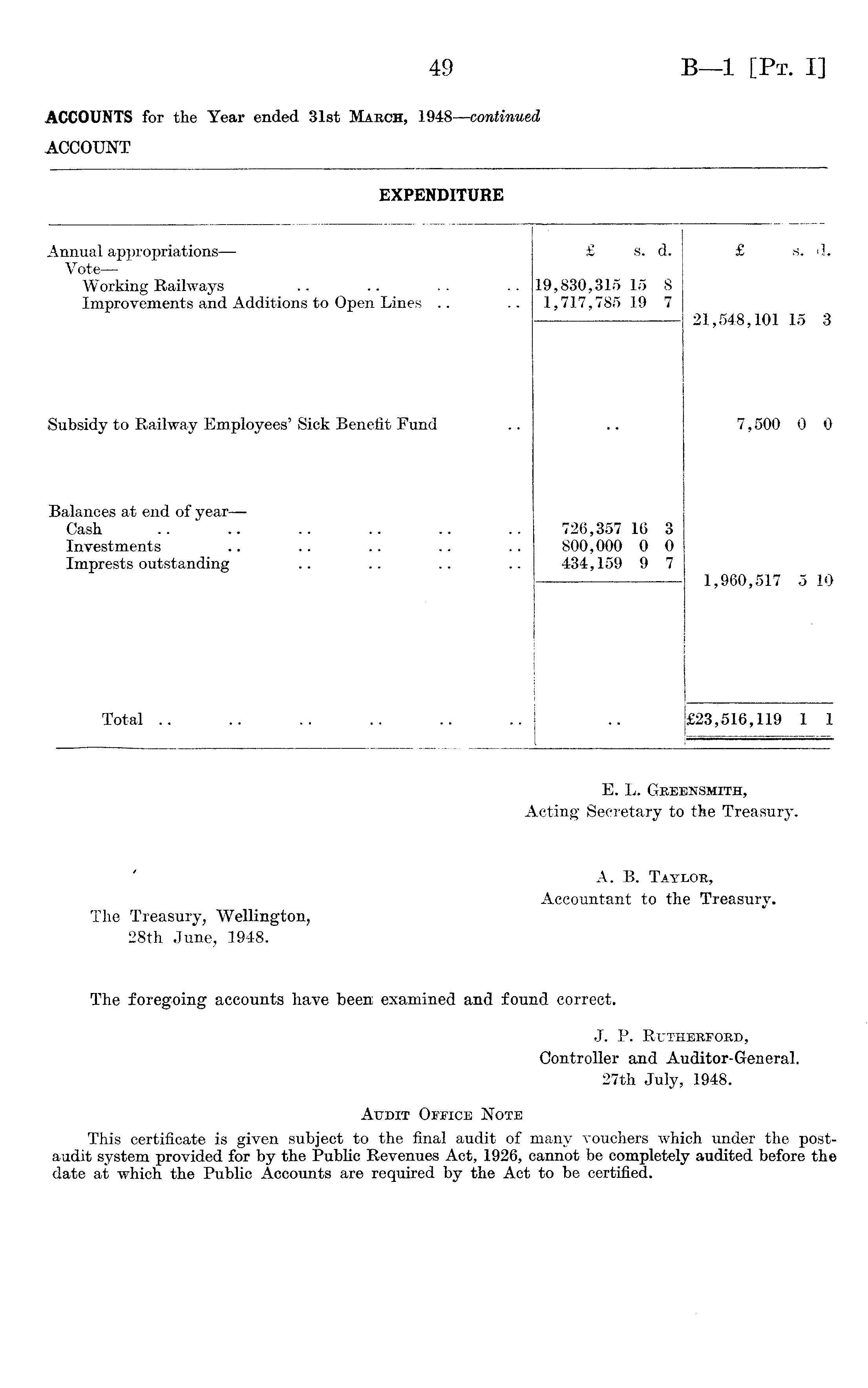 E. L. Greensmith, Acting Secretary to the Treasury. A. B. Taylor, Accountant to the Treasury. The Treasury, Wellington, 28th June, 1948. The foregoing accounts have been examined and found correct. J. P. Rutherford, Controller and Auditor-General. 27th July, 1948. Audit Office Note This certificate is given subject to the final audit of many vouchers which under the postaudit system provided for by the Public Revenues Act, 1926, cannot be completely audited before the date at which the Public Accounts are required by the Act to be certified.