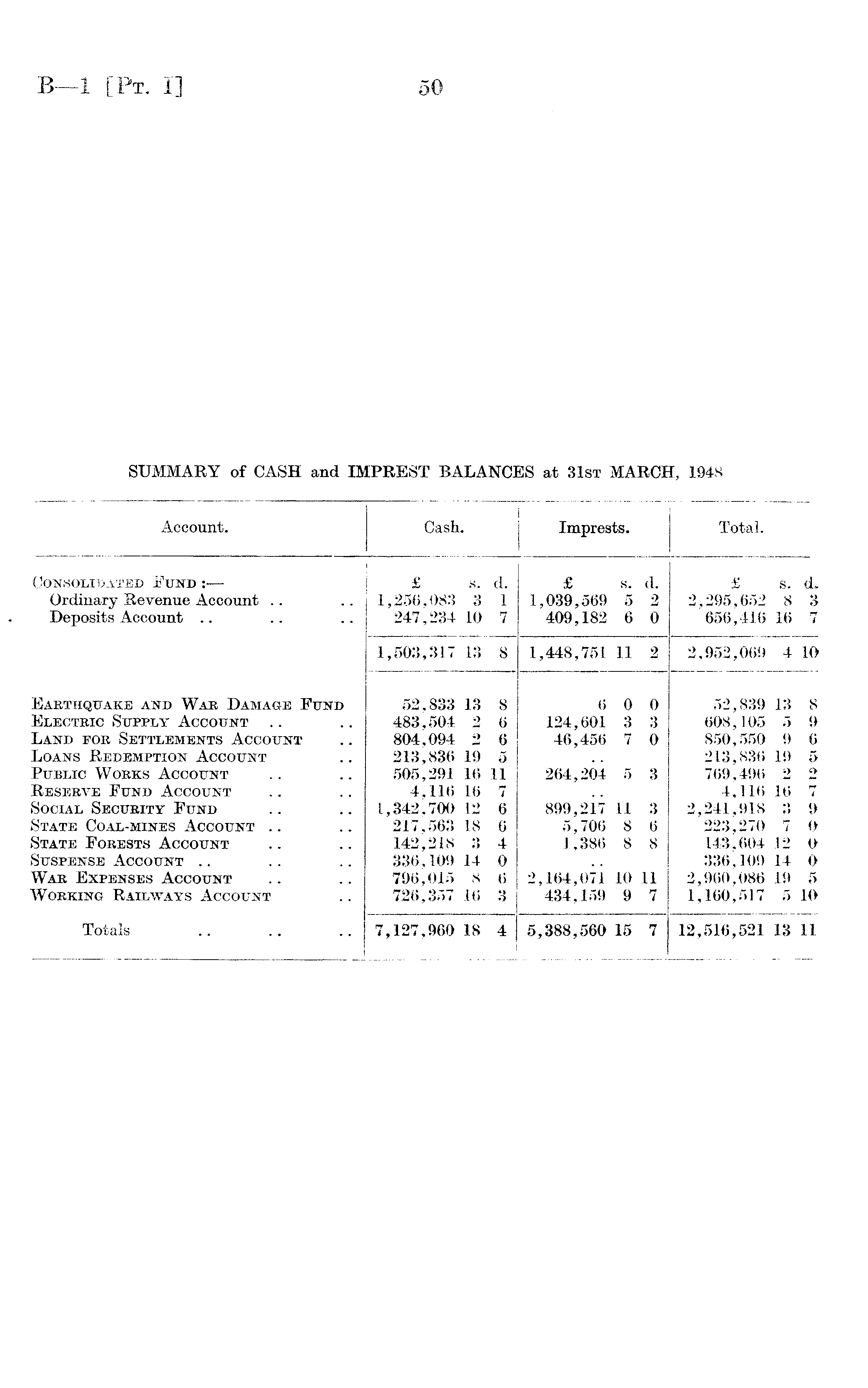 Account. 1 Cash. I Imprests. Total. Consolidated Fund :— Ordinary Revenue Account Deposits Account Earthquake and War Damage Fund Electric Supply Account Land for Settlements Account Loans Redemption Account Public Works Account Reserve Fund Account Social Security Fund State Coal-mines Account State Forests Account Suspense Account War Expenses Account Working Railways Account Totals £ s. d. 1,256.083 3 1 247,234 10 7 £ s. d. 1,039,569 5 2 409,182 6 0 £ s. d. 2,295,652 8 3 656,416 16 7 1,503,317 13 8 1,448,751 11 2 2,952,069 4 10 52,833 13 8 483,504 2 6 804,094 2 6 213,836 19 5 505,291 16 11 4,116 16 7 [,342,700 12 6 217,563 18 6 142,218 3 4 336,109 14 0 796,015 8 6 726,357 16 3 6 0 0 124,601 3 3 46,456 7 0 264,204 5 3 899,211 11 3 5,706 8 6 1,386 8 8 2,164,071 10 11 434,159 9 7 52,839 13 8 608,105 5 9 850,550 9 6 213,836 19 5 769,496 2 2 4,116 16 7 2,241,918 3 » 223,270 7 0 143.604 12 0 336,109 14 0 2,960,086 19 5 1,160,517 5 10 7,127,960 18 4 5,388,560 15 7 12,516,521 13 11