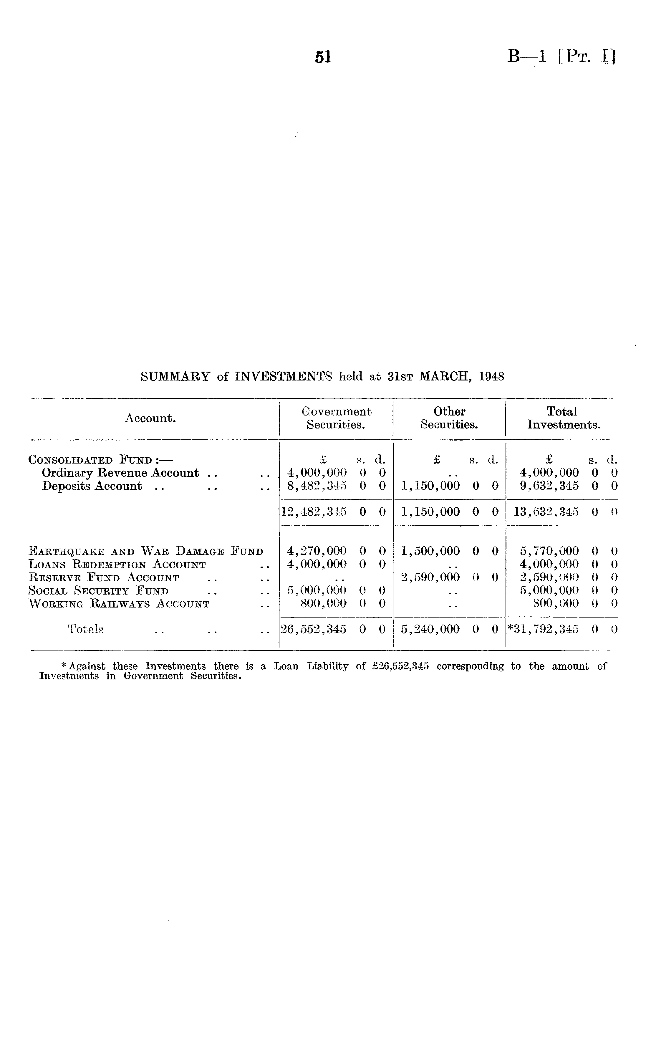Account. Government Other Securities. | Securities. Total Investments. Consolidated Fund :— Ordinary Revenue Account Deposits Account Earthquake and War Damage Fund Loans Redemption Account Reserve Fund Account Social Security Fund Working Railways Account Totals £ s. d. 4,000,000 0 0 8,482,345 0 0 £ s. d. 1,150,000 0 0 £ s. d. 4,000,000 0 0 9,632,345 0 0 12,482,34-5 0 0 1,150,000 0 0 13,632,345 0 0 4,270,000 0 0 4,000,000 0 0 5,000,000 0 0 800,000 0 0 1,500,000 0 0 2,590,000 0 0 5,770,000 0 0 4,000,000 0 0 2,590,000 0 0 5,000,000 0 0 800,000 0 0 26,552,345 0 0 5,240,000 0 0 *31,792,345 0 0 * Against these Investments there is a Loan Liability of £26,552,345 corresponding to the amount of Investments in Government Securities.