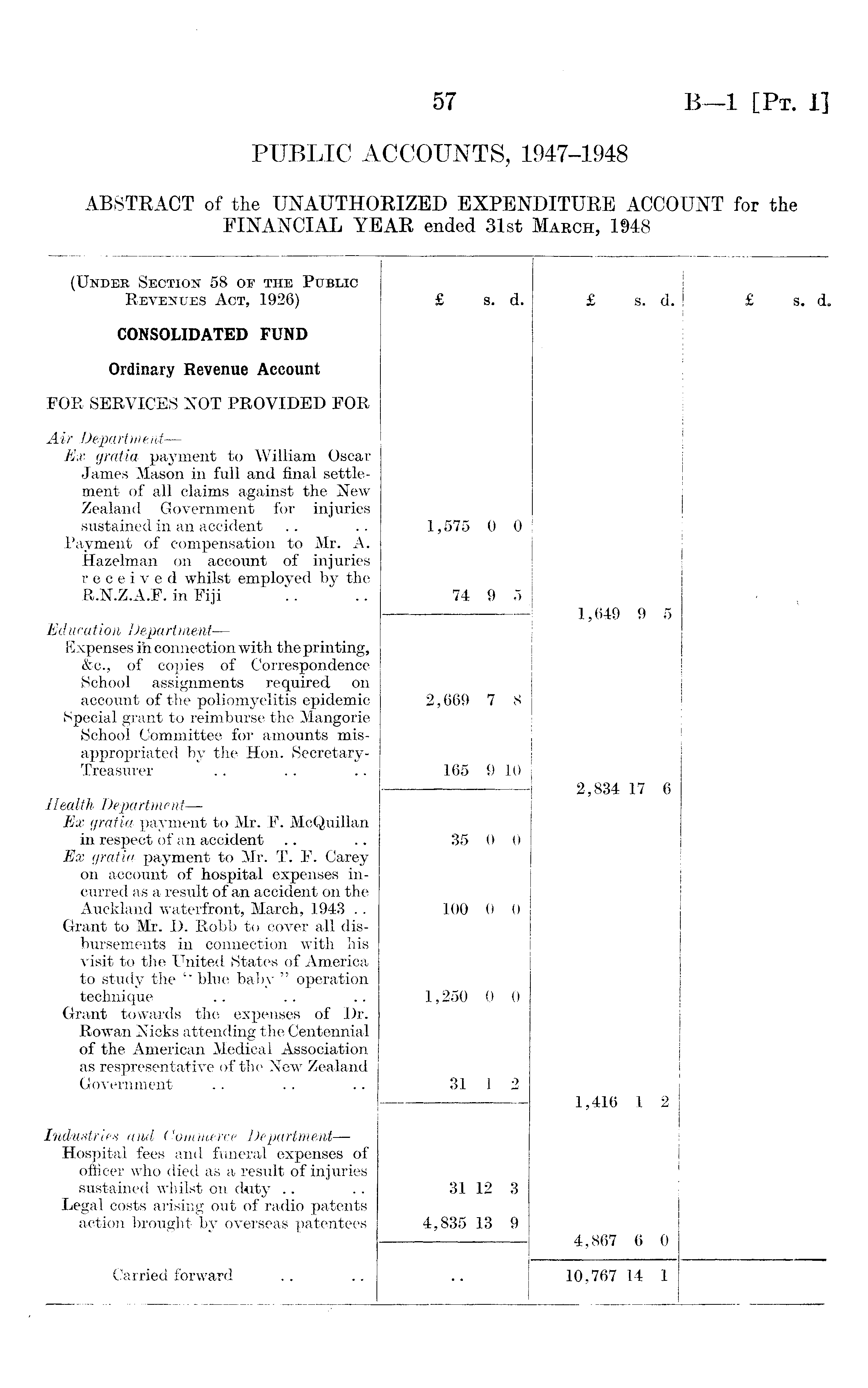 (Under Section 58 of the Public Revenues Act, 1926) £ s. d. £ s. d. £ s. d. CONSOLIDATED FUND Ordinary Revenue Account FOR SERVICES NOT PROVIDED FOR Air Department— Ex gratia payment to William Oscar James Mason in full and final settlement of all claims against the New Zealand Government for injuries sustained in an accident 1,575 0 0 Payment of compensation to Mr. A. Hazelman on account of injuries received whilst employed by the R.N.ZA.F. in Fiji 74 9 5 1,649 9 5 Education Department— Expenses i'n connection with the printing, &c., of copies of Correspondence School assignments required on account of the poliomyelitis epidemic 2,669 7 8 Special grant to reimburse the Mangorie School Committee for amounts misappropriated by the Hon. SecretaryTreasurer 165 9 10 O QOJ. 17 « &,OOI Id O Health Department— Ex gratia payment to Mr. F. McQuillan in respect of an accident 35 0 0 Ex gratia payment to Mr. T. F. Carey on account of hospital expenses incurred as a result of an accident on the Auckland waterfront, March, 1943 .. 100 0 0 Grant to Mr. D. Robb to cover all disbursements in connection with his visit to the United States of America to study the " blue baby " operation technique 1,250 0 0 Grant towards the expenses of Dr. Rowan Nicks attending the Centennial of the American Medical Association as respresentative of the New Zealand Government 31 1 2 1 4.1 A 1 O 1 y HU JL & Industries and Commerce Department— Hospital fees and funeral expenses of officer who died as a result of injuries sustained whilst on duty 31 12 3 Legal costs arising out of radio patents action brought by overseas patentees 4,835 13 9 4,867 6 0 Carried forward 10,767 14 1