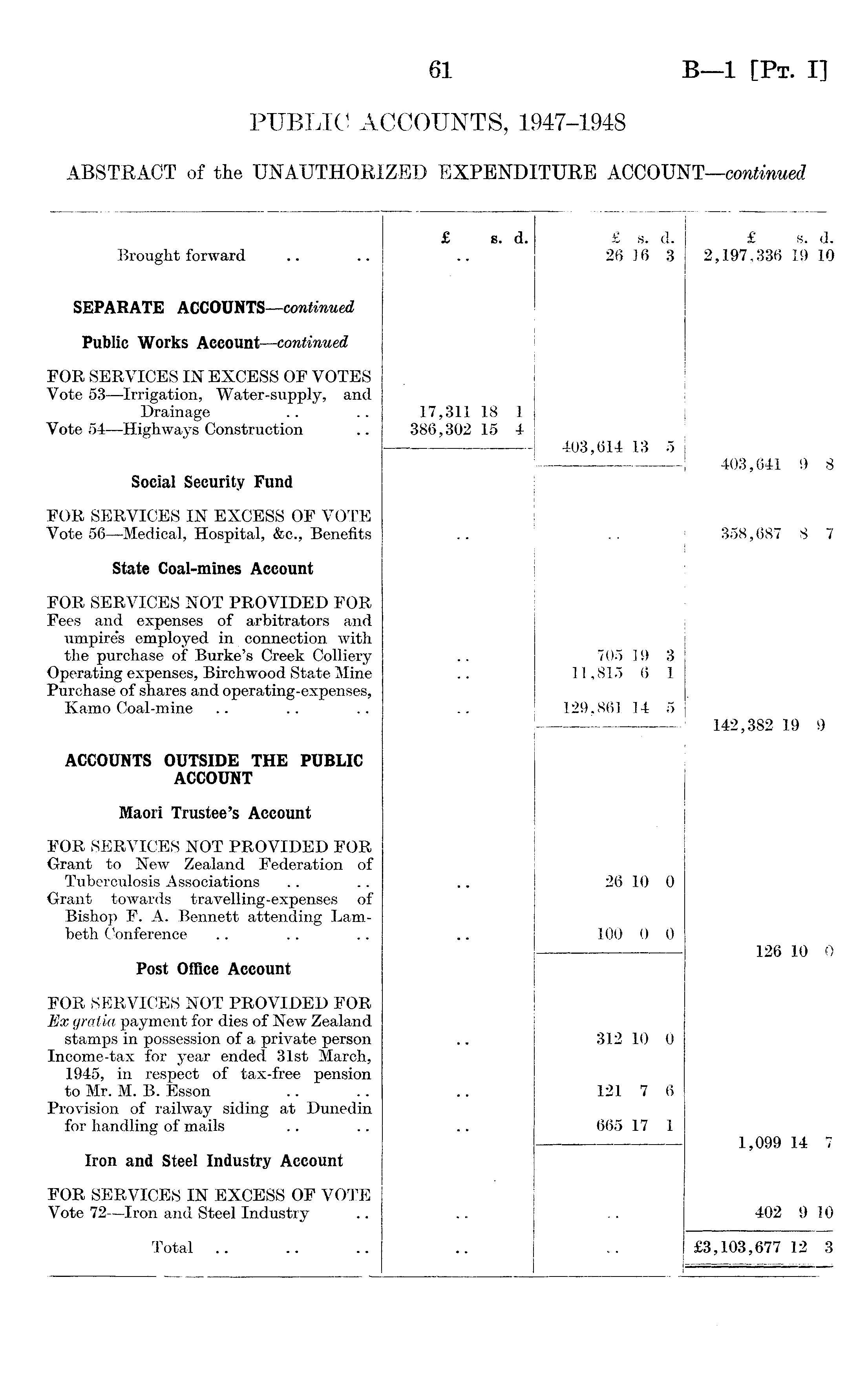 Brought forward £ s. d. £ 26 s. 16 d. 3 £ s. d. 2,197,336 19 10 SEPARATE ACCOUNTS —continued Public Works Account —continued FOR SERVICES IN EXCESS OF VOTES Vote 53 —Irrigation, Water-supply, and Drainage Vote 54—Highways Construction 17,311 18 386,302 15 1 4 403,614 13 403,641 9 8 Social Security Fund FOR SERVICES IN EXCESS OF VOTE Vote 56—Medical, Hospital, &c., Benefits 358,687 8 7 State Coal-mines Account ! FOR SERVICES NOT PROVIDED FOR Fees and expenses of arbitrators and umpire's employed in connection with the purchase of Burke's Creek Colliery Operating expenses, Birchwood State Mine Purchase of shares and operating-exipenses, Kamo Coal-mine 705 11,815 129,861 i ' 19 6 14 3 1 5 142,382 19 9 ACCOUNTS OUTSIDE THE PUBLIC ACCOUNT | Maori Trustee's Account FOR SERVICES NOT PROVIDED FOR -Grant to New Zealand Federation of Tuberculosis Associations Grant towards travelling-expenses of Bishop F. A. Bennett attending Lambeth Conference 26 100 10 0 0 0 126 10 0 Post Office Account FOR SERVICES NOT PROVIDED FOR Ex gratia payment for dies of New Zealand stamps in possession of a private person Income-tax for year ended 31st March, 1945, in respect of tax-free pension to Mr. M. B. Esson Provision of railway siding at Dunedin for handling of mails 312 121 665 10 7 17 0 6 1 1,099 14 Iron and Steel Industry Account FOR SERVICES IN EXCESS OF VOTE Vote 72 —Iron and Steel Industry 402 9 10 Total £3,103,677 12 3