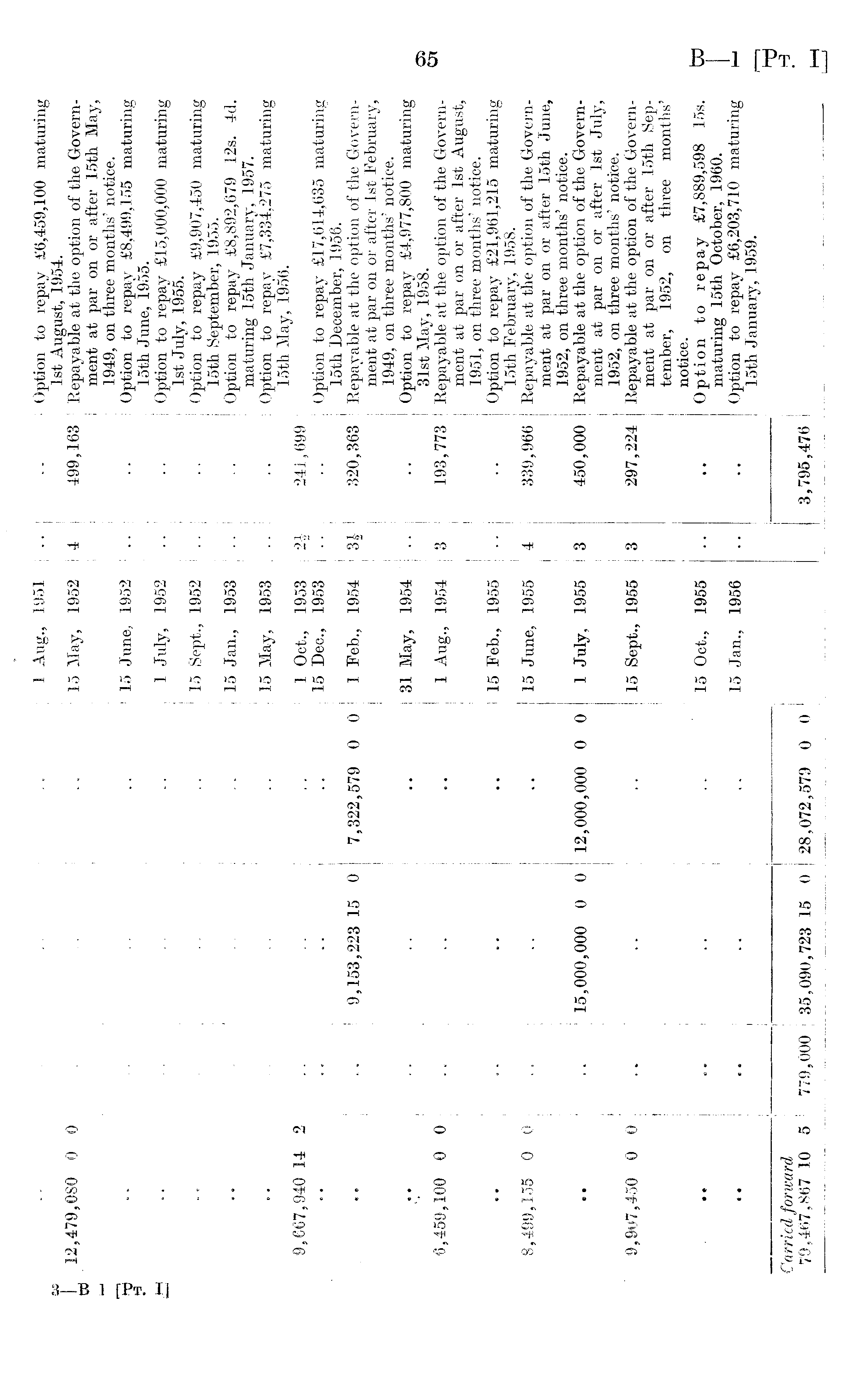 1 Aug., 1951 Option to repay £6,459,100 maturing 1st August, 1954. 12,479,080 0 0 15 May, 1952 4 499,163 Repayable at the option of the Government at par on or after 15th May, 1949, on three months' notice. 15 June, 1952 Option to repay £8,499,155 maturing 15th June, 1955. 1 July, 1952 | .. j Option to repay £15,000,000 maturing 1 1st July, 1955. 15 Sept., 1952 | .. Option to repay £9,907,450 maturing 15th September, 1955. 15 Jan., 1953 Option to repay £8,892,679 12s. 4d. maturing 15th January, 1957. 15 May, 1953 ; . . Option to repay £7,334,275 maturing 1 15th May, 1956. 9,067,940 14 2 ! 1 Oct., 1953 2\ i 241,699 15 Dec., 1953 Option to repay £17,614,635 maturing 15th December, 1956. 9,153,223 15 0 7,322,579 0 0 1 Feb., 1954 3| 320,363 Repayable at the option of the Government at par on or after 1st February, 1949, on three months' notice. 31 May, 1954 Option to repay £4,977,800 maturing 31st May, 1958. 6,459,100 0 0 * * .. 1 Aug., 1954 3 193,773 Repayable at the option of the Government at par on or after 1st August, 1951, on three months' notice. .. ,, 15 Feb., 1955 Option to repay £21,961,215 maturing 15th February, 1958. 8,499,155 0 0 ., 15 June, 1955 4 339,966 Repayable at the option of the Government at par on or after 15th June, 1952, on three months' notice. .. 15,000,000 0 0 12,000,000 0 0 1 July, 1955 3 450,000 Repayable at the option of the Government at par on or after 1st July, 1952, on three months' notice. 9,907,450 0 0 ► • 15 Sept., 1955 3 297,224 Repayable at the option of the Government at par on or after 15th Sep- ! tember, 1952, on three months' notice. •. ® • ! 15 Oct., 1955 ,. Option to repay £7,889,598 15s. maturing 15th October, 1960. «• • • 15 Jan., 1956 ., Option to repay £6,203,710 maturing 15th January, 1959. Carried forward 79,467,867 10 5 779,000 35,090,723 15 0 28,072,579 0 0 3,795,476 |