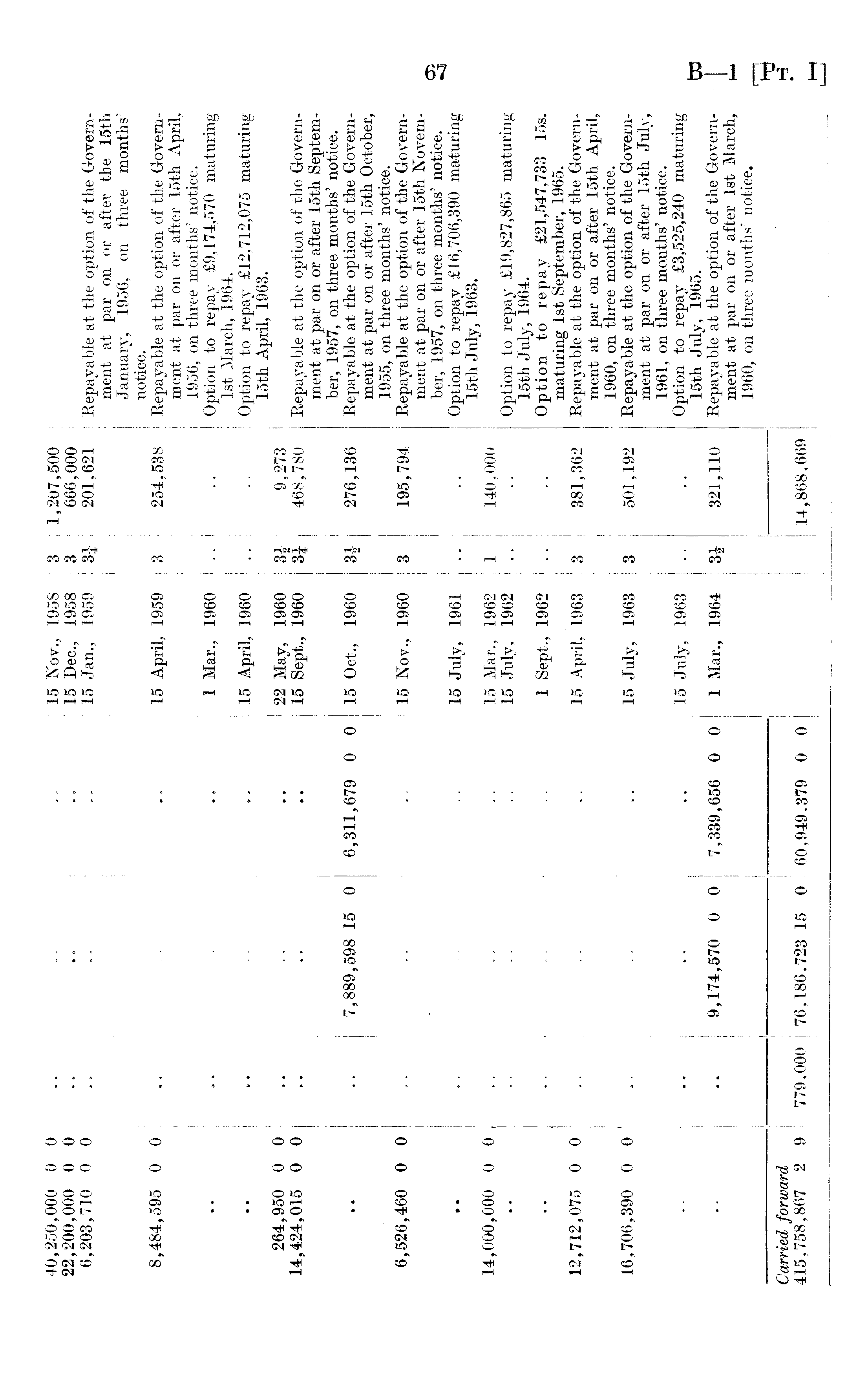40,250,000 0 0 15 Nov., 1958 3 j 1,207,500 22,200,000 0 0 » «. 15 Dec., 1958 3 666,000 6,203,710 0 0 15 Jan., 1959 3i I 201,621 Repayable at the option of the Government at par on or after the 15th January, 1956, on three months' notice. 8,484,595 0 0 15 April, 1959 3 254,538 Repayable at the option of the Government at par on or after 15th April, 1956, on three months' notice. 1 Mar., 1960 Option to repay £9,174,570 maturing 1st March, 1964. 15 April, 1960 Option to repay £12,712,075 maturing 15th April, 1963. 264,950 0 0 • • 22 May, 1960 H 9,273 14,424,015 0 0 15 Sept., 1960 H 468,780 Repayable at the option of the Government at par on or after 15th September, 1957, on three months' notice. 7,889,598 15 0 6,311,679 0 0 15 Oct., 1960 H 276,136 Repayable at the option of the Government at par on or after 15th October, 1955, on three months' notice. 6,526,460 0 0 15 Nov., 1960 3 195,794 Repayable at the option of the Government at par on or after 15th Novem- ' ber, 1957, on three months' notice. .. 15 July, 1961 Option to repay £16,706,390 maturing 15th July, 1963. 14,000,000 0 0 ! 15 Mar., 1962 1 140,000 15 July, 1962 Option to repay £19,827,865 maturing 15th July, 1964. 1 Sept., 1962 Option to repay £21,547,733 15s. maturing 1st September, 1965. 12,712,075 0 0 • 15 April, 1963 3 381,362 Repayable at the option of the Government at par on or after 15th April, 1960, on three months' notice. 16,706,390 0 0 «, . 15 July, 1963 3 501,192 Repayable at the option of the Government at par on or after 15th July, 1961, on three months' notice. 15 July, 1963 Option to repay £3,525,240 maturing 15th July, 1965. 9,174,570 0 0 7,339,656 0 0 1 Mar., 1964 3* 321,110 Repayable at the option of the Government at par on or after 1st March, 1960, on three months' notice. Carried forward 415,758,867 2 9 779,000 76,186,723 15 0 60,949,379 0 0 14,868,669