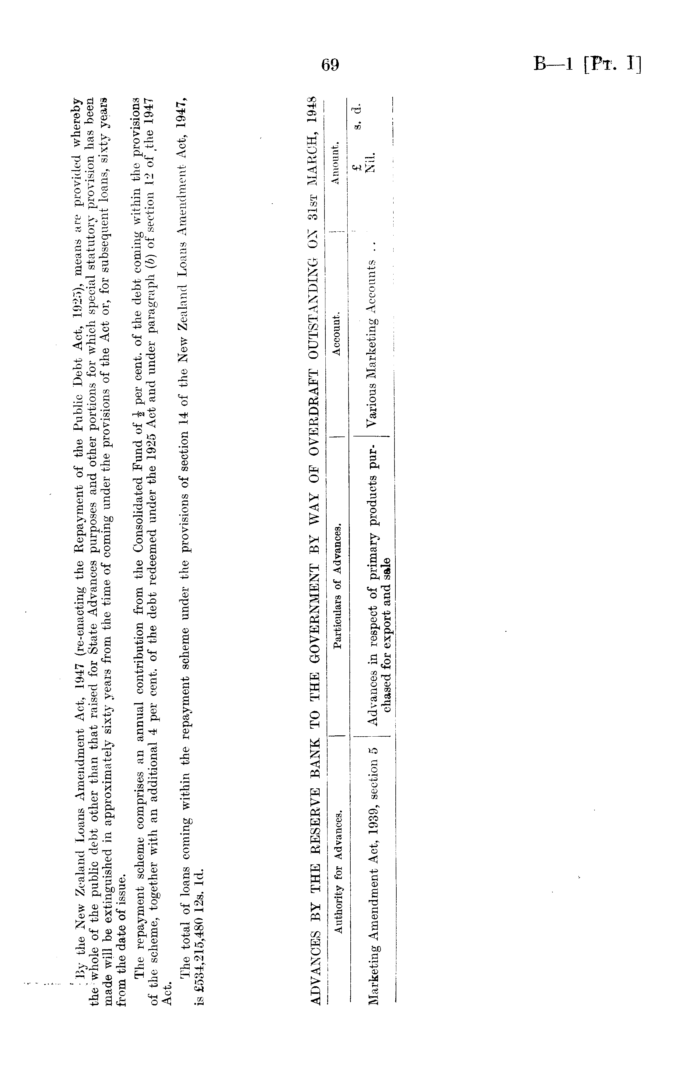 Authority for Advances. | Particulars of Advances. | Account. | Amount. 1 £ 8. d. Marketing Amendment Act, 1939, section 5 Advances in respect of primary products pur- Various Marketing Accounts .. J Nil. chased for export and sale