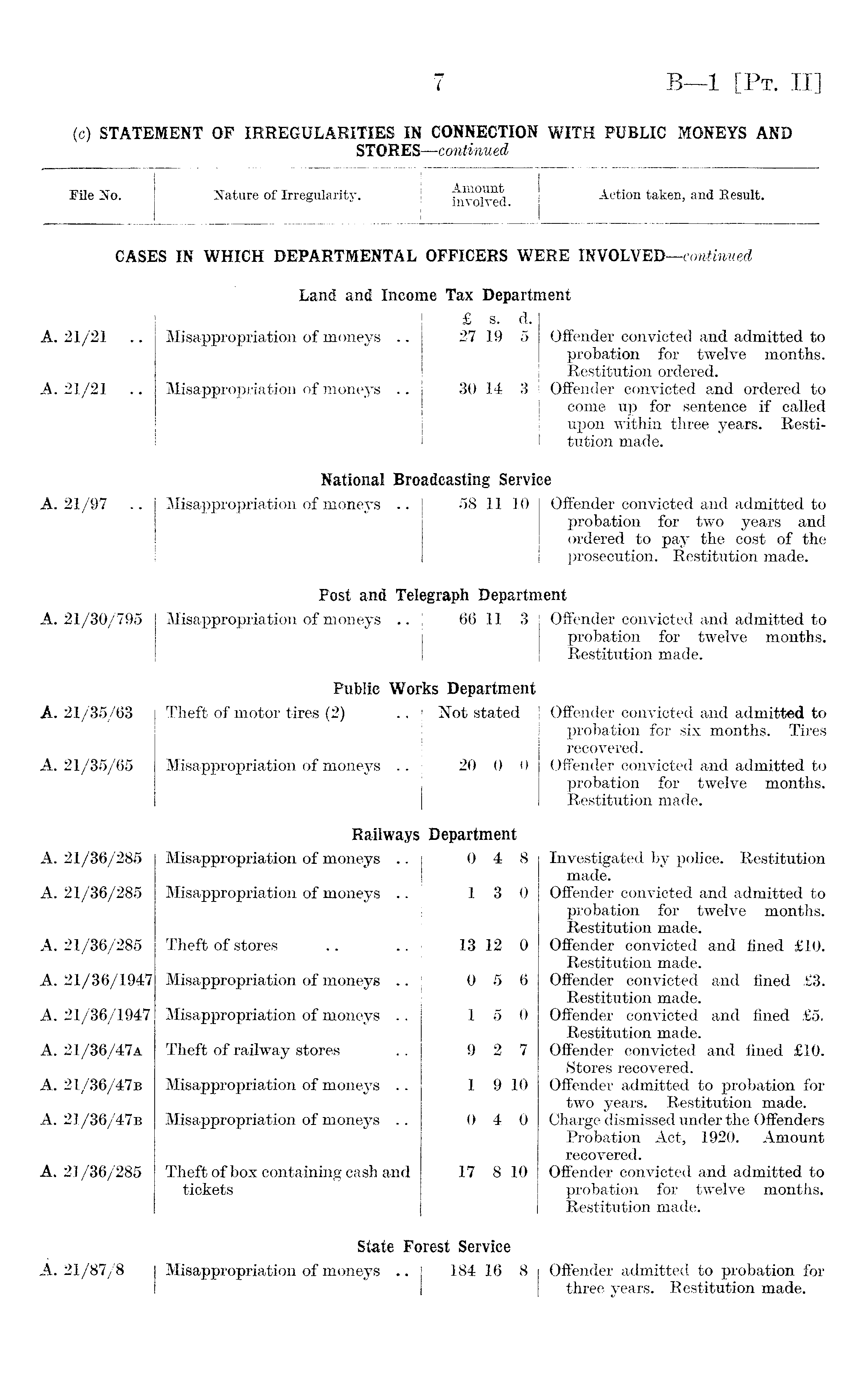 File No. Nature of Irregularity. Amount involved. Action taken, and Result. CASES IN WHICH DEPARTMENTAL OFFICERS WERE INVOLVED— continued Land and Income Tax Department A. 21/21 .. Misappropriation of moneys .. x, s. a. 27 19 5 Offender convicted and admitted to probation for twelve months. Restitution ordered. A. 21/21 .. Misappropriation of moneys .. 30 14 3 Offender convicted and ordered to come up for sentence if called upon within three years. Restitution made. National Broadcasting Service A. 21/97 .. Misappropriation of moneys .. 58 11 10 Offender convicted and admitted to probation for two years and ordered to the cost of the prosecution. Restitution made. Post and Telegraph Department A. 21/30/795 Misappropriation of moneys .. 66 11 3 Offender convicted and admitted to probation for twelve months. Restitution made. Public Works Department A. 21/35/63 Theft of-motor tires (2) Not stated Offender convicted and admitted to probation for six months. Tires recovered. A. 21/35/65 Misappropriation of moneys .. 20 0 0 Offender convicted and admitted to probation for twelve months. Restitution made. Railways Department A. 21/36/285 Misappropriation of moneys .. 0 4 8 Investigated by police. Restitution made. A. 21/36/285 Misappropriation of moneys .. 13 0 Offender convicted and admitted to probation for twelve months. Restitution made. A. 21/36/285 Theft of stores 13 12 0 Offender convicted and fined £10. Restitution made. A. 21/36/1947 Misappropriation of moneys .. 0 5 6 Offender convicted and fined £3. Restitution made. A. 21/36/1947 Misappropriation of moneys .. 1 5 0 Offender convicted and fined £5. Restitution made. A. 21/36/47A Theft of railway stores 9 2 7 Offender convicted and fined £10. Stores recovered. A. 21/36/47B Misappropriation of moneys .. 1 9 10 Offender admitted to probation for two years. Restitution made. A. 21/36/47B Misappropriation of moneys .. 0 4 0 Charge dismissed under the Offenders Probation Act, 1920. Amount recovered. A. 21/36/285 Theft of box containing cash and 17 8 10 Offender convicted and admitted to tickets probation for twelve months. Restitution made. State Fo rest Service A. 21/87/8 1 Misappropriation of moneys .. 184 16 8 Offender admitted to probation for three years. Restitution made.