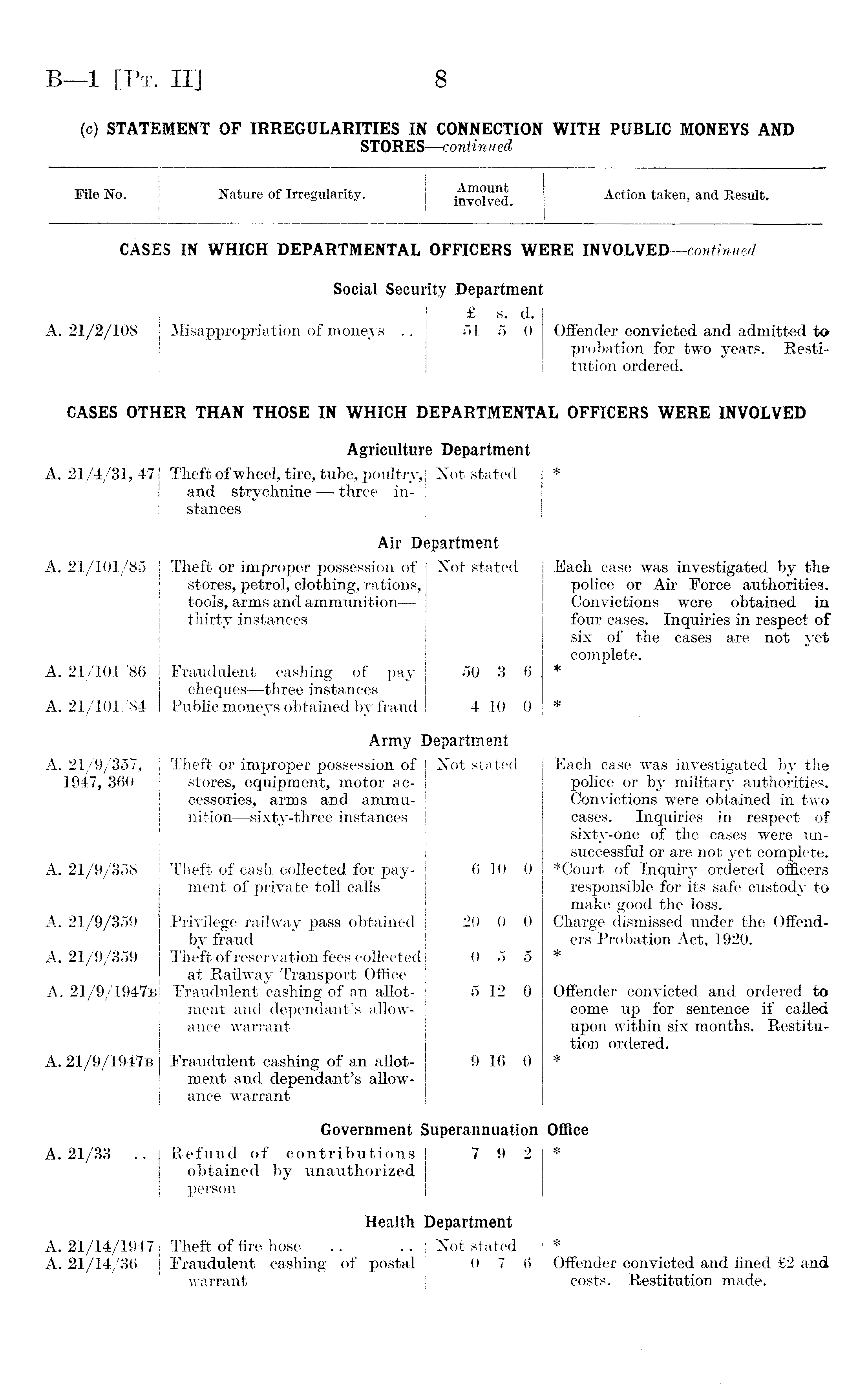 Pile No. Nature of Irregularity. Amount involved. Action taken, and Result. CASES IN WHICH DEPARTMENTAL OFFICERS WERE INVOLVED —continued Social Security Department A. 21/2/108 Misappropriation of moneys .. & s. a. 51 5 0 Offender convicted and admitted to probation for two years. Restitution ordered. CASES OTHER THAN THOSE IN WHICH DEPARTMENTAL OFFICERS WERE INVOLVED Agriculture Department A. 21/4/31,47 Theft of wheel, tire, tube, poultry, Not stated * and strychnine — three instances Air Department A. 21/101/85 Theft or improper possession of Not stated Each case was investigated by the stores, petrol, clothing, rations, police or Air Force authorities. tools, arms and ammunition— Convictions were obtained in thirty instances four cases. Inquiries in respect of six of the cases are not yet complete. A. 21/101/86 Fraudulent cashing of pay 50 3 6 * cheques—three instances A. 21/101/84 Public moneys obtained by fraud 4 10 0 * Army Department A. 21/9/357, Theft or improper possession of Not stated Each case was investigated by the 1947, 360 stores, equipment, motor acpolice or by military authorities. cessories, arms and ammuConvictions were obtained in two nition—sixty-three instances cases. Inquiries in respect of sixty-one of the cases were unsuccessful or are not yet complete. A. 21/9/358 Theft of cash collected for pay6 10 0 *Court of Inquiry ordered officers ment of private toll calls responsible for its safe custody to make good the loss. A. 21/9/359 Privilege railway pass obtained 20 0 0 Charge dismissed under the Offendby fraud ers Probation Act, 1920. A. 21/9/359 Theft of reservation fees collected 0 5 5 at Railway Transport Office A. 21/9/1947B Fraudulent cashing of an allot5 12 0 Offender convicted and ordered to ment and dependant's allowcome up for sentence if called ance warrant upon within six months. Restitution ordered. A.21/9/1947B Fraudulent cashing of an allot9 16 0 * ment and dependant's allowance warrant Government Superannuation Office A. 21/33 .. | Refund of contributions 7 9 2 * obtained by unauthorized person Health Department A. 21/14/1947 | Theft of fire hose .. Not stated * A. 21/14/36 Fraudulent cashing of postal 0 7 6 Offender convicted and fined £2 and warrant costs. Restitution made.