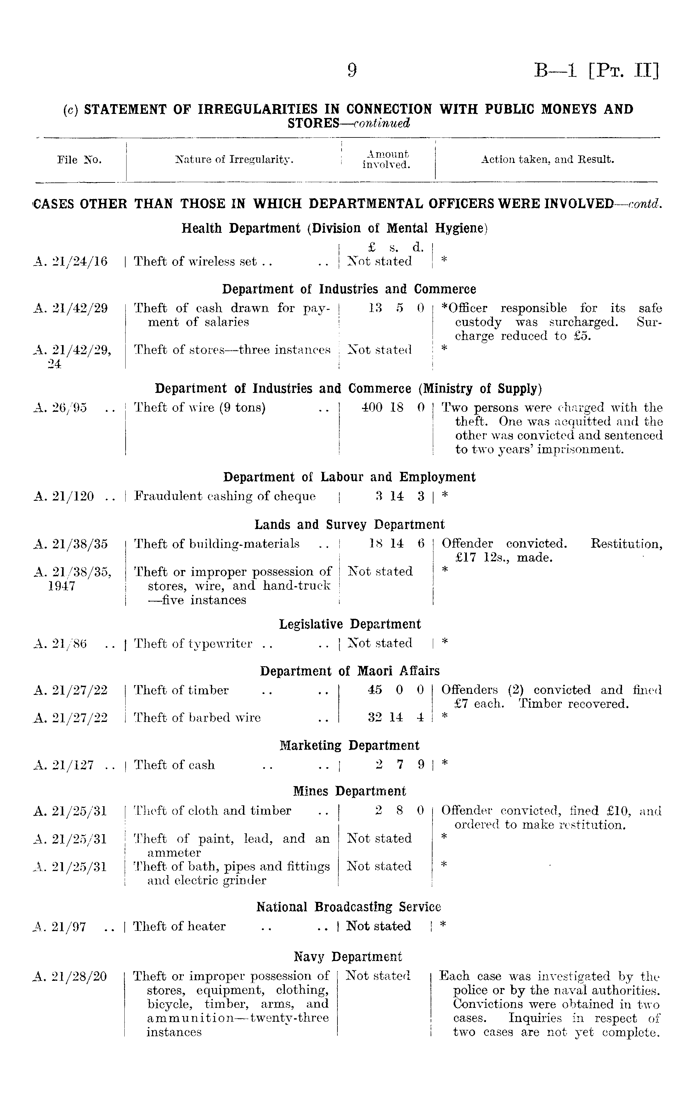 File No. Nature of Irregularity. 1 1 Amount ' involved. Action taken, and Result. €ASES OTHER THAN THOSE IN WHICH DEPARTMENTAL OFFICERS WERE INVOLVED —contd. Health Department (Division of Mental Hygiene) A. 21/24/16 Theft of wireless set x s. a. Not stated * A. 21/42/29 A. 21/42/29, 24 Department of Ind Theft of cash drawn for payment of salaries Theft of stores—three instances ustries and Coi 13 5 0 Not stated nmerce * Officer responsible for its safe custody was surcharged. Surcharge reduced to £5. * A. 26/95 .. Department of Industries anc Theft of wire (9 tons) Commerce (M 400 18 0 [inistry of Supply) Two persons were charged with the theft. One was acquitted and the other was convicted and sentenced to two years' imprisonment. A. 21/120 .. Department of Labour and Employment Fraudulent cashing of cheque | 3 14 3 | * A. 21/38/35 A. 21./38/35, 1947 Lands and Si Theft of building-materials Theft or improper possession of stores, wire, and hand-truck —five instances irvey Departme 18 14 6 Not stated nt Offender convicted. Restitution, £17 12s., made. * A. 21/86 .. J Legislative Department | Theft of typewriter .. .. | Not stated 1 * A. 21/27/22 A. 21/27/22 Department Theft of timber .. Theft of barbed wire of Maori Affaii 45 0 0 32 14 4 'S Offenders (2) convicted and fined £7 each. Timber recovered. * A. 21/127 .. Marketing Department | Theft of cash .. .. | 2 7 9 1 * A. 21/25/31 A. 21/25/31 A. 21/25/31 Mines 1 Theft of cloth and timber Theft of paint, lead, and an ammeter Theft of bath, pipes and fittings and electric grinder Department 2 8 0 Not stated Not stated Offender convicted, fined £10, and ordered to make restitution. * * A. 21/97 .. | National Broadcasting Service Theft of heater .. .. | Not stated | * A. 21/28/20 Navy I Theft or improper possession of stores, equipment, clothing, bicycle, timber, arms, and ammunition —twenty-three instances department Not stated Each case was investigated by the police or by the naval authorities. Convictions were obtained in two cases. Inquiries in respect of two cases are not yet complete.