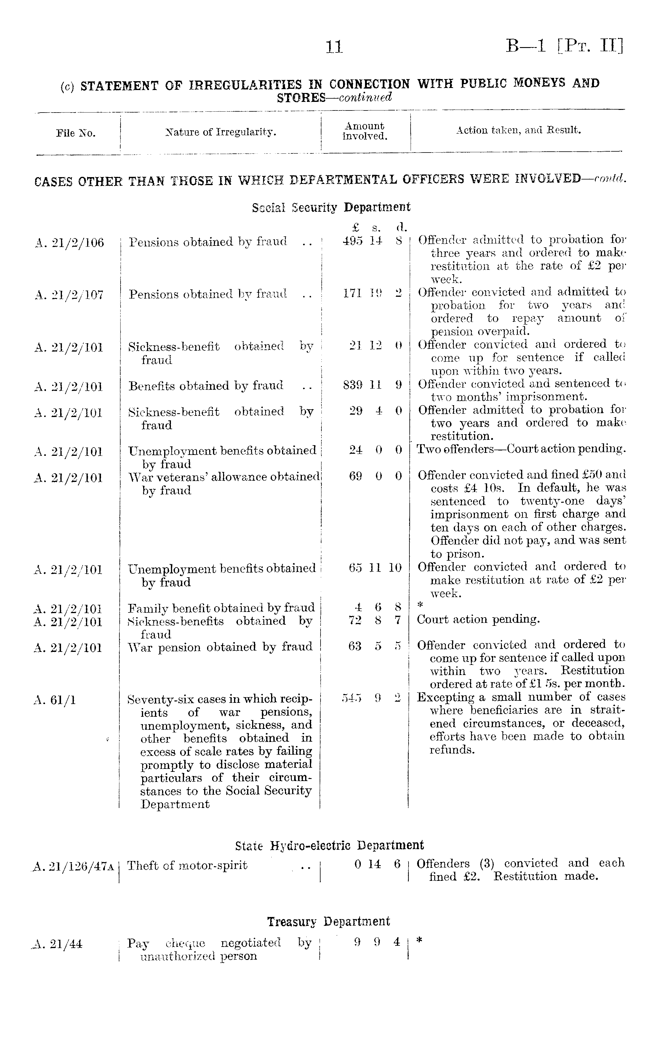 File No. Nature of Irregularity. Amount involved. Action taken, and Result. CASES OTHER THAN THOSE IN WHICH DEPARTMENTAL OFFICERS WERE INVOLVED —contd. Social Security Department A. 21/2/106 A. 21/2/107 A. 21/2/101 A. 21/2/101 A. 21/2/101 A. 21/2/101 Pensions obtained by fraud .. Pensions obtained by fraud .. Sickness-benefit obtained by fraud Benefits obtained by fraud Sickness-benefit obtained by fraud Unemployment benefits obtained by fraud War veterans' allowance obtained by fraud Unemployment benefits obtained by fraud Family benefit obtained by fraud Sickness-benefits obtained by fraud War pension obtained by fraud Seventy-six cases in which recipients of war pensions, unemployment, sickness, and other benefits obtained in excess of scale rates by failing promptly to disclose material particulars of their circumstances to the Social Security Department £ 495 171 21 839 29 24 s. 14 19 12 11 4 0 a. 8 2 0 9 0 0 Offender admitted to probation for three years and ordered to make restitution at the rate of £2 per week. Offender convicted and admitted to probation for two years and ordered to repay amount of pension overpaid. Offender convicted and ordered to come up for sentence if called upon within two years. Offender convicted and sentenced to two months' imprisonment. Offender admitted to probation for two years and ordered to make restitution. Two offenders—Court action pending. A. 21/2/101 A. 21/2/101 A. 21/2/101 A. 21/2/101 A. 21/2/101 A. 61/1 | 69 « 4 72 63 545 0 ii : 6 8 5 9 0 10 8 7 5 2 Offender convicted and fined £50 and costs £4 10s. In default, he was sentenced to twenty-one days' imprisonment on first charge and ten days on each of other charges. Offender did not pay, and was sent to prison. Offender convicted and ordered to make restitution at rate of £2 per week. * Court action pending. Offender convicted and ordered to come up for sentence if called upon within two years. Restitution ordered at rate of £1 5s. per month. Excepting a small number of cases where beneficiaries are in straitened circumstances, or deceased, efforts have been made to obtain refunds. A.21/126/47a | State Hydro-el Theft of motor-spirit „ . . estric Department 0 14 6 1 Offenders (3) convicted and each 1 fined £2. Restitution made. Treasury Department A. 21/44 Pay cheque negotiated by 1 unauthorized person 1 9 9 4 | *