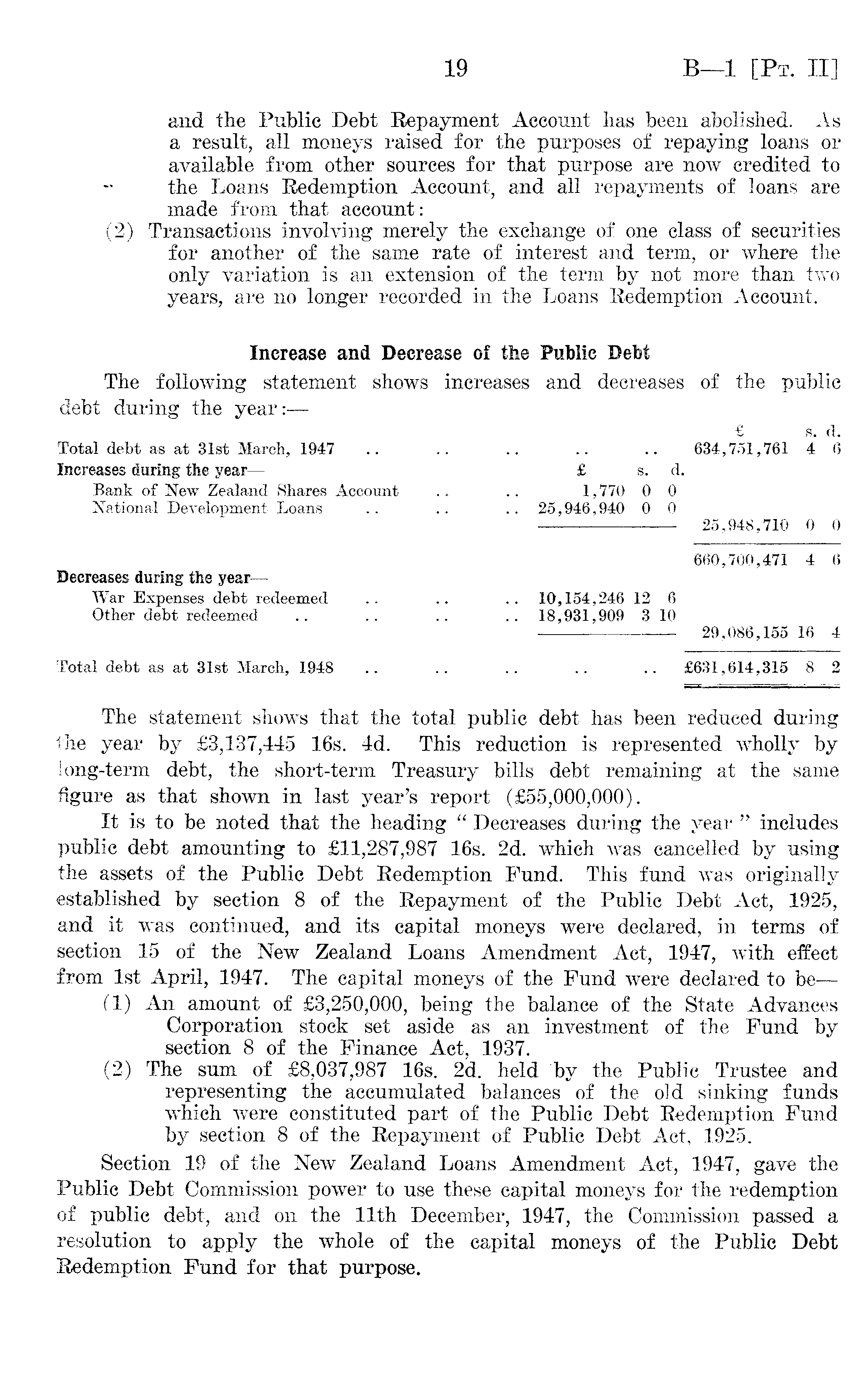 and the Public Debt Eepayment Account has been abolished. As a result, all moneys raised for the purposes of repaying loans or available from other sources for that purpose are now credited to the Loans Redemption Account, and all repayments of loans are made from that account: (2) Transactions involving merely the exchange of one class of securities for another of the same rate of interest and term, or where the only variation is an extension of the term by not more than two years, are no longer recorded in the Loans Redemption Account. Increase and Decrease of the Publie Debt The following statement shows increases and decreases of the public debt during the year:— £ s. d. Total debt as at 31st March, 1947 .. .. .. .. .. 634,751,761 4 6 Increases during the year— £ s. d. Bank of New Zealand Shares Account .. .. 1,770 0 0 National Development Loans .. .. .. 25,946,940 0 0 25,948,710 0 0 660,700,471 4 6 Decreases during the year— War Expenses debt redeemed .. .. .. 10,154,246 12 6 Other debt redeemed .. .. .. .. 18,931,909 3 10 29,086,155 16 4 Total debt as at 31st March, 1948 .. .. .. .. .. £631,614,315 8 2 The statement shows that the total public debt has been reduced during the year by £3,137,445 16s. 4d. This reduction is represented wholly by long-term debt, the short-term Treasury bills debt remaining at the same figure as that shown in last year's report (£55,000,000). It is to be noted that the heading " Decreases during the year " includes public debt amounting to £11,287,987 16s. 2d. which was cancelled by using the assets of the Public Debt Redemption Fund. This fund was originally established by section 8 of the Repayment of the Public Debt Act, 1925, and it was continued, and its capital moneys were declared, in terms of section 15 of the New Zealand Loans Amendment Act, 1947, with effect from Ist April, 1947. The capital moneys of the Fund were declared to be — (1) An amount of £3,250,000, being the balance of the State Advances Corporation stock set aside as an investment of the Fund by section 8 of the Finance Act, 1937. (2) The sum of £8,037,987 16s. 2d. held by the Public Trustee and representing the accumulated balances of the old sinking funds which were constituted part of the Public Debt Redemption Fund by section 8 of the Repayment of Public Debt Act, 1925. Section 19 of the New Zealand Loans Amendment Act, 1947, gave the Public Debt Commission power to use these capital moneys for the redemption of public debt, and on the 11th December, 1947, the Commission passed a resolution to apply the whole of the capital moneys of the Public Debt Redemption Fund for that purpose.