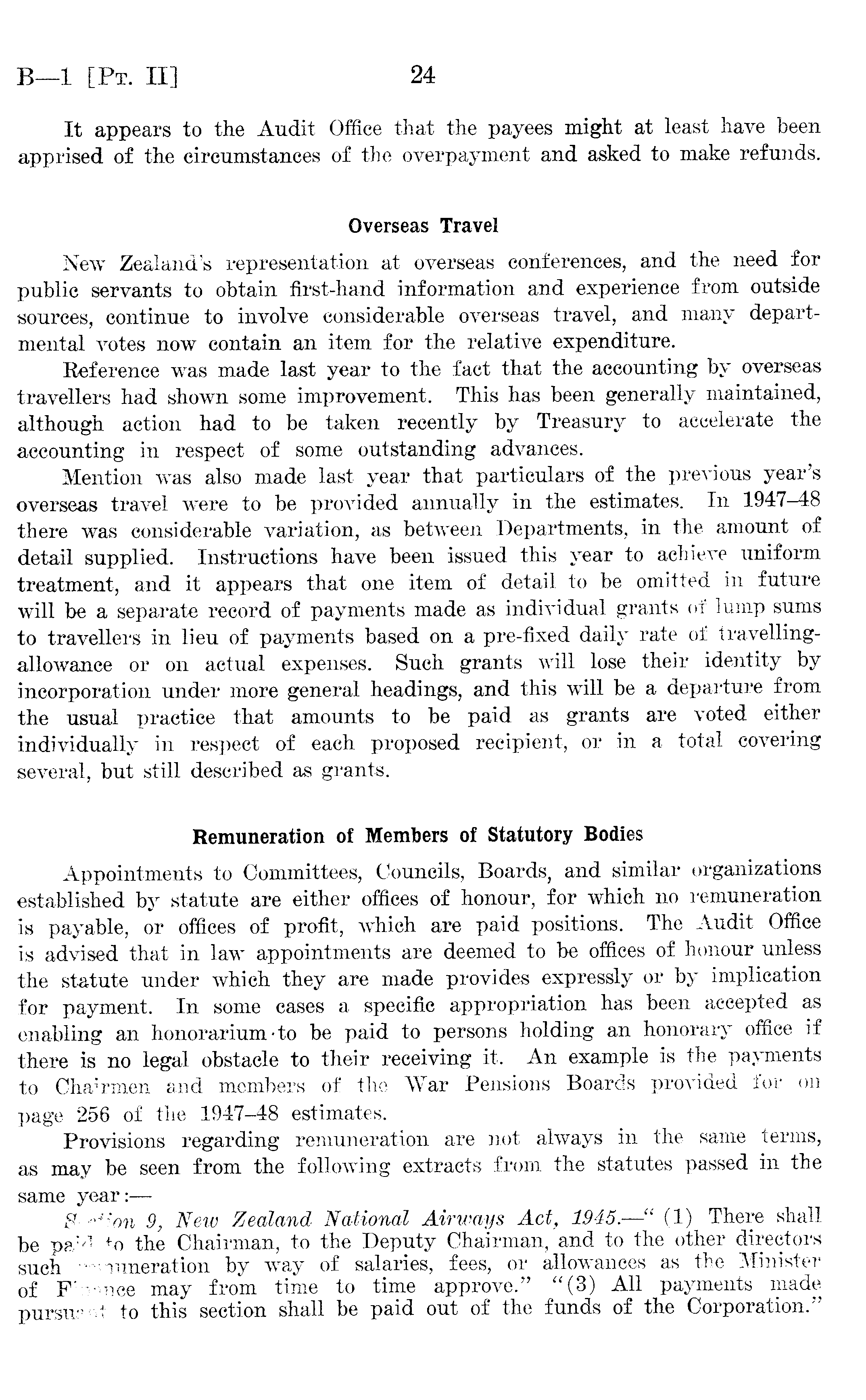 It appears to the Audit Office that the payees might at least have been apprised of the circumstances of the overpayment and asked to make refunds. Overseas Travel New Zealand's representation at overseas conferences, and the need for public servants to obtain first-hand information and experience from outside sources, continue to involve considerable overseas travel, and many departmental votes now contain an item for the relative expenditure. Reference was made last year to the fact that the accounting by overseas travellers had shown some improvement. This has been generally maintained, although action had to be taken recently by Treasury to accelerate the accounting in respect of some outstanding advances. Mention was also made last year that particulars of the previous year's overseas travel were to be provided annually in the estimates. In there was considerable variation, as between Departments, in the amount of detail supplied. Instructions have been issued this year to achieve uniform treatment, and it appears that one item of detail to be omitted in future will be a separate record of payments made as individual grants of lump sums to travellers in lieu of payments based on a pre-fixed daily rate of travellingallowance or on actual expenses. Such grants will lose their identity by incorporation under more general headings, and this will be a departure from the usual practice that amounts to be paid as grants are voted either individually in respect of each proposed recipient, or in a total covering several, but still described as grants. Remuneration of Members of Statutory Bodies Appointments to Committees, Councils, Boards, and similar organizations established by statute are either offices of honour, for which no remuneration is payable, or offices of profit, which are paid positions. The Audit Office is advised that in law appointments are deemed to be offices of honour unless the statute under which they are made provides expressly or by implication for payment. In some cases a specific appropriation has been accepted as enabling an honorarium-to be paid to persons holding an honorary office if there is no legal obstacle to their receiving it. An example is the payments to Chairmen and members of the War Pensions Boards provided for oil page 256 of the 1947-48 estimates. Provisions regarding remuneration are not always in the same terms, as may be seen from the following extracts from the statutes passed in the same year:— Section 9, New Zealand National Airways Act, 1945. —" (1) There shall be paid to the Chairman, to the Deputy Chairman, and to the other directors such remuneration by way of salaries, fees, or allowances as the Minister of Finance may from time to time approve." "(3) All payments made pursuant to this section shall be paid out of the funds of the Corporation."