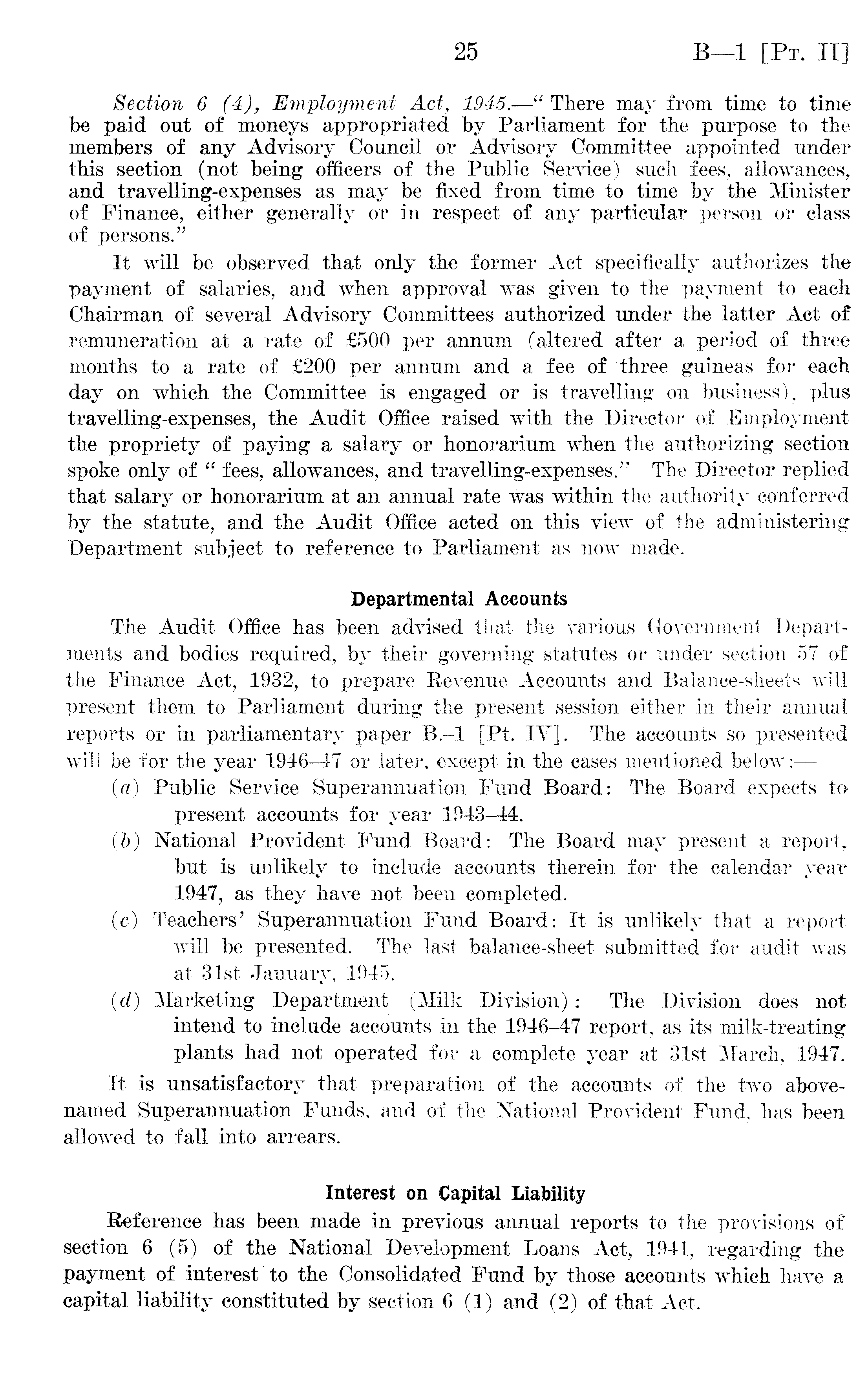 Section 6 (4), Employment Act, 1945. —" There may from time to time be paid out of moneys appropriated by Parliament for the purpose to the members of any Advisory Council or Advisory Committee appointed under this section (not being officers of the Public Service) such fees, allowances, and travelling-expenses as may be fixed from time to time by the Minister of Finance, either generally or in respect of any particular person or class of persons." It will be observed, that only the former Act specifically authorizes the payment of salaries, and when approval was given to the payment to each Chairman of several Advisory Committees authorized under the latter Act of remuneration at a rate of £5OO per annum (altered after a period of three months to a rate of £2OO per annum and a fee of three guineas for each day on which the Committee is engaged or is travelling on business), plus travelling-expenses, the Audit Office raised with the Director of Employment the propriety of paying a salary or honorarium when the authorizing section spoke only of " fees, allowances, and travelling-expenses." The Director replied that salary or honorarium at an annual rate was within the authority conferred by the statute, and the Audit Office acted on this view of the administering Department subject to reference to Parliament as now made. Departmental Accounts The Audit Office has been advised that the various Government Departments and bodies required, by their governing statutes or under section 57 of the Finance Act, 1932, to prepare Revenue Accounts and Balance-sheets will present them to Parliament during the present session either in their annual reports or in parliamentary paper 8.-l [Pt, IV]. The accounts so presented will be for the year 1946-47 or later, except in the cases mentioned below:(a) Public Service Superannuation Fund Board: The Board expects to present accounts for year 1943-44. (b) National Provident Fund Board: The Board may present a report, but is unlikely to include accounts therein for the calendar year 1947, as they have not been completed. (c) Teachers' Superannuation Fund Board: It is unlikely that a report will be presented. The last balance-sheet submitted for audit was at 31st January, 1945. (d) Marketing Department (Milk Division) : The Division does not intend to include accounts in the 1946-47 report, as its milk-treating plants had not operated for a complete year at 31st March, 1947. It is unsatisfactory that preparation of the accounts of the two abovenamed Superannuation Funds, and of the National Provident Fund, has been allowed to fall into arrears. Interest on Capital Liability Reference has been made in previous annual reports to the provisions of section 6 (5) of the National Development Loans Act, 1941, regarding the payment of interest to the Consolidated Fund by those accounts which have a capital liability constituted by section 6(1) and (2) of that Act.