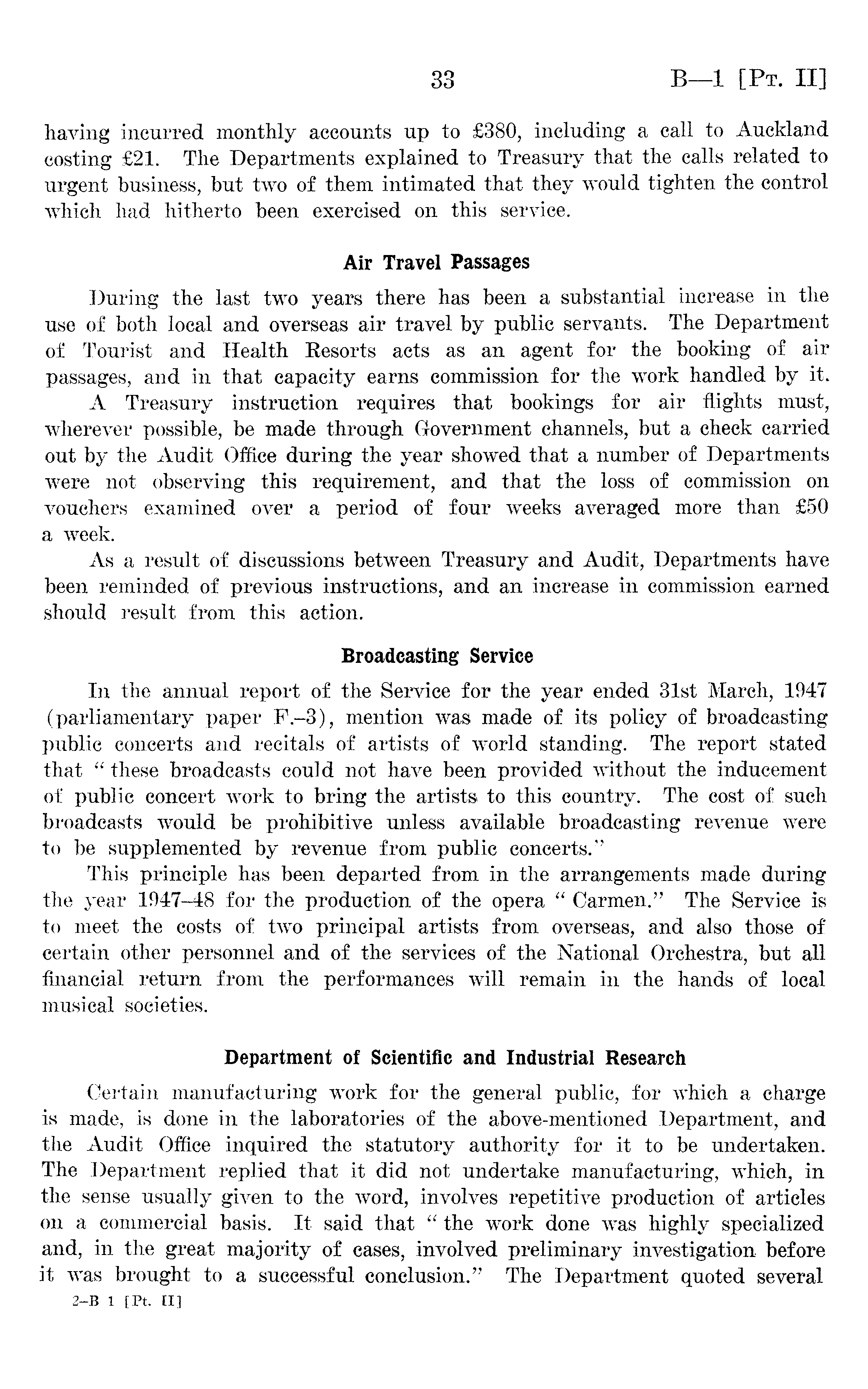 having incurred monthly accounts up to £3BO, including a call to Auckland costing £2l. The Departments explained to Treasury that the calls related to urgent business, but two of them intimated that they would tighten the control which had hitherto been exercised on this service. Air Travel Passages During the last two years there has been a substantial increase in the use of both local and overseas air travel by public servants. The Department of Tourist and Health Eesorts acts as an agent for the booking of air passages, and in that capacity earns commission for the work handled by it. A Treasury instruction requires that bookings for air nights must, wherever possible, be made through Government channels, but a cheek carried out by the Audit Office during the year showed that a number of Departments were not observing this requirement, and that the loss of commission on vouchers examined over a period of four weeks averaged more than £5O a week. As a result of discussions between Treasury and Audit, Departments have been reminded of previous instructions, and an increase in commission earned should result from this action. Broadcasting Service In the annual report of the Service for the year ended 31st March, 1947 (parliamentary paper F.-3), mention was made of its policy of broadcasting public concerts and recitals of artists of world standing. The report stated that " these broadcasts could not have been provided without the inducement of public concert work to bring the artists to this country. The cost of such broadcasts would be prohibitive unless available broadcasting revenue were to be supplemented by revenue from public concerts." This principle has been departed from in the arrangements made during the year 1947-48 for the production of the opera " Carmen." The Service is to meet the costs of two principal artists from overseas, and also those of certain other personnel and of the services of the National Orchestra, but all financial return from the performances will remain in the hands of local musical societies. Department of Scientific and Industrial Research Certain manufacturing work for the general public, for which a charge is made, is done in the laboratories of the above-mentioned Department, and the Audit Office inquired the statutory authority for it to be undertaken. The Department replied that it did not undertake manufacturing, which, in the sense usually given to the word, involves repetitive production of articles on a commercial basis. It said that " the work done was highly specialized and, in the great majority of cases, involved preliminary investigation before it was brought to a successful conclusion." The Department quoted several