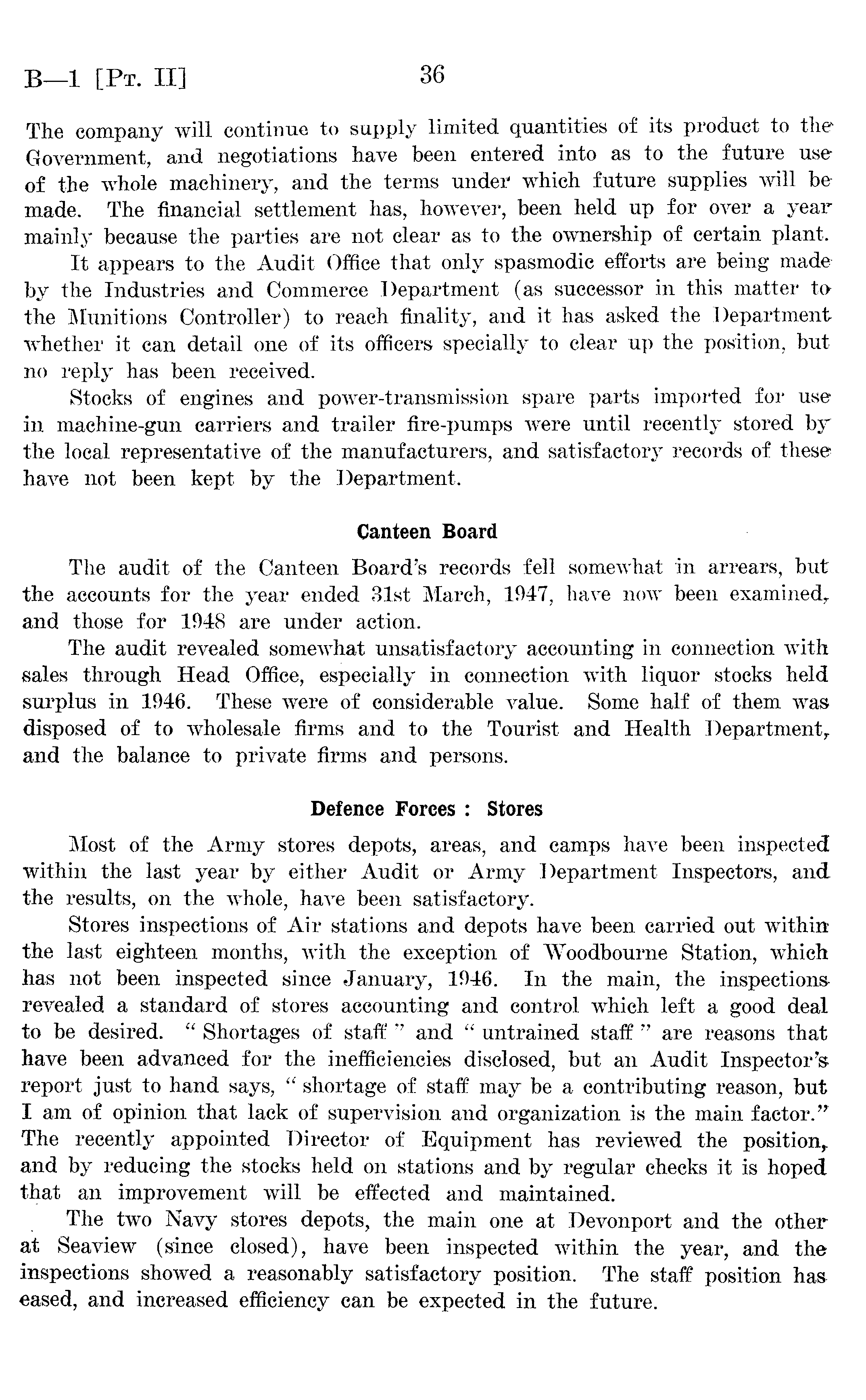 The company will continue to supply limited quantities of its product to the Government, and negotiations have been entered into as to the future use of the whole machinery, and the terms under which future supplies will be made. The financial settlement has, however, been held up for over a year mainly because the parties are not clear as to the ownership of certain plant. It appears to the Audit Office that only spasmodic efforts are being made by the Industries and Commerce Department (as successor in this matter to the Munitions Controller) to reach finality, and it has asked the Department whether it can detail one of its officers specially to clear up the position, but no reply has been received. Stocks of engines and power-transmission spare parts imported for use in machine-gun carriers and trailer fire-pumps were until recently stored by the local representative of the manufacturers, and satisfactory records of these have not been kept by the Department. Canteen Board The audit of the Canteen Board's records fell somewhat in arrears, but the accounts for the year ended 31st March, 1947, have now been examined,, and those for 1948 are under action. The audit revealed somewhat unsatisfactory accounting in connection with sales through Head Office, especially in connection with liquor stocks held surplus in 1946. These were of considerable value. Some half of them was disposed of to wholesale firms and to the Tourist and Health Department,, and the balance to private firms and persons. Defence Forees : Stores Most of the Army stores depots, areas, and camps have been inspected within the last year by either Audit or Army Department Inspectors, and the results, on the whole, have been satisfactory. Stores inspections of Air stations and depots have been carried out within the last eighteen months, with the exception of Woodbourne Station, which has not been inspected since January, 1946. In the main, the inspections revealed a standard of stores accounting and control which left a good deal to be desired. " Shortages of staff " and " untrained staff " are reasons that have been advanced for the inefficiencies disclosed, but an Audit Inspector'sreport just to hand says, " shortage of staff may be a contributing reason, but I am of opinion that lack of supervision and organization is the main factor." The recently appointed Director of Equipment has reviewed the position,, and by reducing the stocks held on stations and by regular checks it is hoped that an improvement will be effected and maintained. The two Navy stores depots, the main one at Devonport and the other at Seaview (since closed), have been inspected within the year, and the inspections showed a reasonably satisfactory position. The staff position has eased, and increased efficiency can be expected in the future.