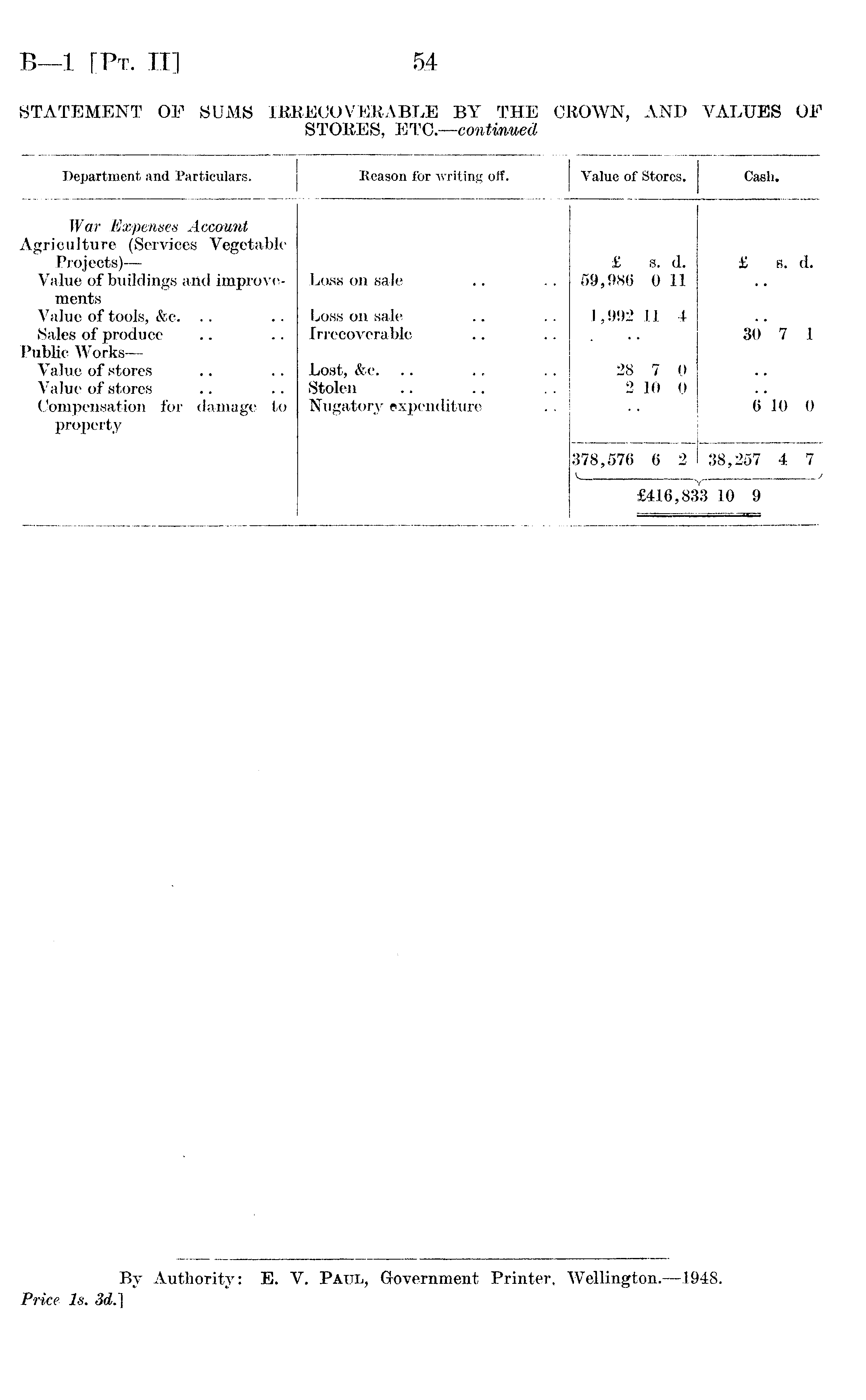 Department and Particulars. Reason for writing off. Value of Stores. Cash. War Expenses Account Agriculture (Services Vegetable Projects)— Value of buildings and improvements Value of tools, &c. Sales of produce Public Works— Value of stores Value of stores Compensation for damage to property Loss on sale Loss on sale .. Irrecoverable Lost, &e. Stolen Nugatory expenditure £ s. d. 59,986 0 11 1,992 11 4 28 7 0 2 10 0 £ s. d. 30* 7 1 6 10 0 378,576 6 2 1 38,257 4 7 £416,833 10 9