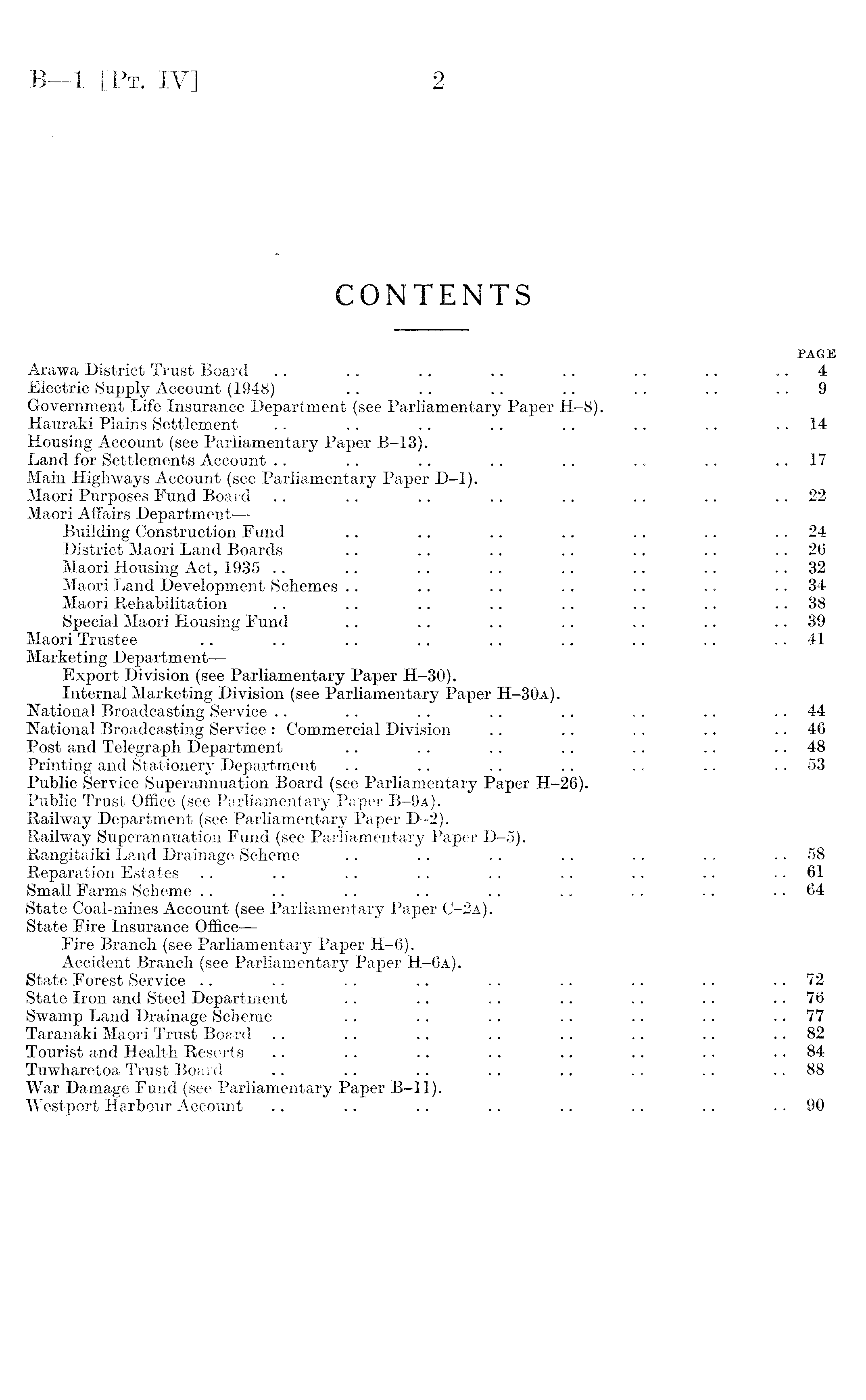 PAGE Arawa District Trust Board .. .. .. .. .. .. .. 4 Electric Supply Account (1948) .. .. .. .. .. .. 9 Government Life Insurance Department (see Parliamentary Paper H-8). Hauraki Plains Settlement .. .. .. .. .. .. .. .. 14 Housing Account (see Parliamentary Paper B-13). Land for Settlements Account .. .. .. .. .. .. .. 17 Main Highways Account (see Parliamentary Paper D-l). Maori Purposes Fund Board .. .. . .. .. .. .. .. 22 Maori Affairs Department— Building Construction Fund .. .. .. .. .. i. 24 District Maori Land Boards .. .. .. .. .. .. 26 Maori Housing Act, 1935 .. .. .. .. .. .. .. 32 Maori Land Development Schemes .. .. .. .. .. . - .. 34 Maori Rehabilitation .. .. .. .. .. .. .. 38 Special Maori Housing Fund .. .. .. .. .. .. 39 Maori Trustee .. .. .. .. .. .. .. .. .. 41 Marketing Department— Export Division (see Parliamentary Paper H-30). Internal Marketing Division (see Parliamentary Paper H-30a). National Broadcasting Service .. .. .. .. .. .. .. 44 National Broadcasting Service : Commercial Division .. .. .. .. .. 46 Post and Telegraph Department .. .. .. .. .. .. .. 48 Printing and Stationery Department .. .. .. .. .. .. 53 Public Service Superannuation Board (see Parliamentary Paper H-26). Public Trust Office (see Parliamentary Paper B-9a). Railway Department (see Parliamentary Paper D-2). Railway Superannuation Fund (see Parliamentary Paper D-5). Rangitaiki Land Drainage Scheme .. .. .. .. .. .. .. 58 Reparation Estates .. .. .. .. .. .. .. .. 61 Small Farms Scheme .. .. .. .. .. .. .. .. 64 State Coal-mines Account (see Parliamentary Paper C-2a). State Fire Insurance Office — Fire Branch (see Parliamentary Paper H-6). Accident Branch (see Parliamentary Paper H-6a). State Forest Service .. .. .. .. .. .. .. .. .. 72 State Iron and Steel Department .. .. .. .. .. .. 76 Swamp Land Drainage Scheme .. .. .. .. .. .. 77 Taranaki Maori Trust Board .. .. .. .. .. .. .. 82 Tourist and Health Resorts .. .. .. .. .. .. .. .. 84 Tuwharetoa Trust Board .. .. .. .. .. .. .. 88 War Damage Fund (see Parliamentary Paper B-ll). Westport Harbour Account .. .. .. .. .. .. .. .. 90