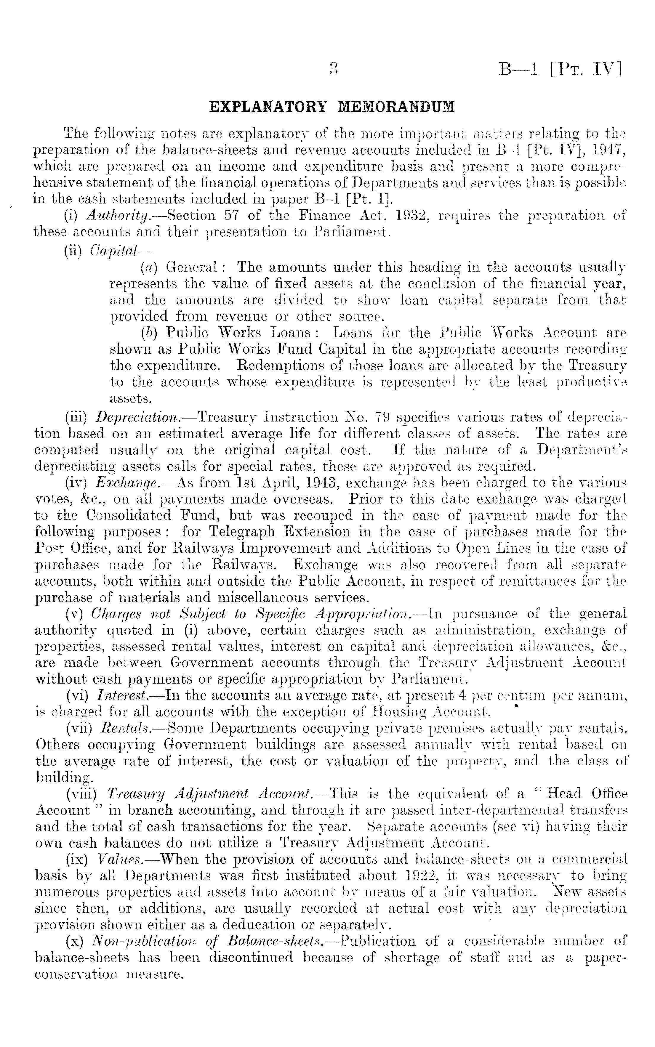 EXPLANATORY MEMORANDUM The following notes are explanatory of the more important matters relating to the preparation of the balance-sheets and revenue accounts included in B-l [Pt. IV], 1947, which are prepared on an income and expenditure basis and present a more comprehensive statement of the financial operations of Departments and services than is possible in the cash statements included in paper B-l [Pt. I]. (i) Authority.—Section 57 of the Finance Act, 1932, requires the preparation of these accounts and their presentation to Parliament. (ii) Capital—(a) General: The amounts under this heading in the accounts usually represents the value of fixed assets at the conclusion of the financial year, and the amounts are divided to show loan capital separate from that provided from revenue or other source. (b) Public Works Loans : Loans for the Public Works Account are shown as Public Works Fund Capital in the appropriate accounts recording the expenditure. Redemptions of those loans are allocated by the Treasury to the accounts whose expenditure is represented by the least productive assets. (iii) Depreciation. —Treasury Instruction No. 79 specifies various rates of depreciation based on an estimated average life for different classes of assets. The rates are computed usually on the original capital cost. If the nature of a Department's depreciating assets calls for special rates, these are approved as required. (iv) Exchange.—As from Ist April, 1943, exchange has been charged to the various votes, &c., on all payments made overseas. Prior to this date exchange was charged to the Consolidated Fund, but was recouped in the case of payment made for the following purposes : for Telegraph Extension in the case of purchases made for the Post Office, and for Railways Improvement and Additions to Open Lines in the case of purchases made for the Railways. Exchange was also recovered from all separate accounts, both within and outside the Public Account, in respect of remittances for the purchase of materials and miscellaneous services. (v) Charges not Subject to Specific Appropriation.—ln pursuance of the general authority quoted in (i) above, certain charges such as administration, exchange of properties, assessed rental values, interest on capital and depreciation allowances, &c., are made between Government accounts through the Treasury Adjustment Account without cash payments or specific appropriation by Parliament. (vi) Interest. —In the accounts an average rate, at present 4 per centum per annum, is charged for all accounts with the exception of Housing Account. (vii) Rentals.—Some Departments occupying private premises actually pay rentals. Others occupying Government buildings are assessed annually with rental based on the average rate of interest, the cost or valuation of the property, and the class of building. (viii) Treasury Adjustment Account. —This is the equivalent of a Head Office Account " in branch accounting, and through it are passed inter-departmental transfers and the total of cash transactions for the year. Separate accounts (see vi) having their own cash balances do not utilize a Treasury Adjustment Account. (ix) Values. —When the provision of accounts and balance-sheets on a commercial basis by all Departments was first instituted about 1922, it was necessary to bring numerous properties and assets into account by means of a fair valuation. New assets since then, or additions, are usually recorded at actual cost with any depreciation provision shown either as a deducation or separately. (x) Non-publication of Balance-sheets. —Publication of a considerable number of balance-sheets has been discontinued because of shortage of staff and as a paperconservation measure.