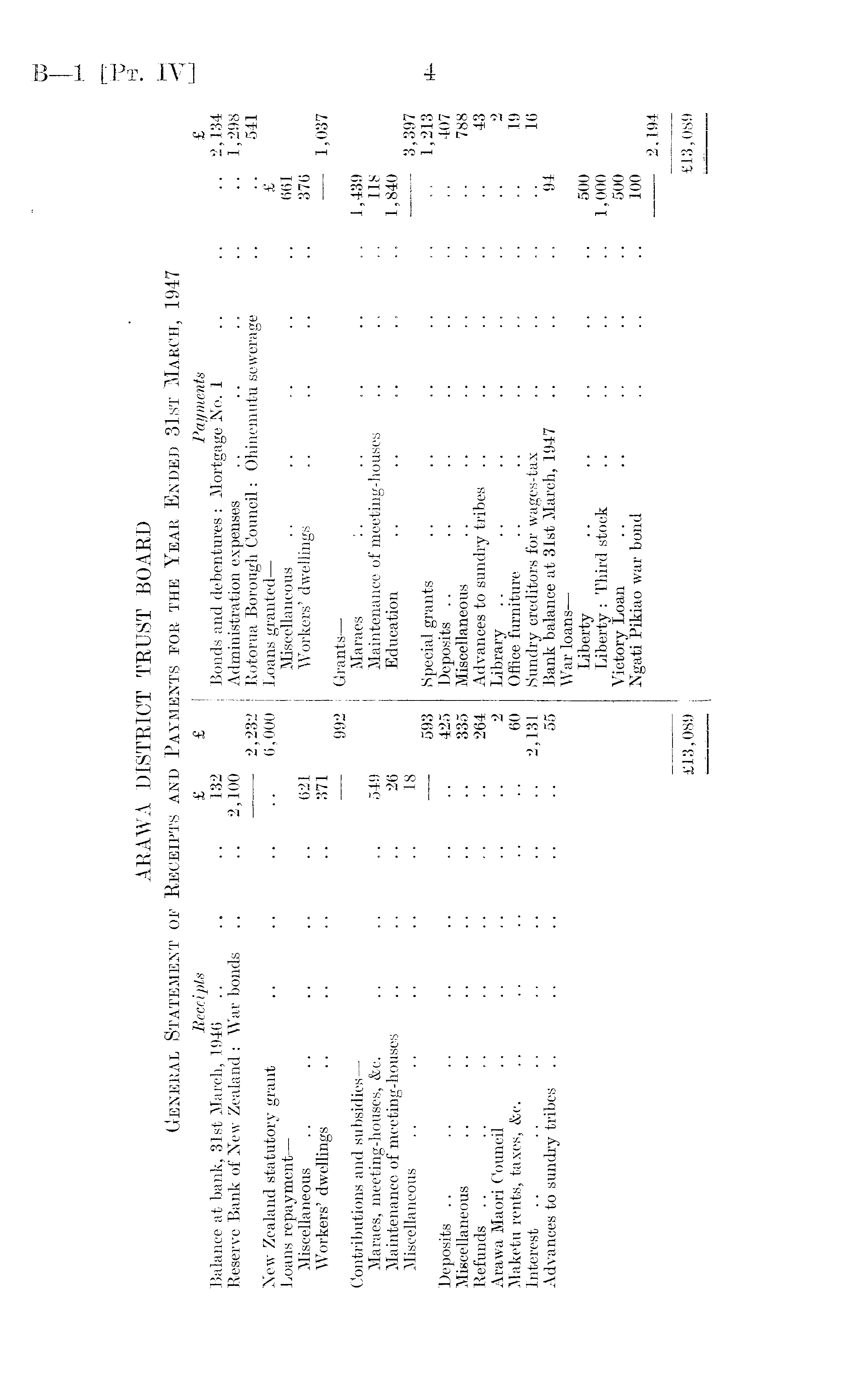 ARAWA DISTRICT TRUST BOARD General Statement oe Receipts and Payments for the Year Ended 31st March, 1947 Receipts £ £ Payments , £ Balance at bank, 31st March, 1946 .. .. .. 132 Bonds and debentures: Mortgage No. 1 .. .. .. 2,134 Reserve Bank of New Zealand : War bonds .. .. 2,100 Administration expenses .. .. .. .. .. 1,298 2,232 Rotorua Borough Council: Ohinemutu sewerage .. .. 541 New Zealand statutory grant .. .. .. .. 6,000 Loans granted—- £ Loans repayment— Miscellaneous .. .. .. .. .. 661 Miscellaneous .. .. .. .. .. 621 Workers' dwellings .. .. .. .. 376 Workers' dwellings ........ 371 1,037 992 Grants— Contributions and subsidies— Maraes . .. .. .. .. 1,439 Maraes, meeting-houses, &c. .. .. .. 549 Maintenance of meeting-houses .. .. .. 118 Maintenance of meeting-houses .. .. .. 26 Education .. .. .. . . .. 1,840 Miscellaneous .......... 18 3,397 593 Special grants .. .. .. .. .. .. 1,213 Deposits .. .. .. .. .. .. .. 425 Deposits .. .. .. .. .. .. . . 407 Miscellaneous .. .. .. .. .. .. 335 Miscellaneous .. .. .. . . . . .. 788 Refunds .. .. .. .. .. . . .. 264 Advances to sundry tribes .. .. .. .. . . 43 Arawa Maori Council .. .. .. .. .. 2 Library .. .. .. .. .. . . . . 2 Maketu rents, taxes, &c. .. .. .. . . .. 60 Office furniture .. .. . . .. .. .. 19 Interest .. .. .. .. .. .. .. 2,131 Sundry creditors for wages-tax .. .. .. .. 16 Advances to sundry tribes . . .. .. . . .. 55 Bank balance at 31st March, 1947 .. . . . . 94 War loans— Liberty .. .. .. .. .. 500 Liberty : Third stock .. .. . . . . 1,000 Victory Loan .. .. . . .. .. 500 Ngati Pikiao war bond .. .. .. 100 2,194 £13,089 £13,089