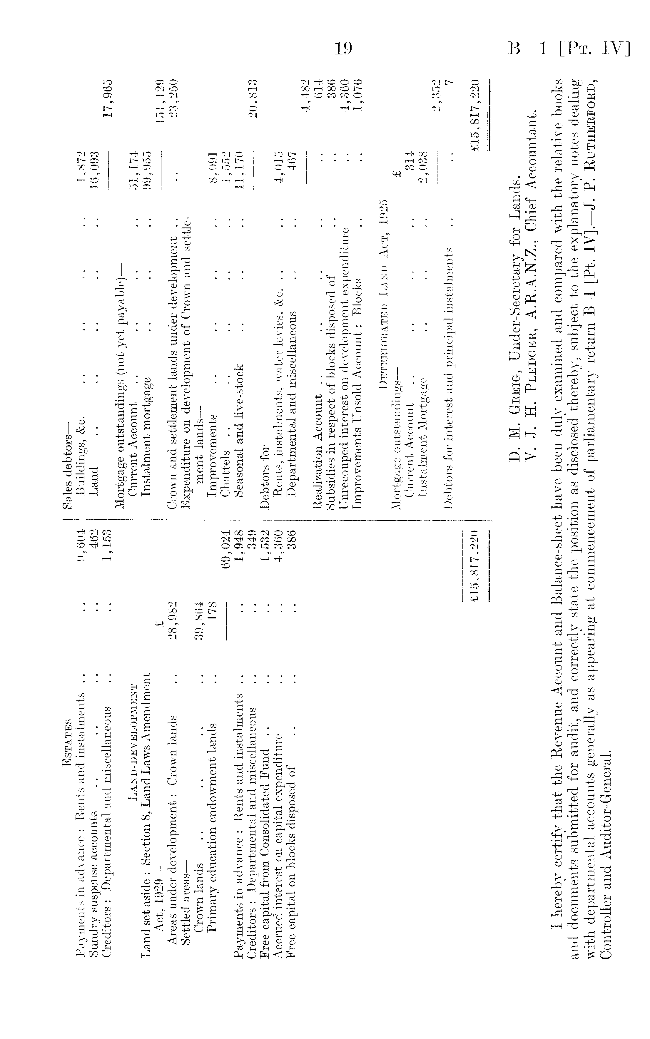 Estates I Sales debtors— Payments in advance : Rents and instalments .. .. 9,604 Buildings, &c. .. .. .. .. 1,872 Sundry suspense accounts .. .. .. .. 462 Land .. .. .. .. .. 16,093 Creditors: Departmental and miscellaneous .. .. 1,153 17,965 Mortgage outstandings (not yet payable)— Land-development Current Account .. .. .. .. 51,174 Land set aside: Section 8, Land Laws Amendment Instalment mortgage .. . . .. 99,955 Act, 1929 £ 151,129 Areas under development: Crown lands .. 28,982 Crown and settlement lands under development .. .. 23,250 Settled areas— Expenditure on development of Crown and settleCrown lands .. .. .. .. 39,864 ment lands— Primary education endowment lands .. 178 Improvements .. .. .. .. 8,091 69,024 Chattels .. .. .. .. .. 1,552 Payments in advance: Rents and instalments .. .. 1,948 ( Seasonal and live-stock .. .. .. 11,170 Creditors: Departmental and miscellaneous .. .. 349 | 20,813 Free capital from Consolidated Fund .. .. . . 1,532 Debtors for— Accrued interest on capital expenditure .. .. 4,360 Rents, instalments, water levies, &c. .. .. 4,015 Free capital on blocks disposed of .. .. .. 386 Departmental and miscellaneous .. . . 467 4,482 Realization Account .. .. .. .. .. 614 Subsidies in respect of blocks disposed of .. .. 386 Unrecouped interest on development expenditure .. 4,360 Improvements Unsold Account: Blocks .. .. 1,076 Deteriorated Land Act, 1925 Mortgage outstandings— £ Current Account .. .. . . . . 314 Instalment Mortgage .. .. .. 2,038 2,352 Debtors for interest and principal instalments .. .. 7 £15,817,220 £15,817,220 D. M. (xREiG, Under-Secretary for Lands. V. J. H. Pledger, A.R.A.N.Z., Chief Accountant. I hereby certify that the Revenue Account and Balance-sheet have been duly examined and compared with the relative books and documents submitted for audit, and correctly state the position as disclosed thereby, subject to the explanatory notes dealing with departmental accounts generally as appearing at commencement of parliamentary return B-l [Pt. IV].— J. P. Rutherford, Controller and Auditor-General.