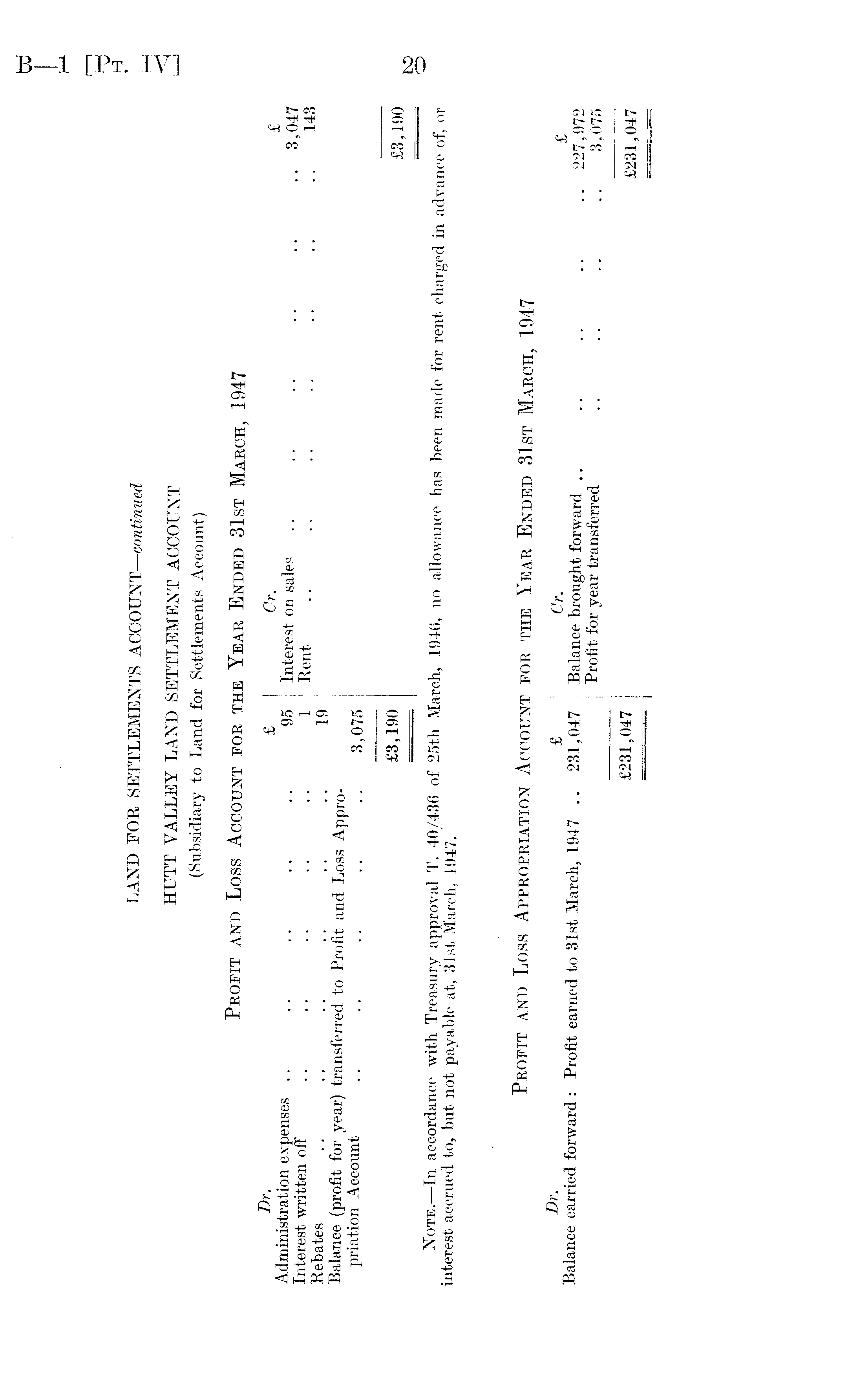 LAND FOR SETTLEMENTS ACCOUNT— continued HUTT VALLEY LAND SETTLEMENT ACCOUNT (Subsidiary to Land for Settlements Account) Profit and Loss Account for the Year Ended 31st March, 1947 £ Cr. £ Administration expenses .. .. .. .. .. 95 Interest on sales .. .. .. 3 0 47 Interest written off .. .. .. ~ ~ 1 Rent .. '' * • • > Rebates .. .. .. ~ ~ ~ 19 '' '' '' '' '' " " 0 Balance (profit for year) transferred to Profit and Loss Appropriation Account .. .. ~ ~ ~ 3 075 £3,190 £3,190 . , Note. In accordance with Treasury approval T. 40/436 of 25th March, 1946, no allowance has been made for rent charged in advance of or interest accrued to, but not payable at, 31st March, 1947. Profit and Loss Appropriation Account for the Year Ended 31st March, 1947 t> ■ ® r ' £ Balance carried forward : Profit earned to 31st March, 1947 .. 231,047 I Balance brought forward .. .. .. .. ..227,972 Profit for year transferred .. .. .. ~ 3 ; 075 £231,047 £231,047