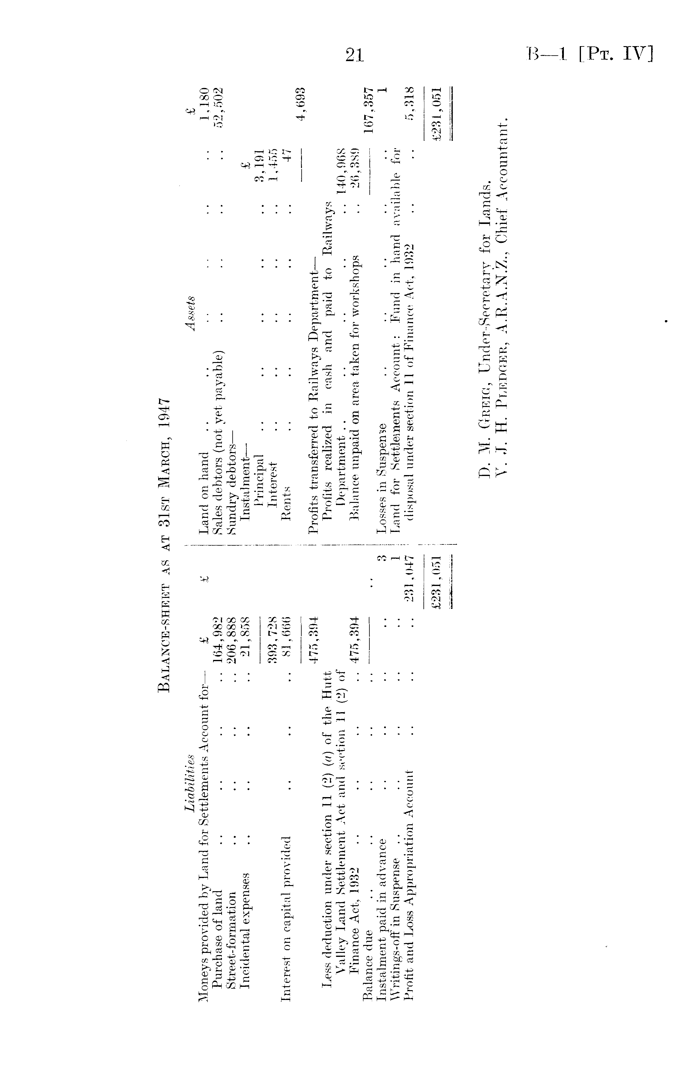 Balance-sheet as at 31st March, 1947 Liabilities Assets £ Moneys provided by Land for Settlements Account for— £ £ Land on hand .. .. . . ~ .. ~ 1,180 Purchase of land .. .. . . .. 164,982 Sales debtors (not yet payable) .. .. .. .. 52,502 Street-formation .. . . .. .. 206, 888 Sundry debtors— Incidental expenses .. .. .. .. 21,858 Instalment— £ Principal .. .. .. .. .. 3,191 393,728 Interest .. .. .. .. .. 1,455 Interest on capital provided .. .. .. 81,666 Rents .. .. .. .. .. 47 4,693 475,394 Profits transferred to Railways Department— Less deduction under section 11 (2) (a) of the Hutt Profits realized in cash and paid to Railways Valley Land Settlement Act and section 11 (2) of Department .. .. .. .. . . 140,968 Finance Act, 1932 .. .. .. .. 475,394 Balance unpaid on area taken for workshops .. 26,389 Balance due .. .. .. .. .. .. 167,357 Instalment paid in advance .. .. .. .. 3 Losses in Suspense .. .. .. .. .. 1 Writings-off in Suspense .. .. .. .. .. 1 Land for Settlements Account: Fund in hand available for Profit and Loss Appropriation Account .. .. .. 231,047 disposal under section 11 of Finance Act, 1932 .. .. 5,318 £231,051 £231,051 D. M. Greig, Under-Secretary for Lands. Y. -T. H. Pledger, A.R.A.N.Z., Chief Accountant.