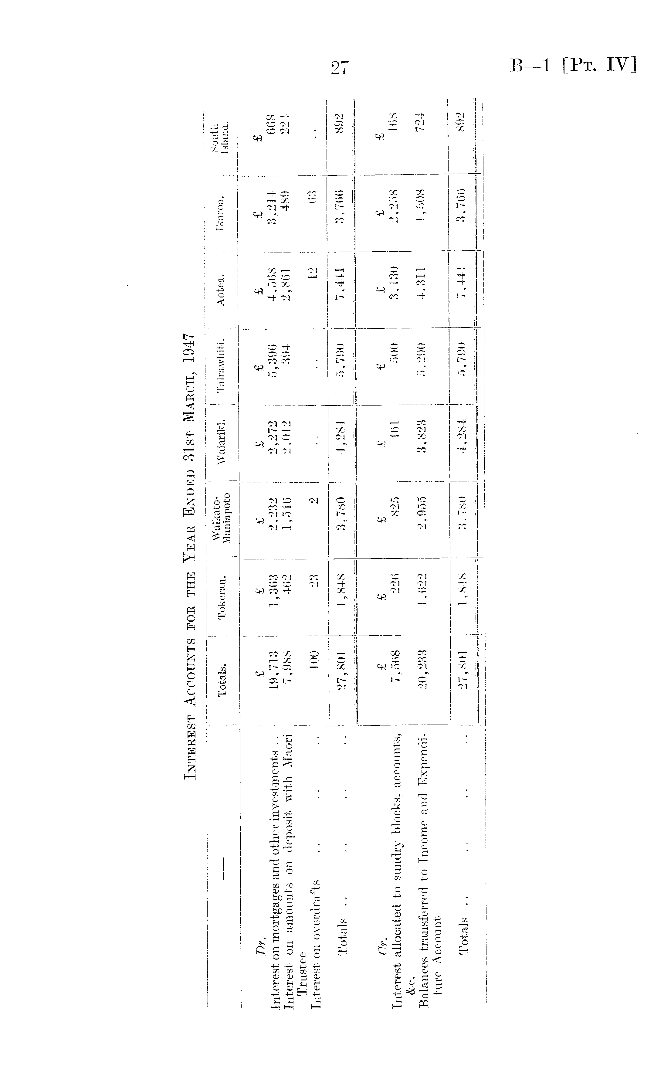 — Totals. Tokerau. WaikatoManiapoto Waiariki. Tairawliiti. Aotea. Ikaroa. South Island. Dr. Interest on mortgages and other investments .. Interest on amounts on deposit with Maori Trustee Interest on overdrafts £ 19,713 7,988 100 £ 1,363 462 23 £ 2,232 1,546 2 £ 2,272 2,012 £ 5,396 394 £ 4,568 2,861 12 £ 3,214 489 63 £ 668 224 Totals 27,801 1,848 3,780 4,284 5,790 7,441 3,766 892 Gr. Interest allocated to sundry blocks, accounts, &c. Balances transferred to Income and Expenditure Account GO C+3 1Q 1> £ 226 £ 825 £ 461 £ 500 £ 3,130 £ 2,258 £ 168 20,233 1,622 2,955 3,823 5,290 4,311 1,508 724 Totals 27,801 1,848 3,780 4,284 5,790 7,441 3,766 892 -