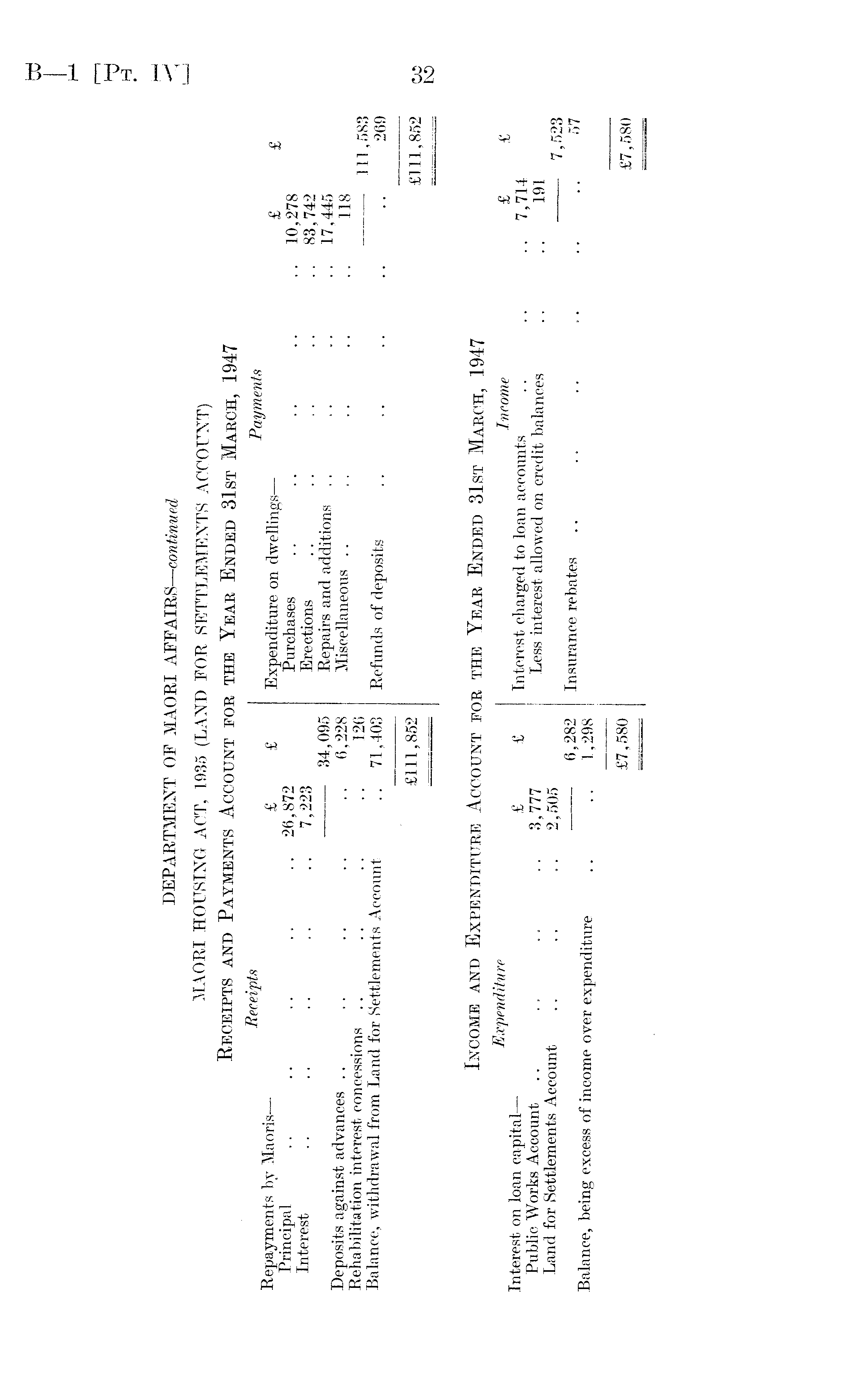 DEPARTMENT OF MAORI AFFAIRS— continued MAORI HOUSING ACT, .1935 (LAND FOR SETTLEMENTS ACCOUNT) Receipts and Payments Account foe the Year Ended 31st March, 1947 Receipts Payments Repayments by Maoris— £ £ Expenditure on dwellings— £ £ Principal .. .. .. .. .. 26,872 Purchases .. .. .. .. .. 10,278 Interest .. .. .. . . ~ 7,223 Erections .. .. . . ~ , . 83,742 34,095 Repairs and additions . . . . .. 17 445 Deposits against advances .. .. .. .. .. 6,228 Miscellaneous .. .. .. .. .. 118 Rehabilitation interest concessions .. .. .. 126 ] ] ] 583 Balance, withdrawal from Land for Settlements Account .. 71,403 Refunds of deposits .. .. .. .. '269 £lll >852 £11M52 Income and Expenditure Account for the Year Ended 31st March, 1947 Expenditure Income £ £ Interest on loan capital— £ £ Interest charged to loan accounts .. . . .. 7,714 Public Works Account .. .. .. 3,777 Less interest allowed on credit balances .. .. 191 Land for Settlements Account .. . . .. 2,505 7 523 6,282 Insurance rebates .. .. .. .. ~ ~ 57 Balance, being excess of income over expenditure .. .. 1,298 £7,580 £7,580