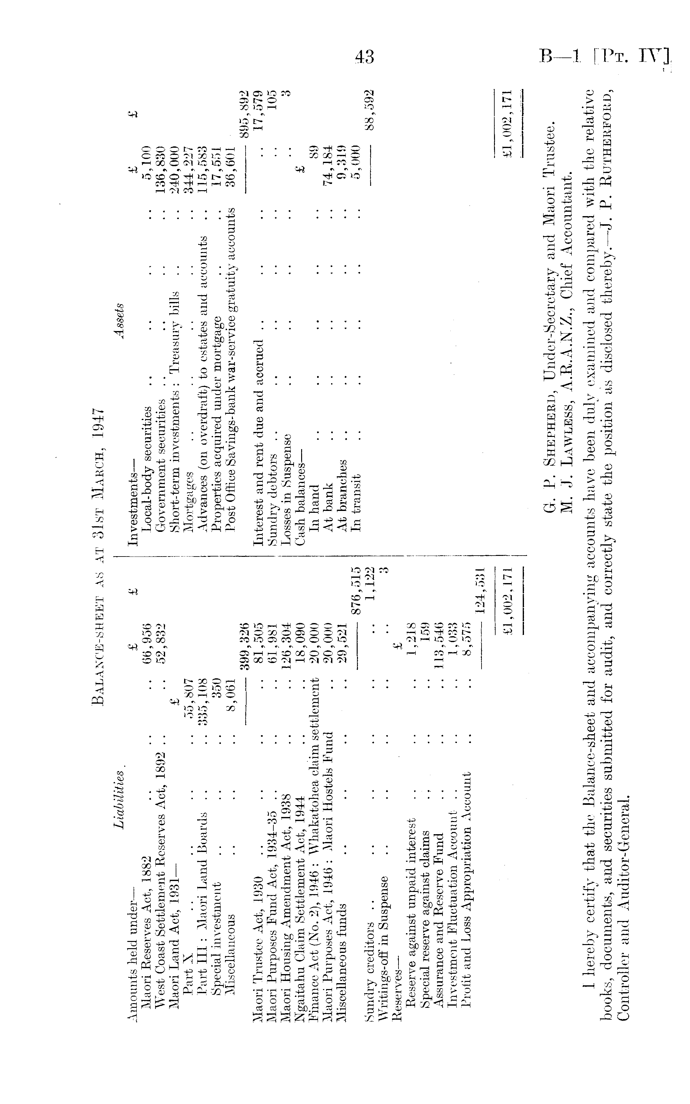 Balance-sheet as at 31st March, 1947 Liabilities, Assets Amounts held under— £ £ Investments— £ £ Maori Reserves Act, 1882 .. .. .. 66,956 Local-body securities .. .. .. .. 5,100 West Coast Settlement Reserves Act, 1892 .. .. 52,832 Government securities .. .. .. .. 136,830 Maori Land Act, 1931— £ Short-term investments: Treasury bills .. .. 240,000 Part X .. .. .. .. 55,807 Mortgages .. .. .. .. .. 344,227 Part III: Maori Land Boards .. .. 335,108 Advances (on overdraft) to estates and accounts .. 115,583 Special investment .. .. .. 350 Properties acquired under mortgage .. .. 17,551 Miscellaneous .. .. .. 8,061 Post Office Savings-bank war-service gratuity accounts 36,601 399,326 895,892 Maori Trustee Act, 1930 .. .. .. .. 81,505 Interest and rent due and accrued .. .. .. .. 17,579 Maori Purposes Fund Act, 1934-35 .. .. .. 61,981 Sundry debtors .. .. .. .. .. .. 105 Maori Housing Amendment Act, 1938 .. .. 126,304 Losses in Suspense .. .. .. .. .. 3 Ngaitahu Claim Settlement Act, 1944 .. .. 18,090 Cash balances— £ Finance Act (No. 2), 1946: Whakatohea claim settlement 20,000 In hand .. .. .. .. .. 89 Maori Purposes Act, 1946: Maori Hostels Fund .. 20,000 At bank .. .. .. .. .. 74,184 Miscellaneous funds .. .. - .. .. 29,521 At branches .. .. .. .. .. 9,319 ■ 876,515 In transit .. .. .. .. .. 5,000 Sundry creditors .. .. .. .. .. .. 1,122 88,592 Writings-off in Suspense .. .. .. .. .. 3 Reserves— £ Reserve against unpaid interest . . .. .. 1,218 Special reserve against claims .. .. .. 159 Assurance and Reserve Fund .. .. .. 113,546 Investment Fluctuation Account .. .. .. 1,033 : Profit and Loss Appropriation Account .. ..8,575 124,531 £1,002,171 £1,002,171 G. P. Shepherd, Under-Secretary and Maori Trustee. M. J. Lawless, A.R. A.N. Z., Chief Accountant. I hereby certify that the Balance-sheet and accompanying accounts have been duly examined and compared with the relative books, documents, and securities submitted for audit, and correctly state the position as disclosed thereby.— J. P. Rutherford, Controller and Auditor-General.