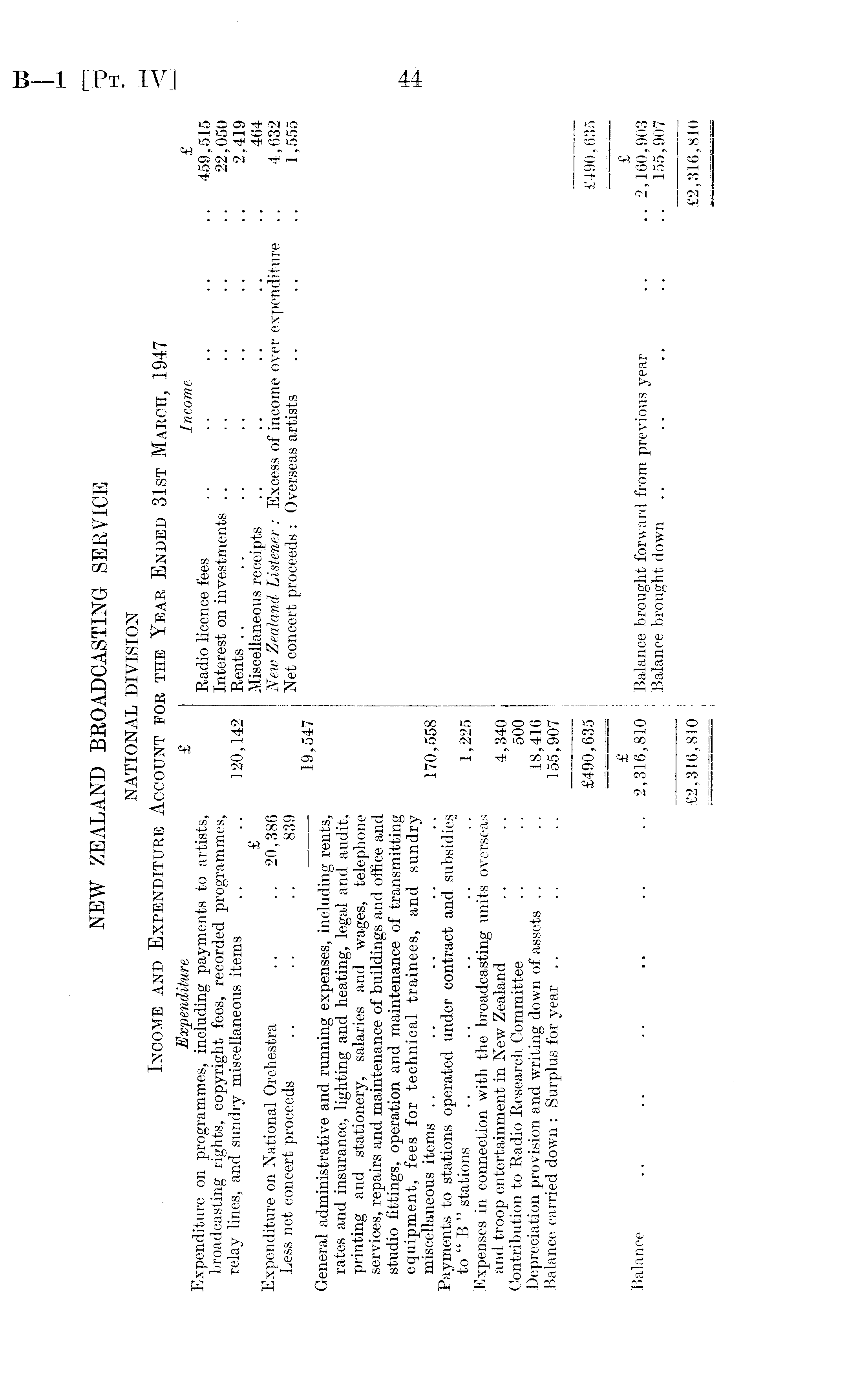 NEW ZEALAND BROADCASTING SERVICE NATIONAL DIVISION Income and Expenditure Account for the Year Ended 31st March, 1947 . Expenditure £ Income £ Expenditure on programmes, including payments to artists, Radio licence fees .. .. .. .. .. 459,515 broadcasting rights, copyright fees, recorded programmes, Interest on investments .. .. .. .. .. relay lines, and sundry miscellaneous items .. .. 120,142 Rents .. .. .. .. .. .. .. 2,419 _ £ Miscellaneous receipts .. .. .. .. .. 464 Expenditure on National Orchestra .. .. 20,386 New Zealand Listener: Excess of income over expenditure .. 4,632 Less net concert proceeds .. .. .. 839 Net concert proceeds: Overseas artists .. .. .. 1,555 19,547 General administrative and running expenses, including rents, rates and insurance, lighting and heating, legal and audit, printing and stationery, salaries and wages, telephone services, repairs and maintenance of buildings and office and studio fittings, operation and maintenance of transmitting equipment, fees for technical trainees, and sundry miscellaneous items .. .. .. .. .. 170,558 Payments to stations operated under contract and subsidies to " B" stations .. .. .. .. .. 1,225 Expenses in connection with the broadcasting units overseas and troop entertainment in New Zealand .. .. 4,340 Contribution to Radio Research Committee .. .. 500 Depreciation provision and writing down of assets .. . . 18,416 Balance carried down: Surplus for year .. .. .. 155,907 £490,635 £490,635 £ £ Balance .. .. .. .. .. .. 2,316,810 Balance brought forward from previous year .. .. 2,160,903 Balance brought down .. .. .. .. .. 155,907 £2,316,810 £2,316,810
