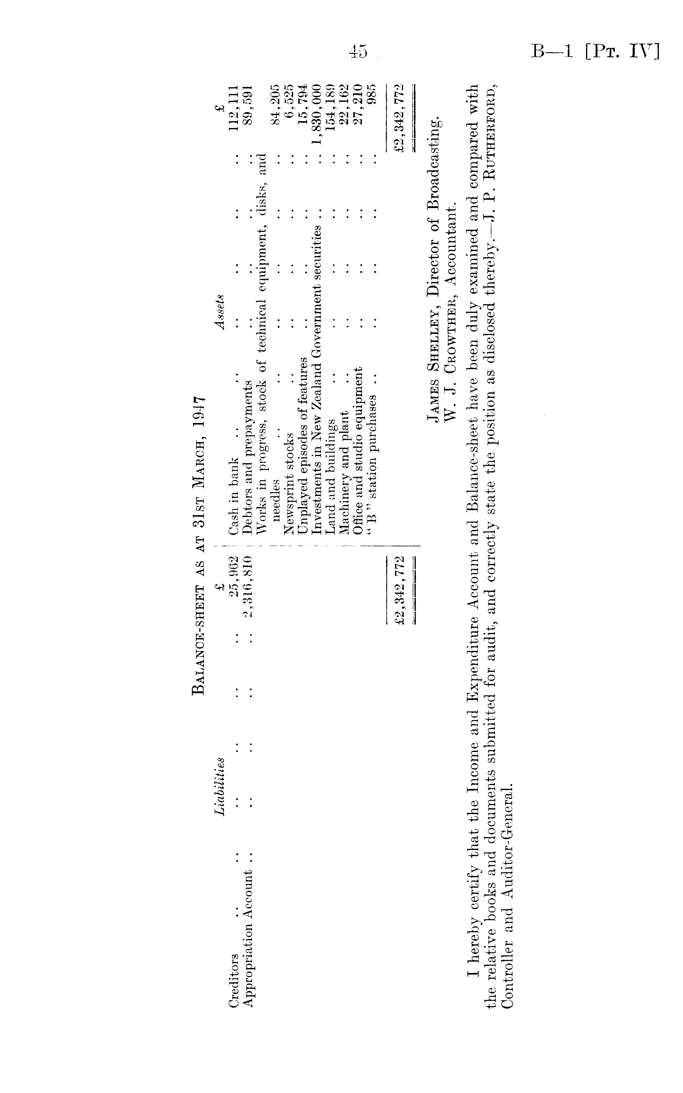 Balance-sheet as at 31st March, 1947 Liabilities £ Assets £ Creditors .. .. .. .. .. .. 25,962 Cash in bank .. .. .. .. .. .. 112,111 Appropriation Account .. .. .. .. .. 2,316,810 Debtors and prepayments .. .. .. .. 89,591 Works in progress, stock of technical equipment, disks, and needles .. .. .. .. .. .. 84,205 Newsprint stocks .. .. .. .. .. 6,525 Unplayed episodes of features .. .. .. .. 15,794 Investments in New Zealand Government securities .. .. 1,830,000 Land and buildings .. .. .. .. .. 154,189 Machinery and plant .. ~ .. .. .. 22,162 Office and studio equipment .. .. .. .. 27,210 " B " station purchases .. .. .. .. .. 985 £2,342,772 £2,342,772 James Shelley, Director of Broadcasting. W. J. Crowther, Accountant. I hereby certify that the Income and Expenditure Account and Balance-sheet have been duly examined and compared with the relative books and documents submitted for audit, and correctly state the position as disclosed thereby.— J. P. Rutherford, Controller and Auditor-General.