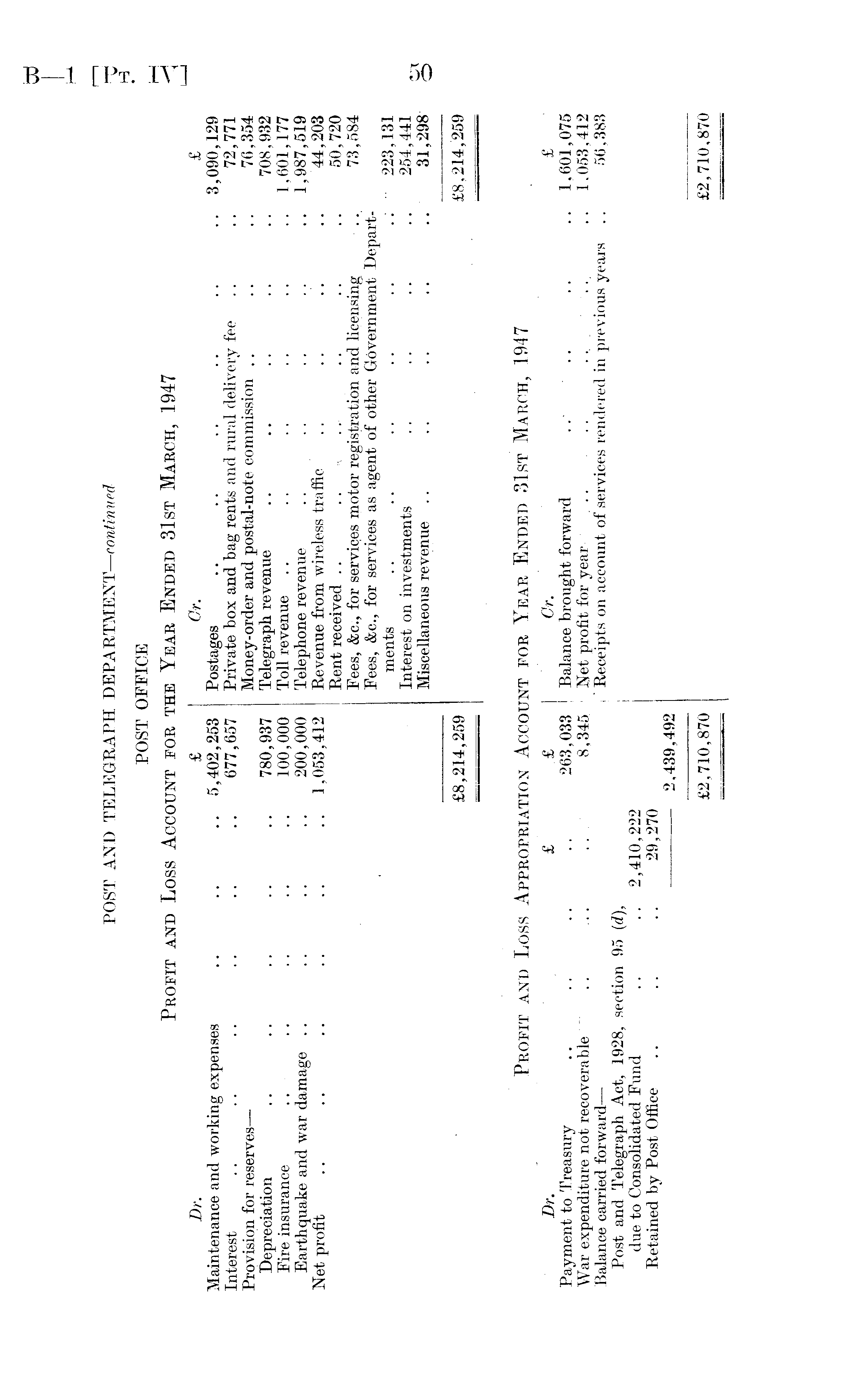 POST AND TELEGRAPH DEPARTMENT— continued POST OFFICE Profit and Loss Account for the Year Ended 31st March, 1947 Dr. £ Or. £ Maintenance and working expenses .. .. .. 5,402,253 Postages .. .. .. .. .. .. 3,090,129 Interest .. .. .. .. .. .. 677,657 Private box and bag rents and rural delivery fee .. .. 72,771 Provision for reserves— Money-order and postal-note commission .. .. .. 76,354 Depreciation .. .. .. .. .. 780,937 Telegraph revenue .. .. .. .. .. 708,932 Fire insurance .. .. .. .. .. 100,000 Toll revenue .. .. .. .. .. .. 1,601,177 Earthquake and war damage .. .. .. .. 200,000 Telephone revenue .. .. .. .. .. 1,987,519 Net profit .. .. .. .. .. .. 1,053,412 Revenue from wireless traffic .. .. .'. .. 44,203 Rent received .. .. ... .. .. .. 50,720 Fees, &c., for services motor registration and licensing .. 73,584 Fees, &c., for services as agent of other Government Departments .. .. .. .. .. .. 223,131 Interest on investments .. .. .. .. 254 ,441 Miscellaneous revenue .. .. .. .. .. 31,298 £8,214,259 £8,214,259 Profit and Loss Appropriation Account for Year Ended 31st March, 1947 Dr. £ ,£ I Cr. £ Payment to Treasury .. .. .. 263,033 Balance brought forward .. .. .. .. 1,601,075 War expenditure not recoverable " .. ... .... 8,345 I Net profit for year : ... .. .. 1,053,412 Balance carried forward— i" Receipts on account of services rendered in previous years .. 56,383 Post and Telegraph Act, 1928, section 95 (d), due to Consolidated Fund .. .. 2,410,222 Retained by Post Office .. .. .. 29,270 2,439,492 £2,710,870 £2,710,870