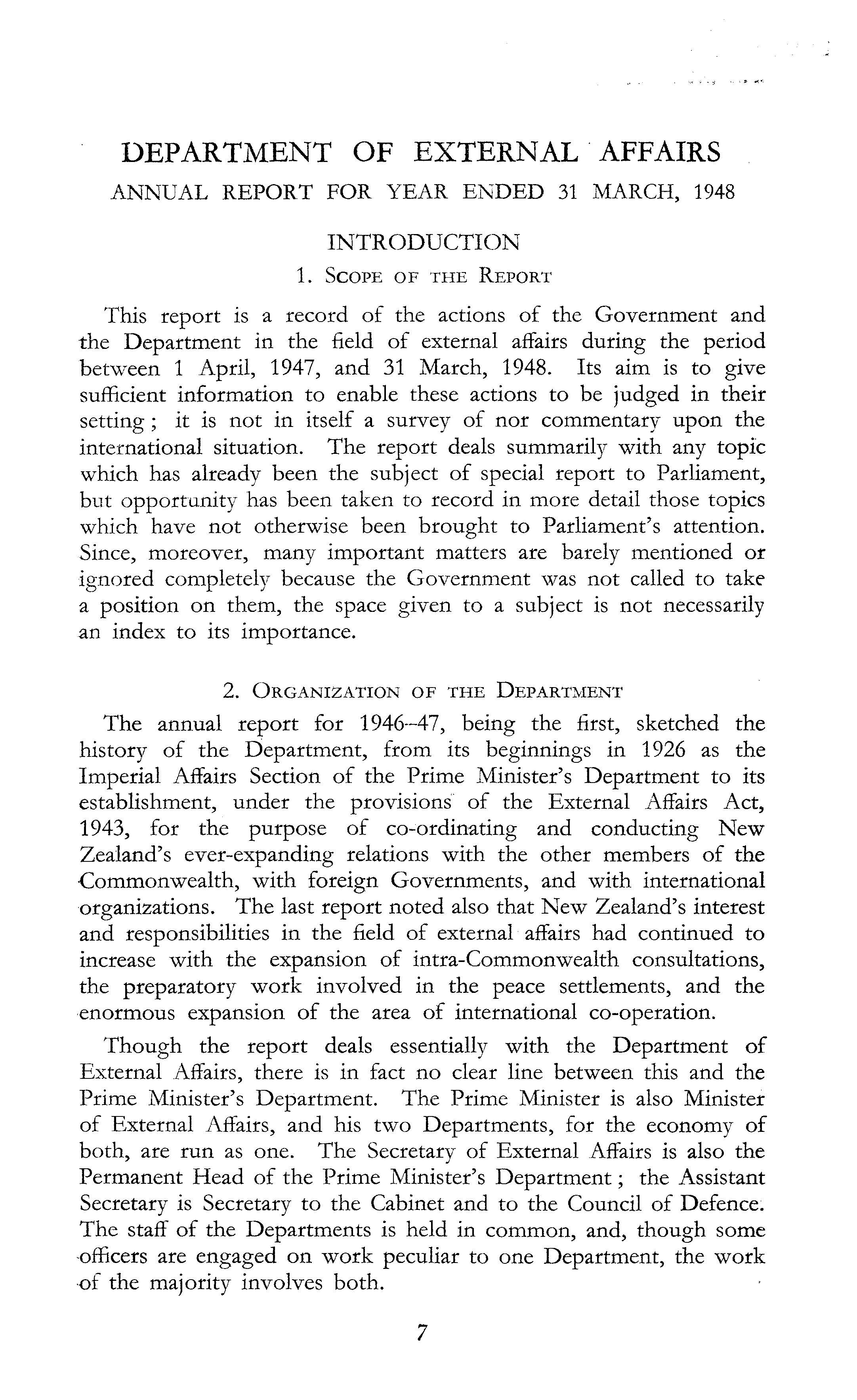 DEPARTMENT OF EXTERNAL AFFAIRS ANNUAL REPORT FOR YEAR ENDED 31 MARCH, 1948 INTRODUCTION 1. Scope of the Report This report is a record of the actions of the Government and the Department in the field of external affairs during the period between 1 April, 1947, and 31 March, 1948. Its aim is to give sufficient information to enable these actions to be judged in their setting; it is not in itself a survey of nor commentary upon the international situation. The report deals summarily with any topic which has already been the subject of special report to Parliament, but opportunity has been taken to record in more detail those topics which have not otherwise been brought to Parliament's attention. Since, moreover, many important matters are barely mentioned or ignored completely because the Government was not called to take a position on them, the space given to a subject is not necessarily an index to its importance. 2. Organization of the Department The annual report for 1946-47, being the first, sketched the history of the Department, from its beginnings in 1926 as the Imperial Affairs Section of the Prime Minister's Department to its establishment, under the provisions" of the External Affairs Act, 1943, for the purpose of co-ordinating and conducting New Zealand's ever-expanding relations with the other members of the ■Commonwealth, with foreign Governments, and with international organizations. The last report noted also that New Zealand's interest and responsibilities in the field of external affairs had continued to increase with the expansion of intra-Commonwealth consultations, the preparatory work involved in the peace settlements, and the enormous expansion of the area of international co-operation. Though the report deals essentially with the Department of External Affairs, there is in fact no clear line between this and the Prime Minister's Department. The Prime Minister is also Minister of External Affairs, and his two Departments, for the economy of both, are run as one. The Secretary of External Affairs is also the Permanent Head of the Prime Minister's Department; the Assistant Secretary is Secretary to the Cabinet and to the Council of Defence. The staff of the Departments is held in common, and, though some -officers are engaged on work peculiar to one Department, the work -of the majority involves both.