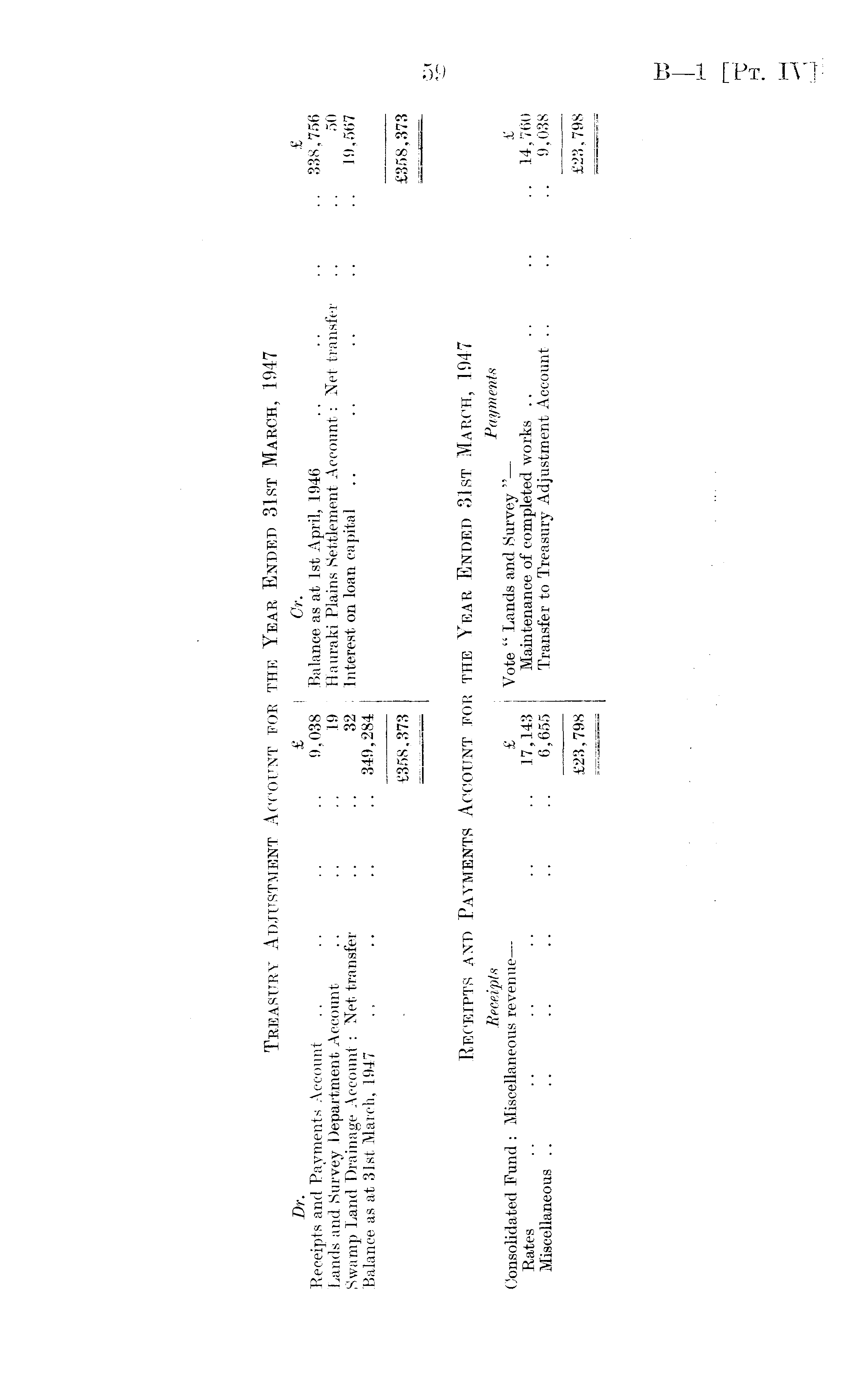 Treasury Adjustment Account for the Year Ended 31st March, 1947 Dr. £ I Cr. £ Receipts and Payments Account .. .. .. .. 9,038 j Balance as at Ist April, 1946 .. .. .. .. 338,756 Lands and Survey Department Account .. .. .. 19 I Hauraki Plains Settlement Account: Net transfer .. .. 50 Swamp Land Drainage Account : Net. transfer .. .. 32 Interest on loan capital .. .. .. .. .. 19,567 Balance as at 31st March, 1947 .. .. .. .. 349,284 £358,373 £358,373 Receipts and Payments Account for the Year Ended 31st March, 1947 Receipts Payments Consolidated Fund : Miscellaneous revenue— £ Vote " Lands and Survey " £ Rates .. .. .. .. .. .. 17,143 Maintenance of completed works .. .. .. .. 14,760 Miscellaneous .. .. .. .. .. .. 6,655 Transfer to Treasury Adjustment Account .. .. .. 9,038 £23,798 £23,798