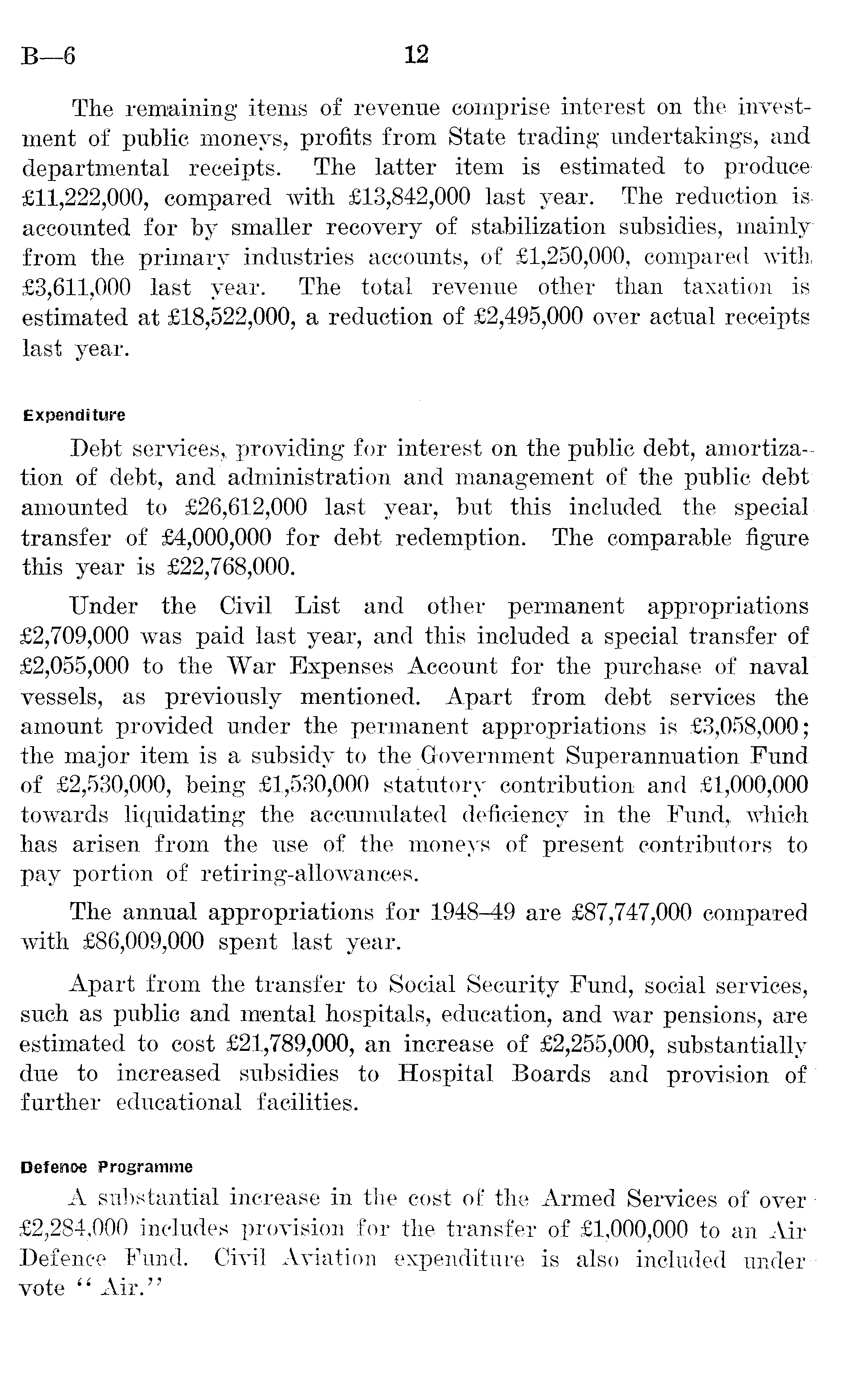 The remaining items of revenue comprise interest on the investment of public moneys, profits from State trading undertakings, and departmental receipts. The latter item is estimated to produce £11,222,000, compared with £13,842,000 last year. The reduction is accounted for by smaller recovery of stabilization subsidies, mainly from the primary industries accounts, of £1,250,000, compared with £3,611,000 last year. The total revenue other than taxation is estimated at £18,522,000, a reduction of £2,495,000 over actual receipts last year. Expenditure Debt services,, providing for interest on the public debt, amortization of debt, and administration and management of the public debt amounted to £26,612,000 last year, but this included the special transfer of £4,000,000 for debt redemption. The comparable figure this year is £22,768,000. Under the Civil List and other permanent appropriations £2,709,000 was paid last year, and this included a special transfer of £2,055,000 to the War Expenses Account for the purchase of naval vessels, as previously mentioned. Apart from debt services the amount provided under the permanent appropriations is £3,058,000; the major item is a subsidy to the Government Superannuation Fund of £2,530,000, being £1,530,000 statutory contribution and £1,000,000 towards liquidating the accumulated deficiency in the Fund, which has arisen from the use of the moneys of present contributors to pay portion of retiring-allowances. The annual appropriations for are £87,747,000 compared with £86,009,000 spent last year. Apart from the transfer to Social Security Fund, social services, such as public and mental hospitals, education, and war pensions, are estimated to cost £21,789,000, an increase of £2,255,000, substantially due to increased subsidies to Hospital Boards and provision of further educational facilities. Defenoe Programme A substantial increase in the cost of the Armed Services of over £2,284,000 includes provision for the transfer of £1,000,000 to an Air Defence Fund. Civil Aviation expenditure is also included under - vote " Air."