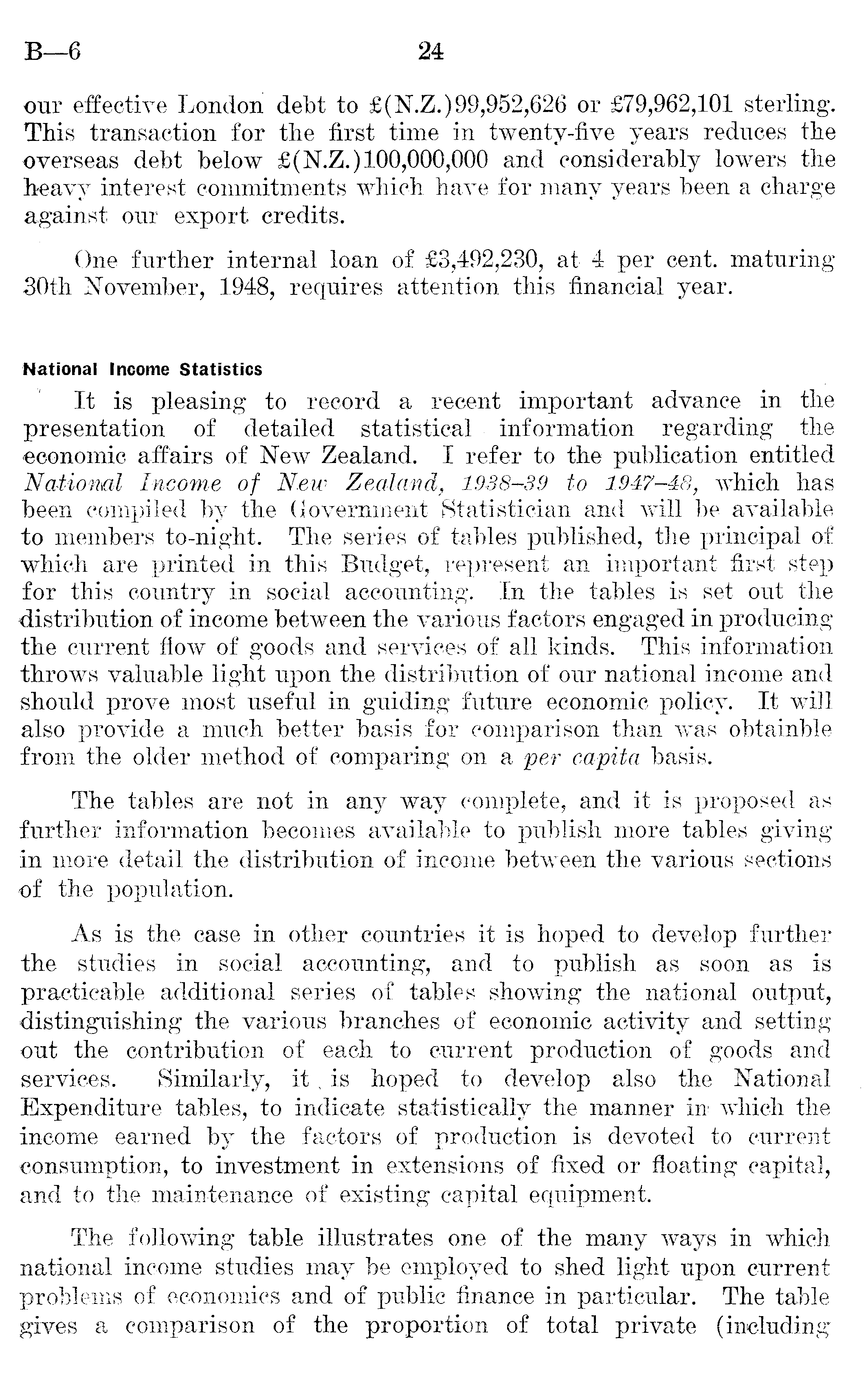 our effective London debt to £(N.Z.)99,952,626 or £79,962,101 sterling. This transaction for the first time in twenty-five years reduces the overseas debt below £(N.Z.) 100,000,000 and considerably lowers the heavy interest commitments which have for many years been a charge against our export credits. One further internal loan of £3,492,230, at 4 per cent, maturing 30th November, 1948, requires attention this financial year. National Income Statistics It is pleasing to record a recent important advance in the presentation of detailed statistical information regarding the economic affairs of New Zealand. I refer to the publication entitled National Income of New Zealand, 1938-39 to 1947-48, which has been compiled by the Government Statistician and will be available to members to-night. The series of tables published, the principal of which are printed in this Budget, represent an important first step for this country in social accounting. In the tables is set out the distribution of income between the various factors engaged in producing the current flow of goods and services of all kinds. This information throws valuable light upon the distribution of our national income and should prove most useful in guiding future economic policy. It will also provide a much better basis for comparison than was obtainble from the older method of comparing on a per capita basis. The tables are not in any way complete, and it is proposed as further information becomes available to publish more tables giving in more detail the distribution of income between the various sections of the population. As is the case in other countries it is hoped to develop further the studies in social accounting, and to publish as soon as is practicable additional series of tables showing the national output, distinguishing the various branches of economic activity and setting out the contribution of each to current production of goods and services. Similarly, it ,is hoped to develop also the National Expenditure tables, to indicate statistically the manner in which the income earned by the factors of production is devoted to current consumption, to investment in extensions of fixed or floating capital, and to the maintenance of existing capital equipment. The following table illustrates one of the many ways in which national income studies may be employed to shed light upon current problems of economics and of public finance in particular. The table gives a comparison of the proportion of total private (including