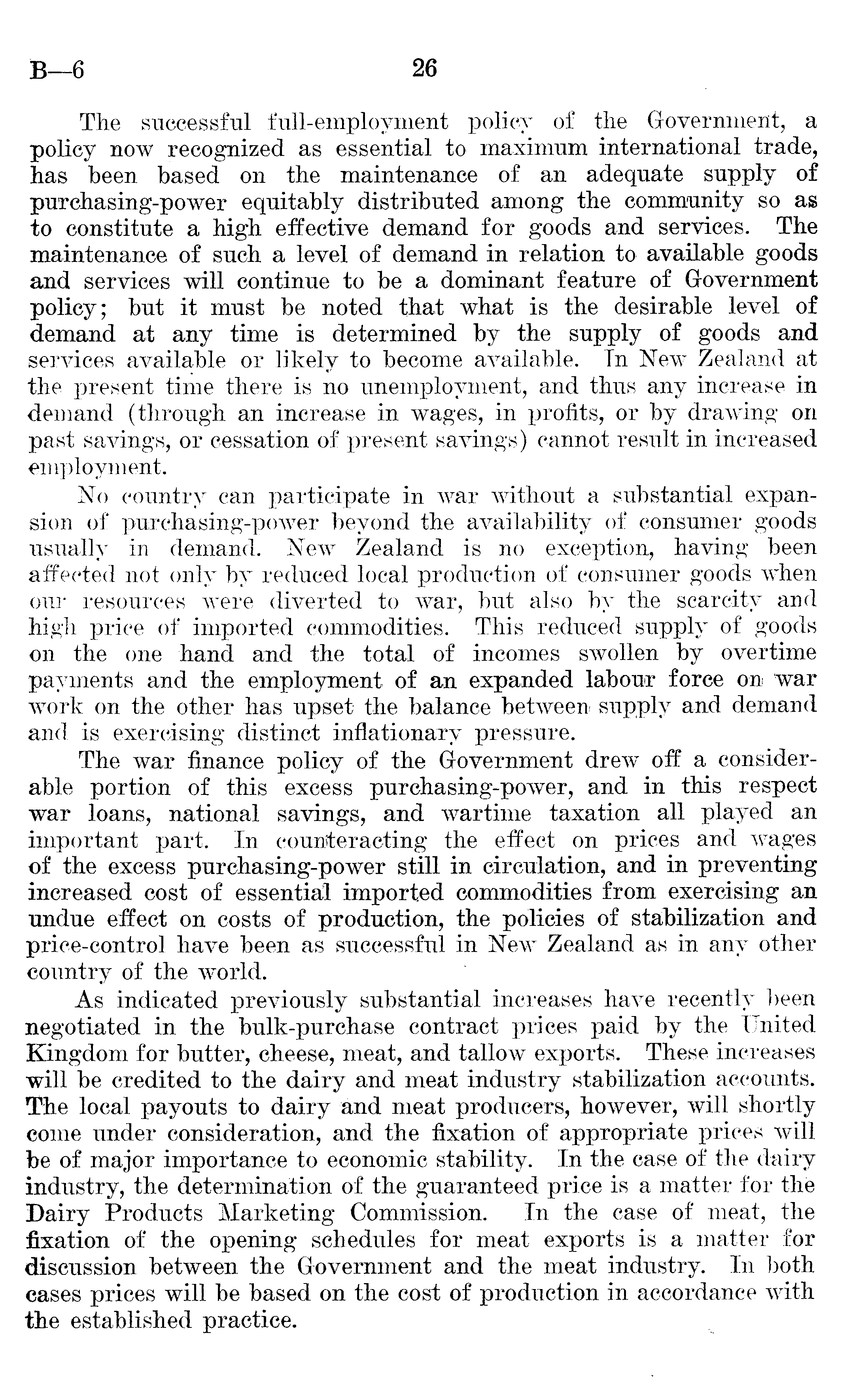 The successful full-employment policy of the Government, a policy now recognized as essential to maximum international trade, has been based on the maintenance of an adequate supply of purchasing-power equitably distributed among the community so as to constitute a high effective demand for goods and services. The maintenance of such a level of demand in relation to available goods and services will continue to be a dominant feature of Government policy; but it must be noted that what is the desirable level of demand at any time is determined by the supply of goods and services available or likely to become available. Tn New Zealand at the present time there is no unemployment, and thus any increase in demand (through an increase in wages, in profits, or by drawing on past savings, or cessation of present savings) cannot result in increased employment. No country can participate in war without a substantial expansion of purchasing-power beyond the availability of consumer goods usually in demand. New Zealand is no exception, having been affected not only by reduced local production of consumer goods when our resources were diverted to war, but also by the scarcity and high price of imported commodities. This reduced supply of goods on the one hand and the total of incomes swollen by overtime payments and the employment of an expanded labour force on war work on the other has upset the balance between- supply and demand and is exercising distinct inflationary pressure. The war finance policy of the Government drew off a considerable portion of this excess purchasing-power, and in this respect war loans, national savings, and wartime taxation all played an important part. In counteracting the effect on prices and wages of the excess purchasing-power still in circulation, and in preventing increased cost of essential imported commodities from exercising an undue effect on costs of production, the policies of stabilization and price-control have been as successful in New Zealand as in any other country of the world. As indicated previously substantial increases have recently been negotiated in the bulk-purchase contract prices paid by the United Kingdom for butter, cheese, meat, and tallow exports. These increases will be credited to the dairy and meat industry stabilization accounts. The local payouts to dairy and meat producers, however, will shortly come under consideration, and the fixation of appropriate prices will be of major importance to economic stability. In the case of the dairy industry, the determination of the guaranteed price is a matter for the Dairy Products Marketing Commission. In the case of meat, the fixation of the opening schedules for meat exports is a matter for discussion between the Government and the meat industry. In both cases prices will be based on the cost of production in accordance with the established practice.