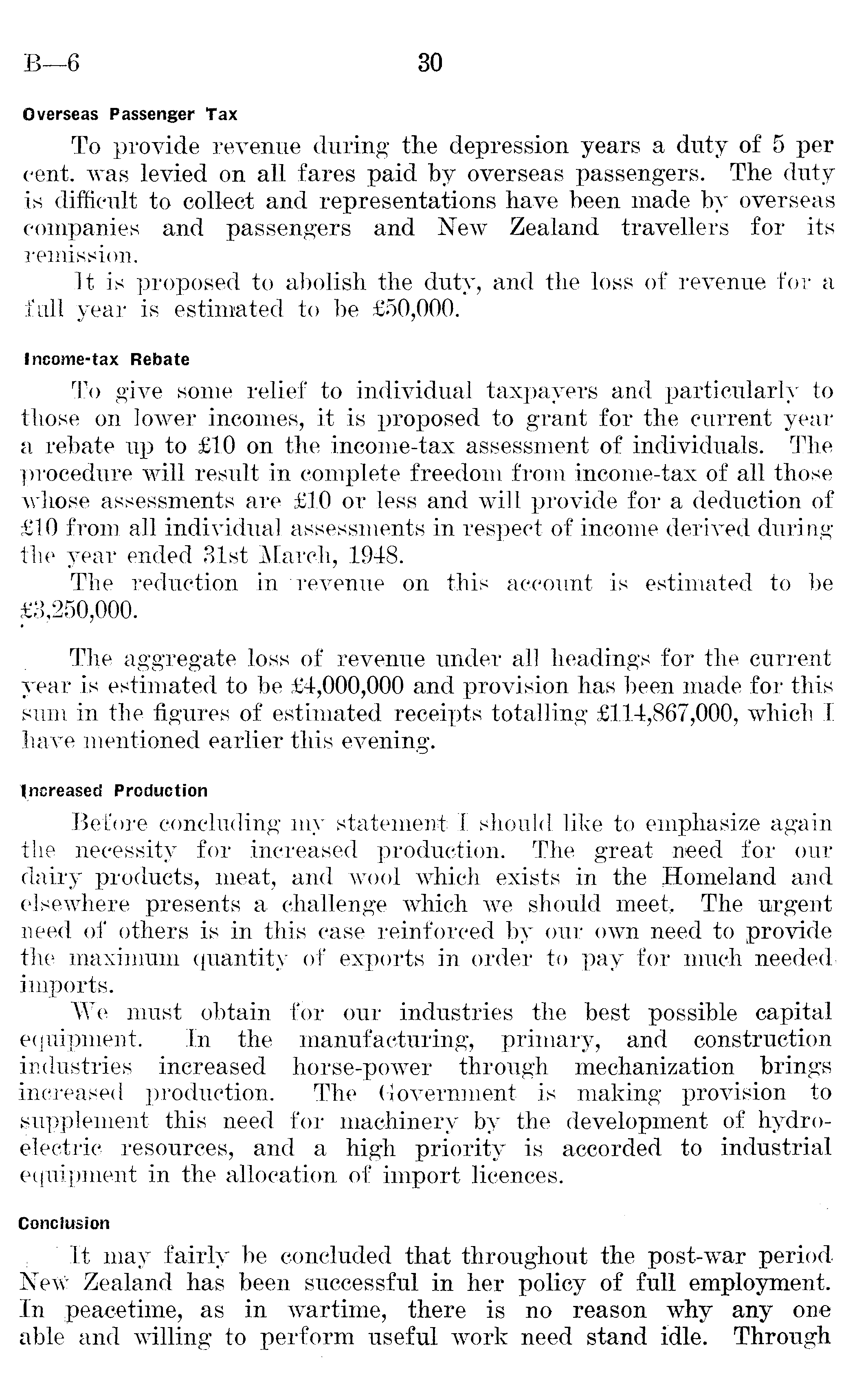 Overseas Passenger Tax To provide revenue during the depression years a duty of 5 per cent, was levied on all fares paid by overseas passengers. The duty is difficult to collect and representations have been made by overseas companies and passengers and New Zealand travellers for its remission. It is proposed to abolish the duty, and the loss of revenue for a full year is estimated to be £50,000. Income-tax Rebate To give some relief to individual taxpayers and particularly to those on lower incomes, it is proposed to grant for the current year a rebate up to £lO on the income-tax assessment of individuals. The procedure will result in complete freedom from income-tax of all those whose assessments are £lO or less and will provide for a deduction of £lO from all individual assessments in respect of income derived during the year ended 31st March, 1948. The reduction in revenue on this account is estimated to be £3,250,000. The aggregate loss of revenue under all headings for the current year is estimated to be £4,000,000 and provision has been made for this sum in the figures of estimated receipts totalling £114,867,000, which I have mentioned earlier this evening. Increased Production Before concluding my statement I should like to emphasize again the necessity for increased production. The great need for our dairy products, meat, and wool which exists in the Homeland and elsewhere presents a challenge which we should meet. The urgent need of others is in this case reinforced by our own need to provide the maximum quantity of exports in order to pay for much needed imports. We must obtain for our industries the best possible capital equipment. In the manufacturing, primary, and construction industries increased horse-power through mechanization brings increased production. The Government is making provision to supplement this need for machinery by the development of hydroelectric resources, and a high priority is accorded to industrial equipment in the allocation of import licences. Conclusion It may fairly be concluded that throughout the post-war period New Zealand has been successful in her policy of full employment. In peacetime, as in wartime, there is no reason why any one able and willing to perform useful work need stand idle. Through