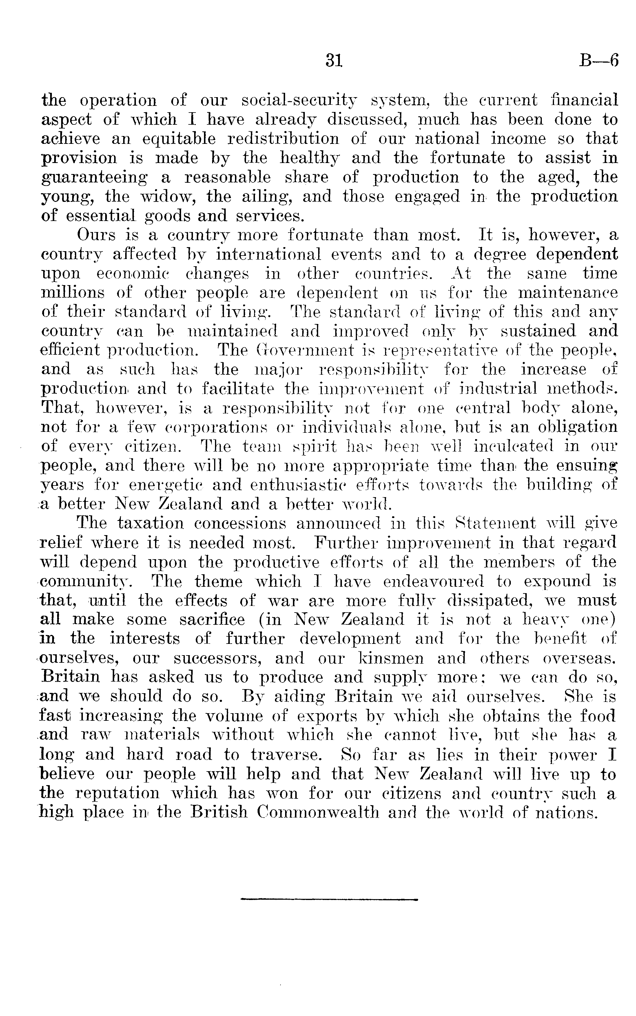 the operation of our social-security system, the current financial aspect of which I have already discussed, much has been done to achieve an equitable redistribution of our national income so that provision is made by the healthy and the fortunate to assist in guaranteeing a reasonable share of production to the aged, the young, the widow, the ailing, and those engaged in the production of essential goods and services. Ours is a country more fortunate than most. It is, however, a country affected by international events and to a degree dependent upon economic changes in other countries. At the same time millions of other people are dependent on us for the maintenance of their standard of living. The standard of living of this and any country can be maintained and improved only by sustained and efficient production. The Government is representative of the people, and as such has the major responsibility for the increase of production and to facilitate the improvement of industrial methods. That, however, is a responsibility not for one central body alone, not for a few corporations or individuals alone, but is an obligation of every citizen. The team spirit has been well inculcated in our people, and there will be no more appropriate time than the ensuing years for energetic and enthusiastic efforts towards the building of a better New Zealand and a better world. The taxation concessions announced in this Statement will give relief where it is needed most. Further improvement in that regard will depend upon the productive efforts of all the members of the community. The theme which I have endeavoured to expound is that, until the effects of war are more fully dissipated, Ave must all make some sacrifice (in New Zealand it is not a heavy one) in the interests of further development and for the benefit of -ourselves, our successors, and our kinsmen and others overseas. Britain has asked us to produce and supply more; we can do so, and we should do so. By aiding Britain Ave aid ourselves. She is fasti increasing the volume of exports by A\ T hich she obtains the food and raw materials without which she cannot live, but she has a long and hard road to traverse. So far as lies in their poAver I believe our people Avill help and that New Zealand Avill live up to the reputation which has Avon for our citizens and country such a high place in the British Commonwealth and the world of nations.