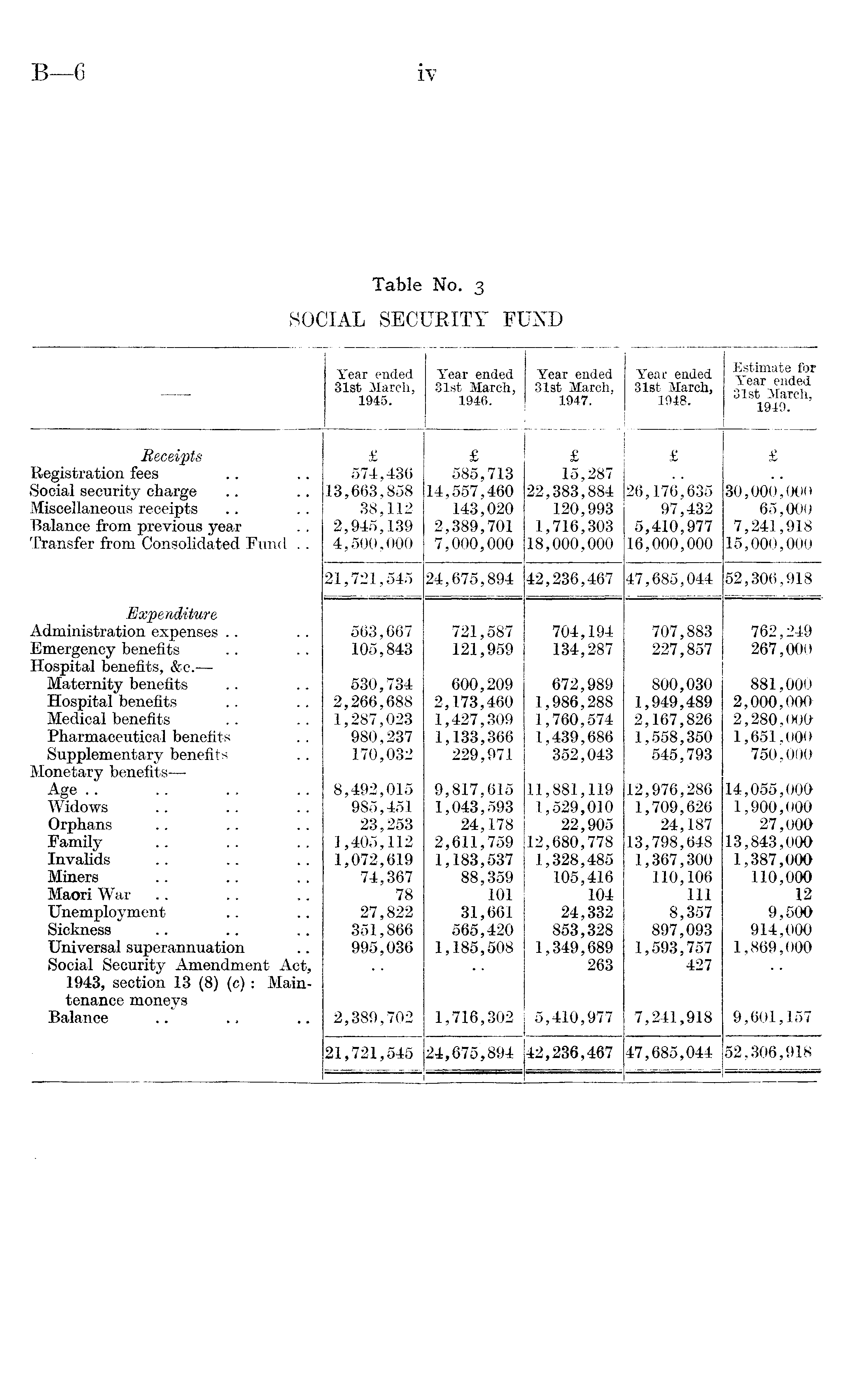 Year ended Year ended Year ended Year ended Estimate for Year ended 31st March, 1949. 31st March, 1945. 31st March, 1946. 31st March, 1947. 31st March, 1948. Receipts £ £ £ £ £ Registration fees 574,436 585,713 15,287 Social security charge .. 13,663,858 14,557,460 22,383,884 26,176,635 30,000 ', 000 Miscellaneous receipts 38,112 143,020 120,993 97,432 65,000 Balance from previous yea f .. 2,945,139 2,389,701 1,716,303 5,410,977 7,241,918 Transfer from Consolidatec [Fund .. 4,500,000 7,000,000 18,000,000 16,000,000 15,000,000 21,721,545 24,675,894 42,236,467 47,685,044 52,306,918 Expenditure Administration expenses . 563,667 721,587 704,194 707,883 762,249 Emergency benefits 105,843 121,959 134,287 227,857 267,000 Hospital benefits, &c.— Maternity benefits 530,734 600,209 672,989 800,030 881,000 Hospital benefits .. 2,266,688 2,173,460 1,986,288 1,949,489 2,000,000 Medical benefits .. 1,287,023 1,427,309 1,760,574 2,167,826 2,280,000 Pharmaceutical benefits 980,237 1,133,366 1,439,686 1,558,350 1,651,000 Supplementary benefits 170,032 229,971 352,043 545,793 750,000 Monetary benefits —■ Age .. 8,492,015 9,817,615 11,881,119 12,976,286 14,055,000 Widows 985,451 1,043,593 1,529,010 1,709,626 1,900,000 Orphans 23,253 24,178 22,905 24,187 27,000 Family .. 1,405,112 2,611,759 12,680,778 13,798,648 13,843,000 Invalids .. 1,072,619 1,183,537 1,328,485 1,367,300 1,387,000 Miners 74,367 88,359 105,416 110,106 110,000 Maori War 78 101 104 111 12 Unemployment 27,822 31,661 24,332 8,357 9,500 Sickness 351,866 565,420 853,328 897,093 914,000 Universal superannuatio a .. 995,036 1,185,508 1,349,689 1,593,757 1,869,000 Social Security Amendr aent Act, 263 427 1943, section 13 (8) (c ) : Maintenance moneys Balance .. 2,389,702 1,716,302 5,410,977 7,241,918 9,601,157 21,721,545 24,675,894 42,236,467 47,685,044 52,306,918
