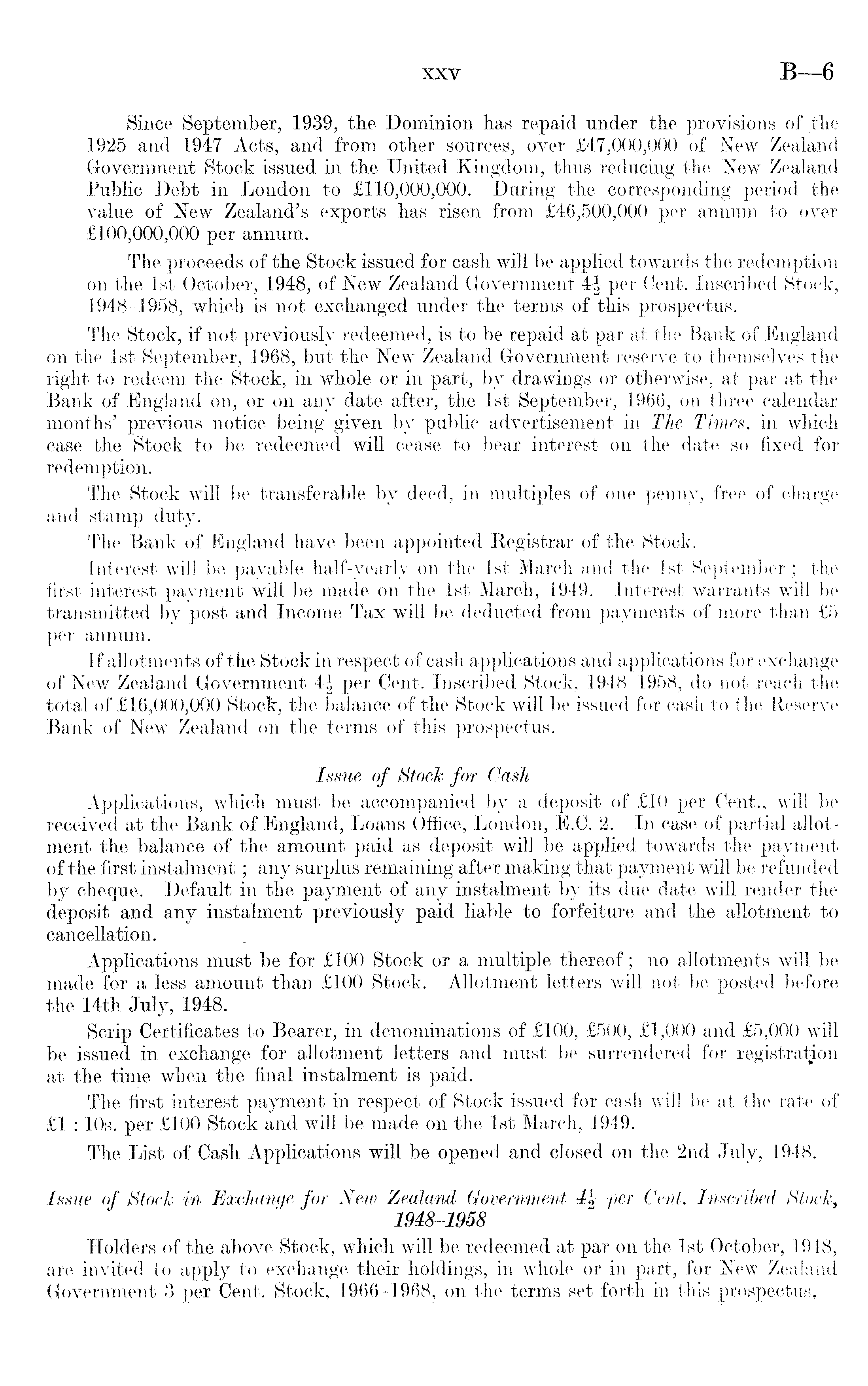 Since September, 1939, the Dominion has repaid under the provisions of the 1925 and 1947 Acts, and from other sources, over £47,000,000 of New Zealand Government Stock issued in the United Kingdom, thus reducing the New Zealand Public Debt in London to £110,000,000. During the corresponding period the value of New Zealand's exports has risen from £46,500,000 per annum to over £100,000,000 per annum. The proceeds of the Stock issued for cash will be applied towards the redemption on the Ist October, 1948, of New Zealand Government 4| per Cent. Inscribed Stock, 1948-1958, which is not exchanged under the terms of this prospectus. The Stock, if not previously redeemed, is to be repaid at par at the Bank of England on the Ist September, 1968, but the New Zealand Government reserve to themselves the right to redeem the Stock, in whole or in part, by drawings or otherwise, at par at tin l Bank of England on, or on any date after, the Ist September, 1966, on three calendar months' previous notice being given by public advertisement in The Times, in which case the Stock to be redeemed will cease to bear interest on the date so fixed for redemption. The Stock will be transferable by deed, in multiples of one penny, free of charge and stamp duty. The Bank of England have been appointed Eegistrar of the Stock. Interest will be payable half-yearly on the Ist March and the Ist September; the first interest payment will be made on the Ist March, 1949. Interest warrants will be transmitted by post and Income Tax will be deducted from payments of more than £5 per annum. If allotments of the Stock in respect of cash applications and applications for exchange of New Zealand Government 4| per Cent. Inscribed Stock, 1948 1958, do not reach the total of £16,000,000 Stock, the balance of the Stock will be issued for cash to the Reserve Bank of New Zealand on the terms of this prospectus. Issue of Stock for Cash Applications, which must be accompanied by a deposit of £lO per Cent., will be received at the Bank of England, Loans Office, London, E.C. 2. In case of partial allotment the balance of the amount paid as deposit will be applied towards the payment of the first instalment; any surplus remaining after making that payment will be refunded by cheque. Default in the payment of any instalment by its due date will render the deposit and any instalment previously paid liable to forfeiture and the allotment to cancellation. Applications must be for £lOO Stock or a multiple thereof; no allotments will be made for a less amount than £lOO Stock. Allotment letters will not be posted before the 14th July, 1948. Scrip Certificates to Bearer, in denominations of £lOO, £5OO, £l,OOO and £5,000 will be issued in exchange for allotment letters and must be surrendered for registration at the time when the final instalment is paid. The first interest payment in respect of Stock issued for cash will be at the rate of £1 : 10s. per £lOO Stock and will be made on the Ist March, 1949. The List of Cash Applications will be opened and closed on the 2nd July, 1948. Issue of Stock in Exchange for New Zealand Government 41? per Cent. Inscribed Stock, 1948-1958 Holders of the above Stock, which will be redeemed at par on the Ist October, 1948, are invited to apply to exchange their holdings, in whole or in part, for New Zealand Government 3 per Cent. Stock, 1966-1968, on the terms set forth in this prospectus.